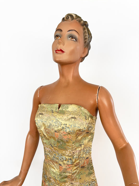 S/M | 1940s Asian Gold Brocade Strapless Dress With Pagoda And Blossom Motifs
