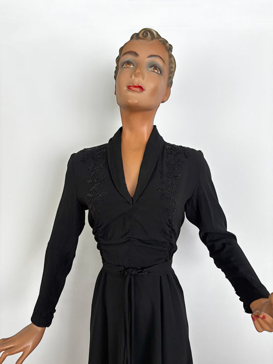 M/L | 1940s Black Crepe Beaded Evening Dress