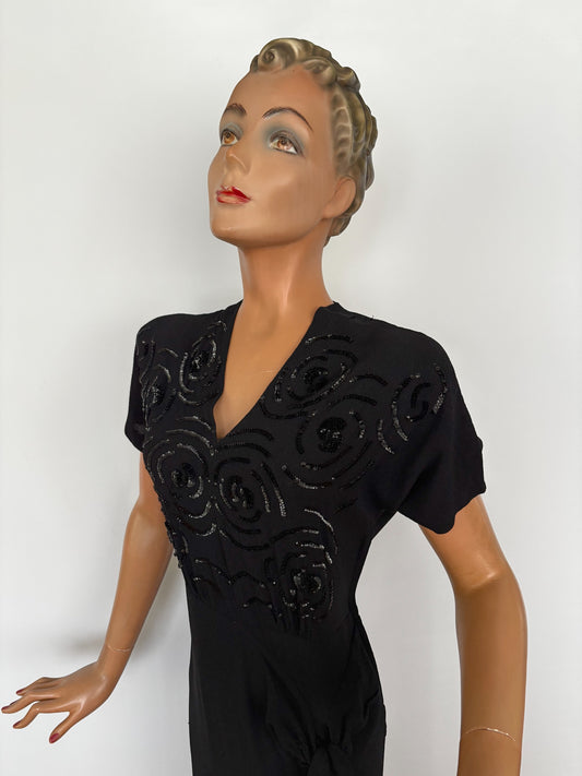 XS/S |1940s Symphony Black Crepe Dress With Gold Sequin Embroidery