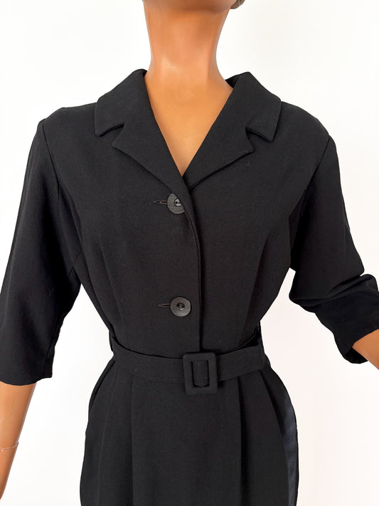 M | 1950s / 1960s Black Wool Dress by Saxia With Revere Collar
