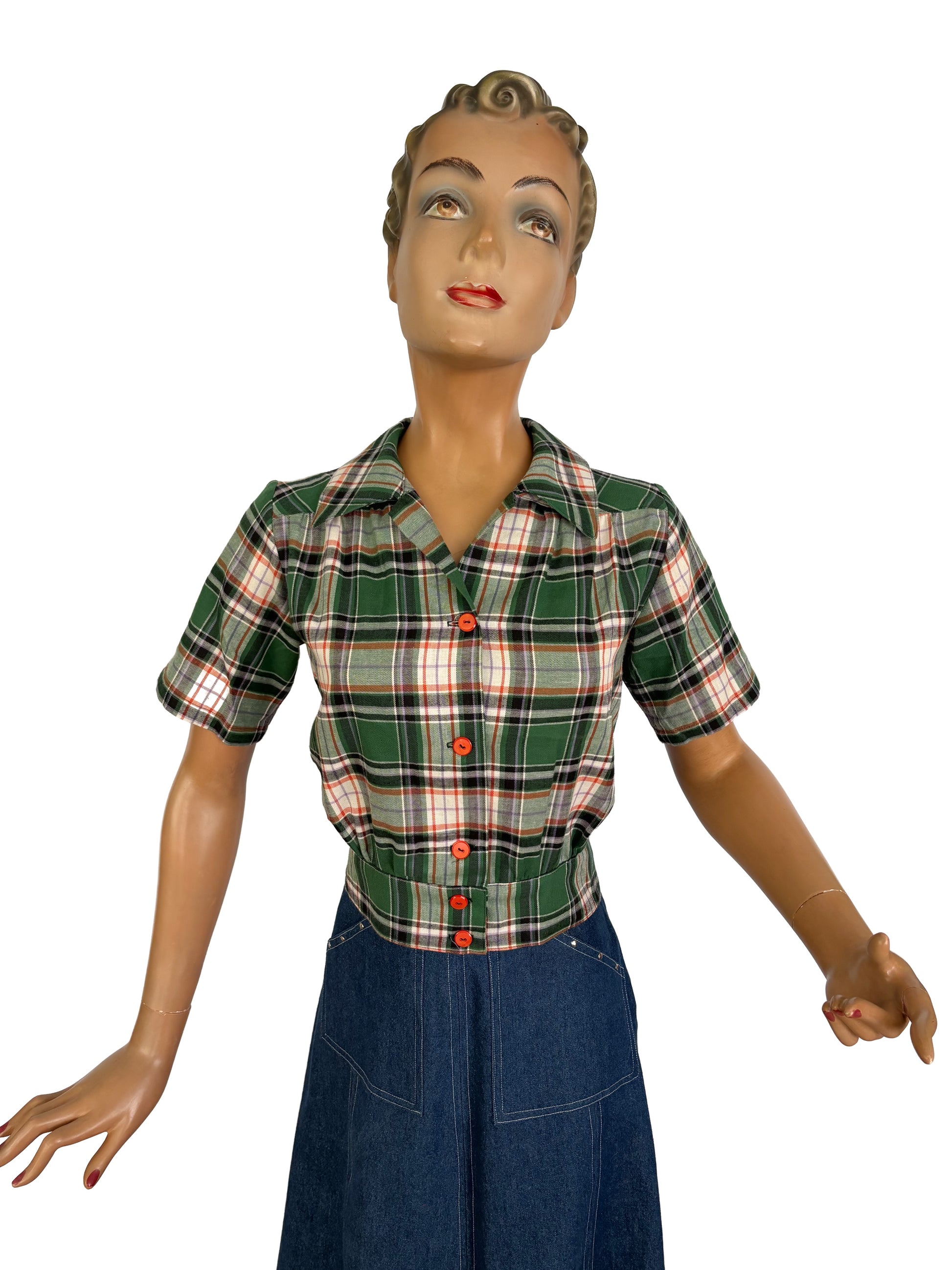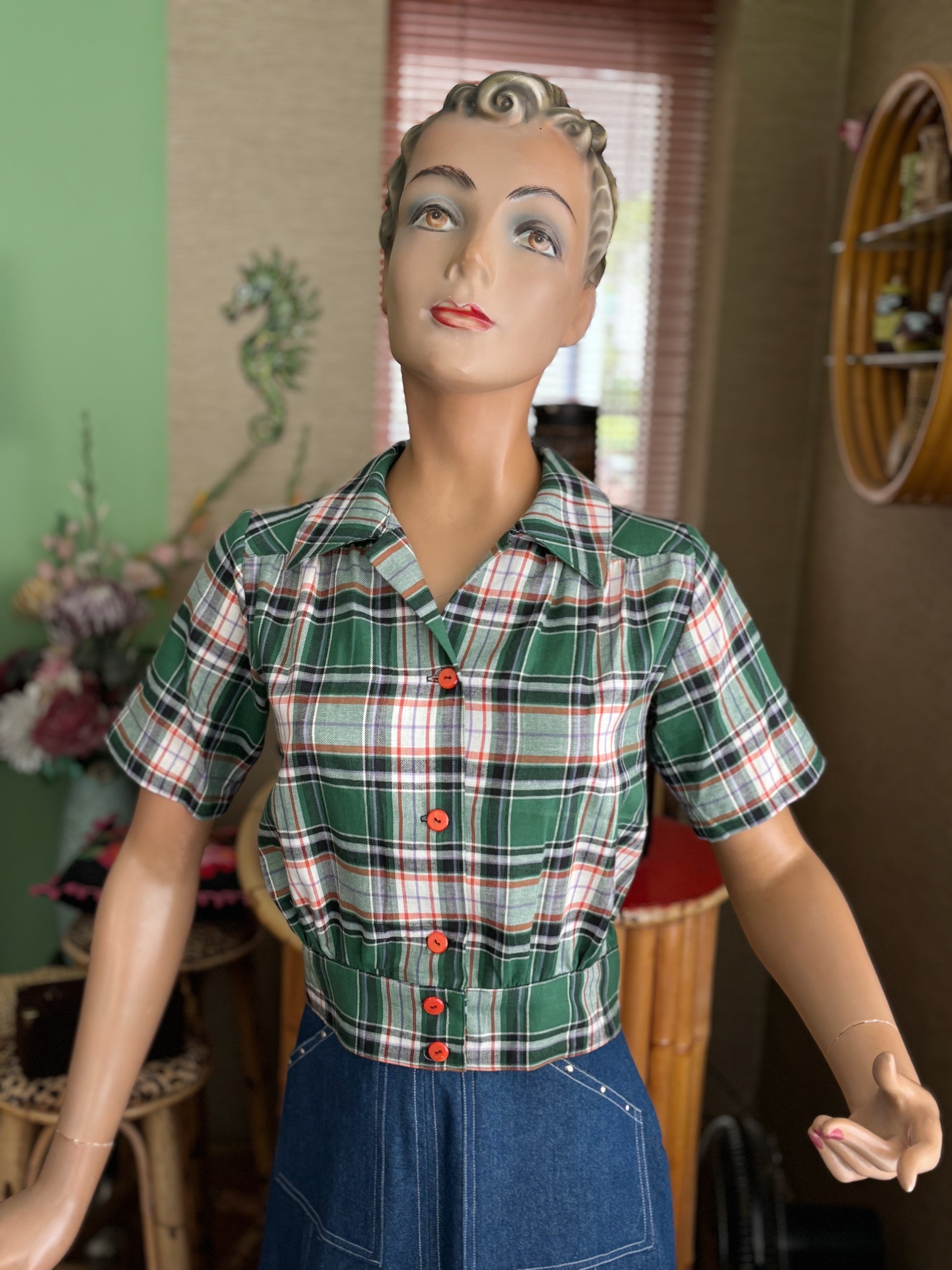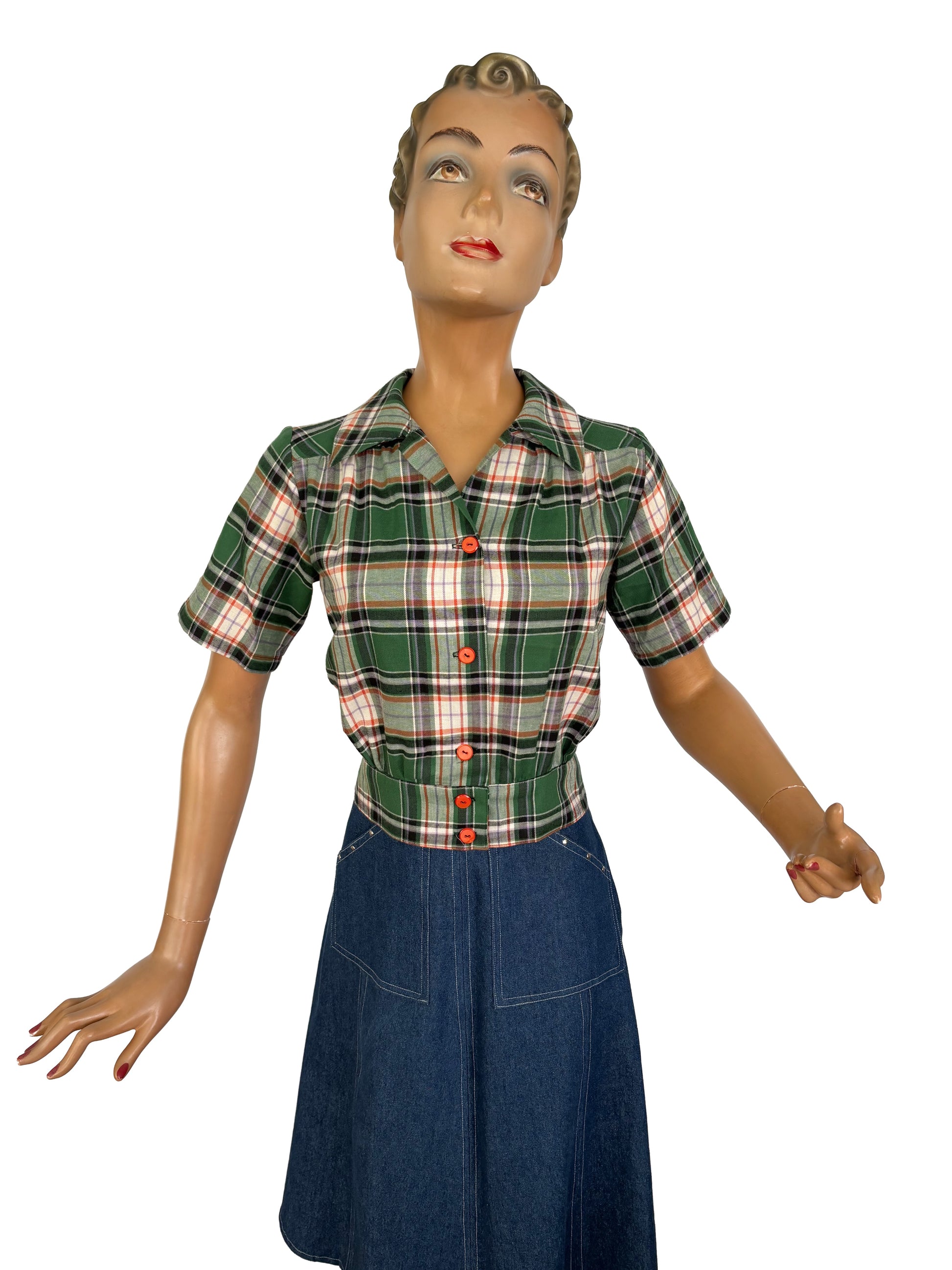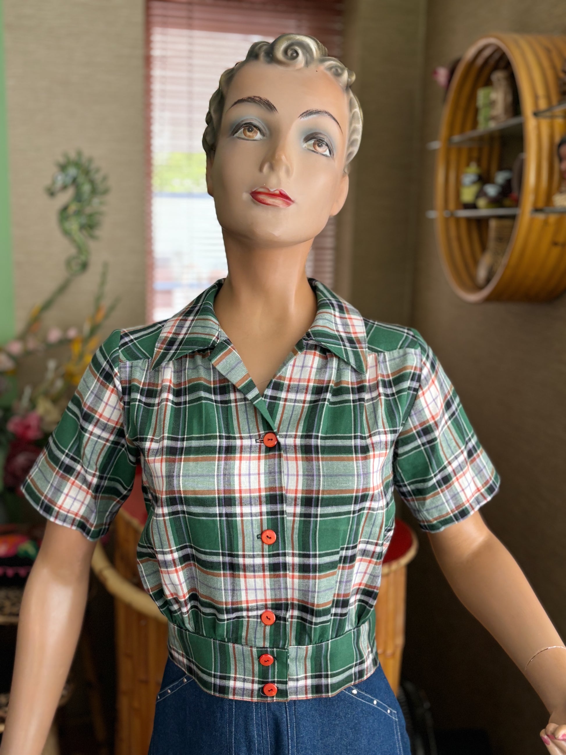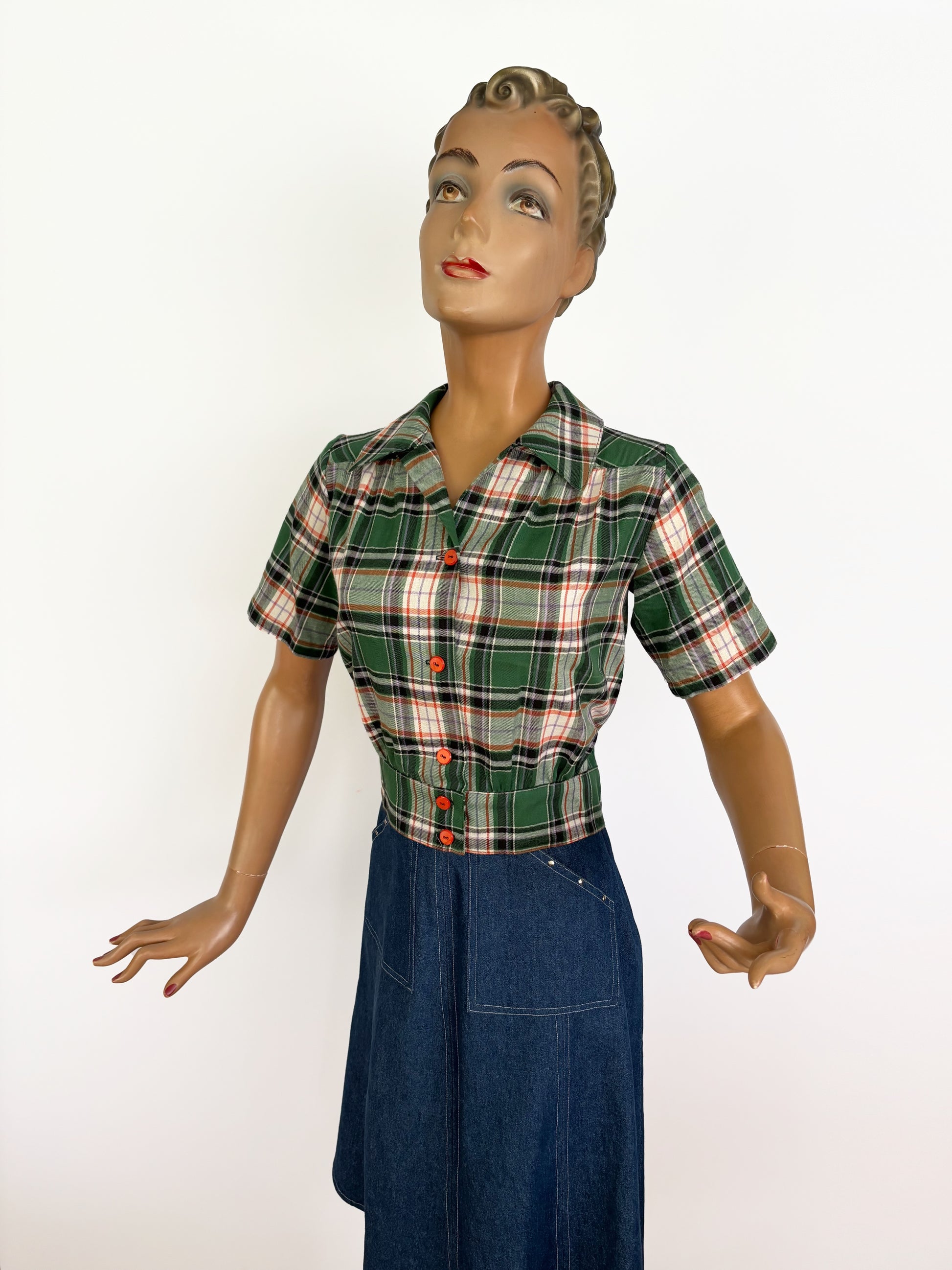 1940s style blouse in green and orange tartan, that looks perfect on your pencil skirt or slacks.