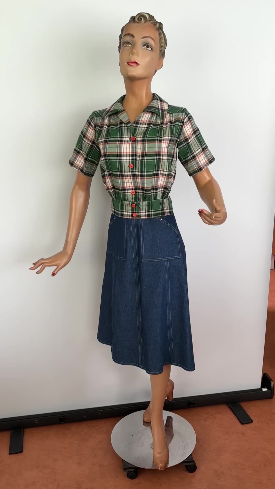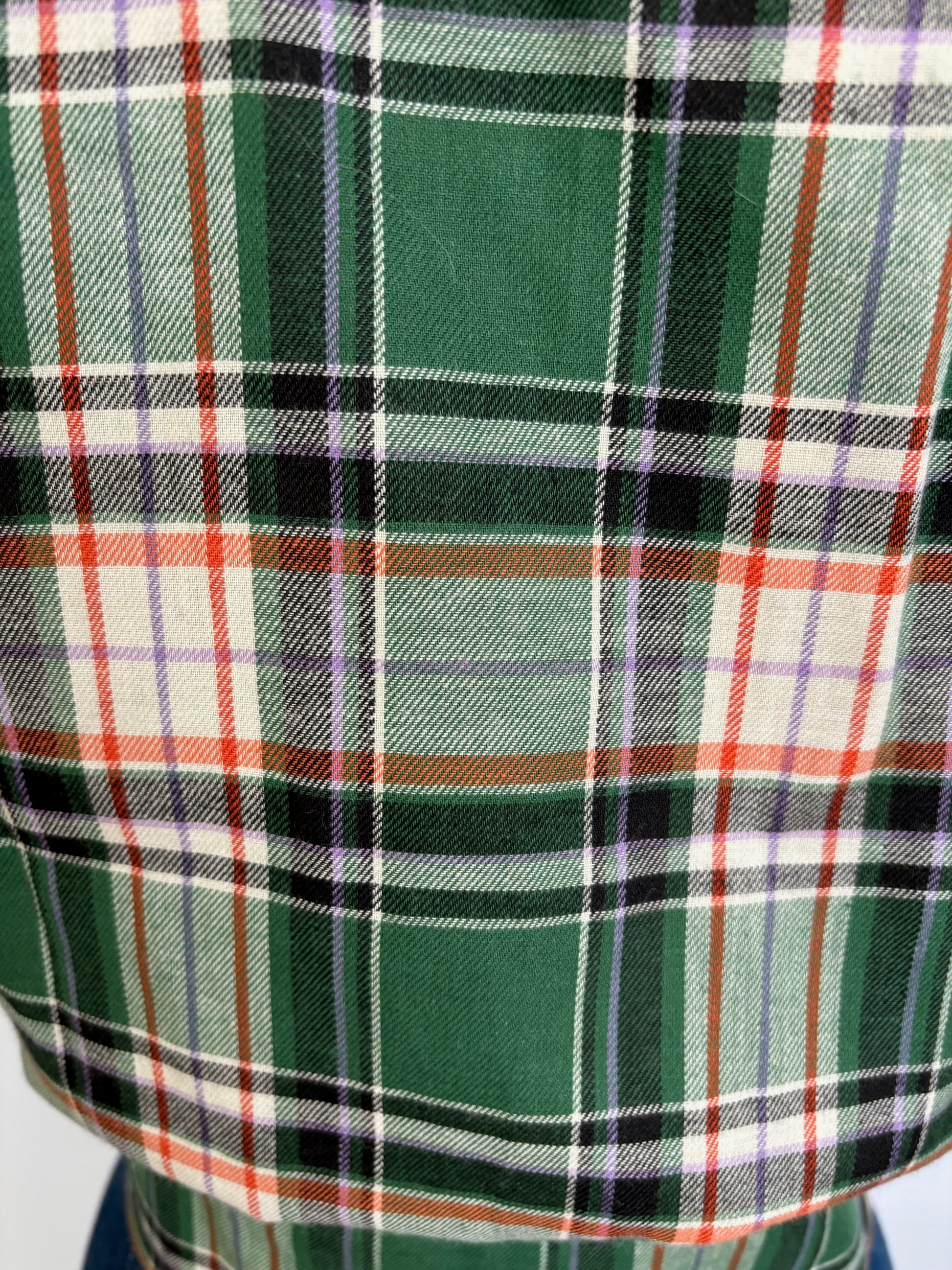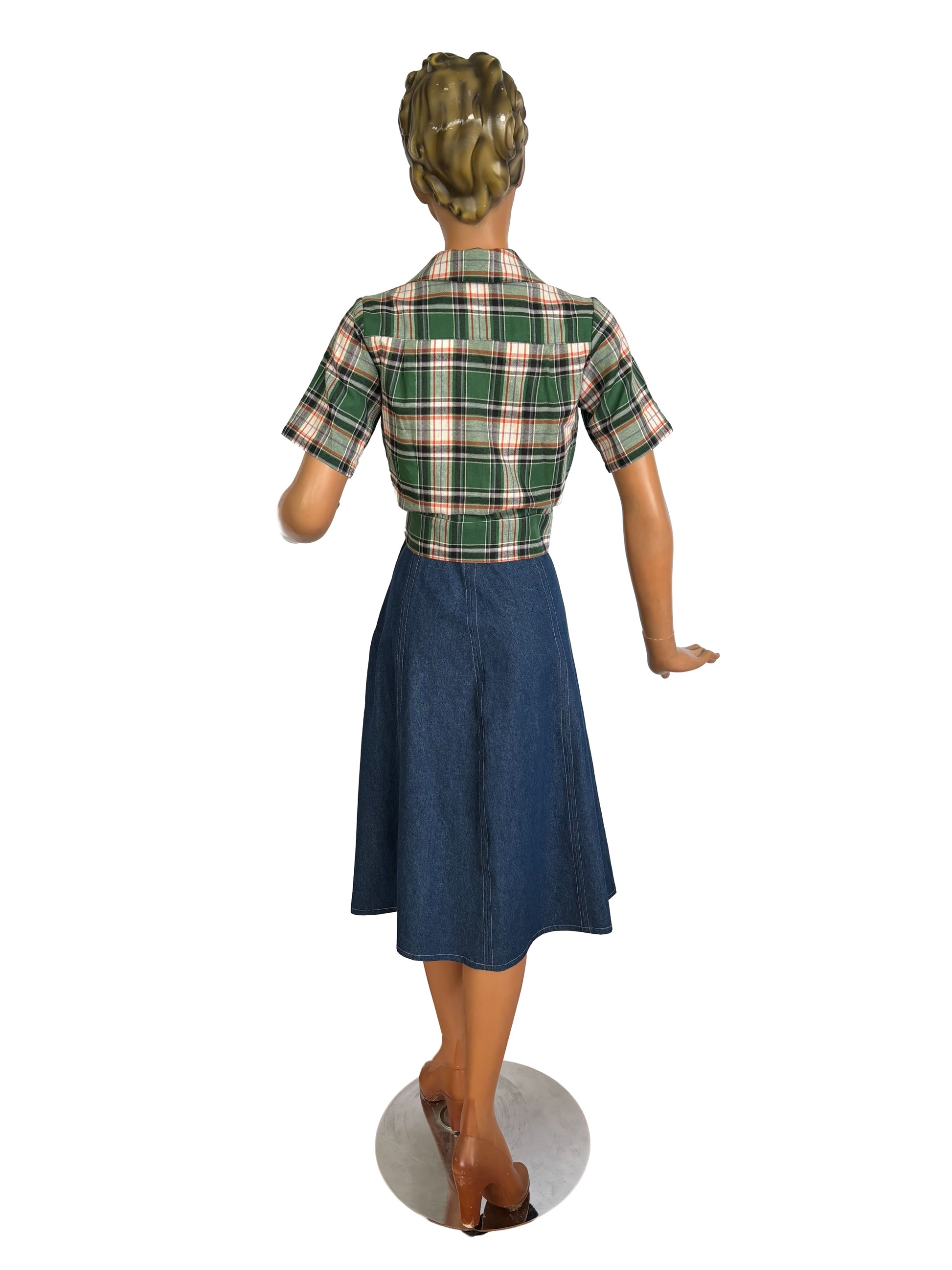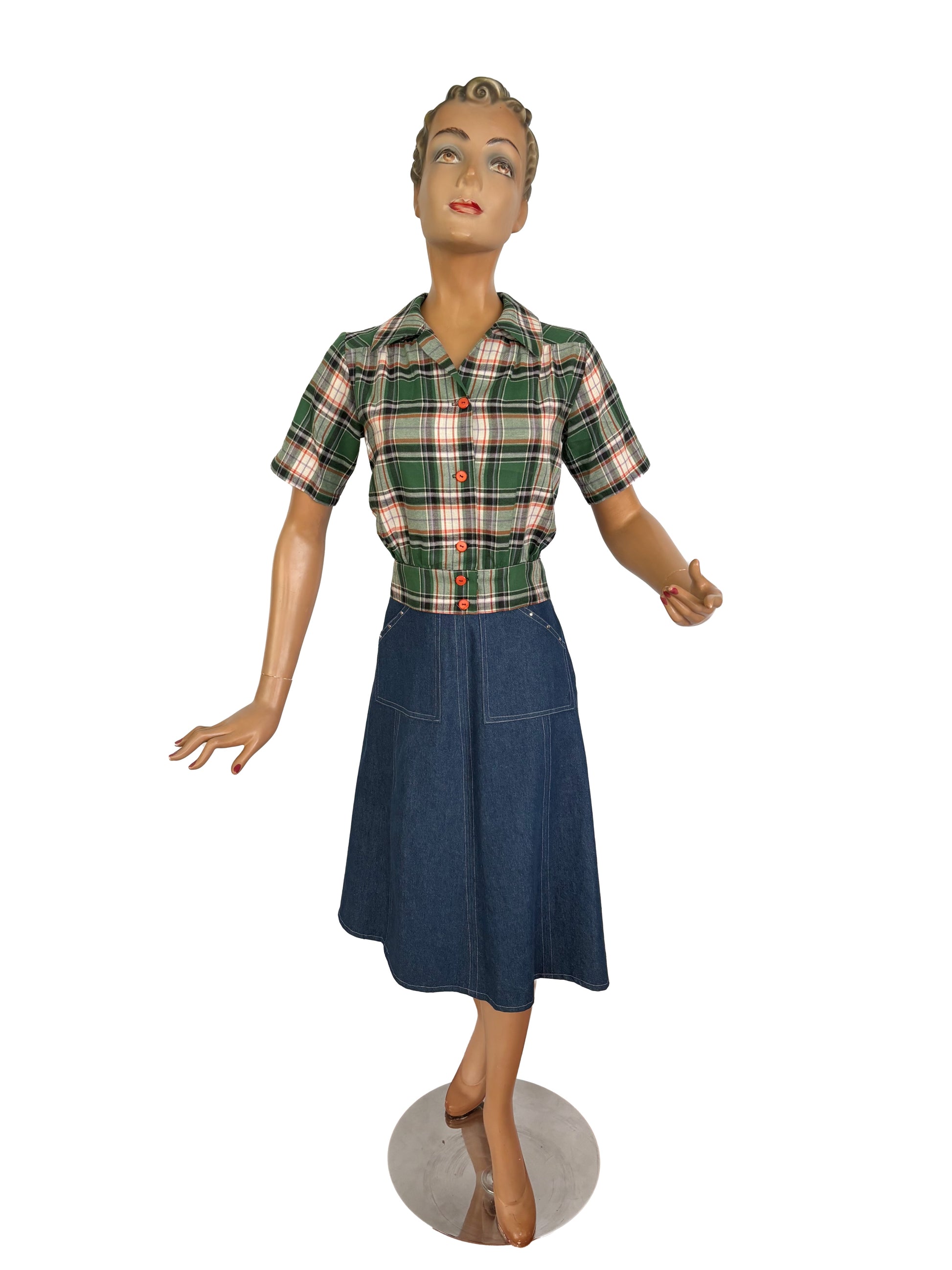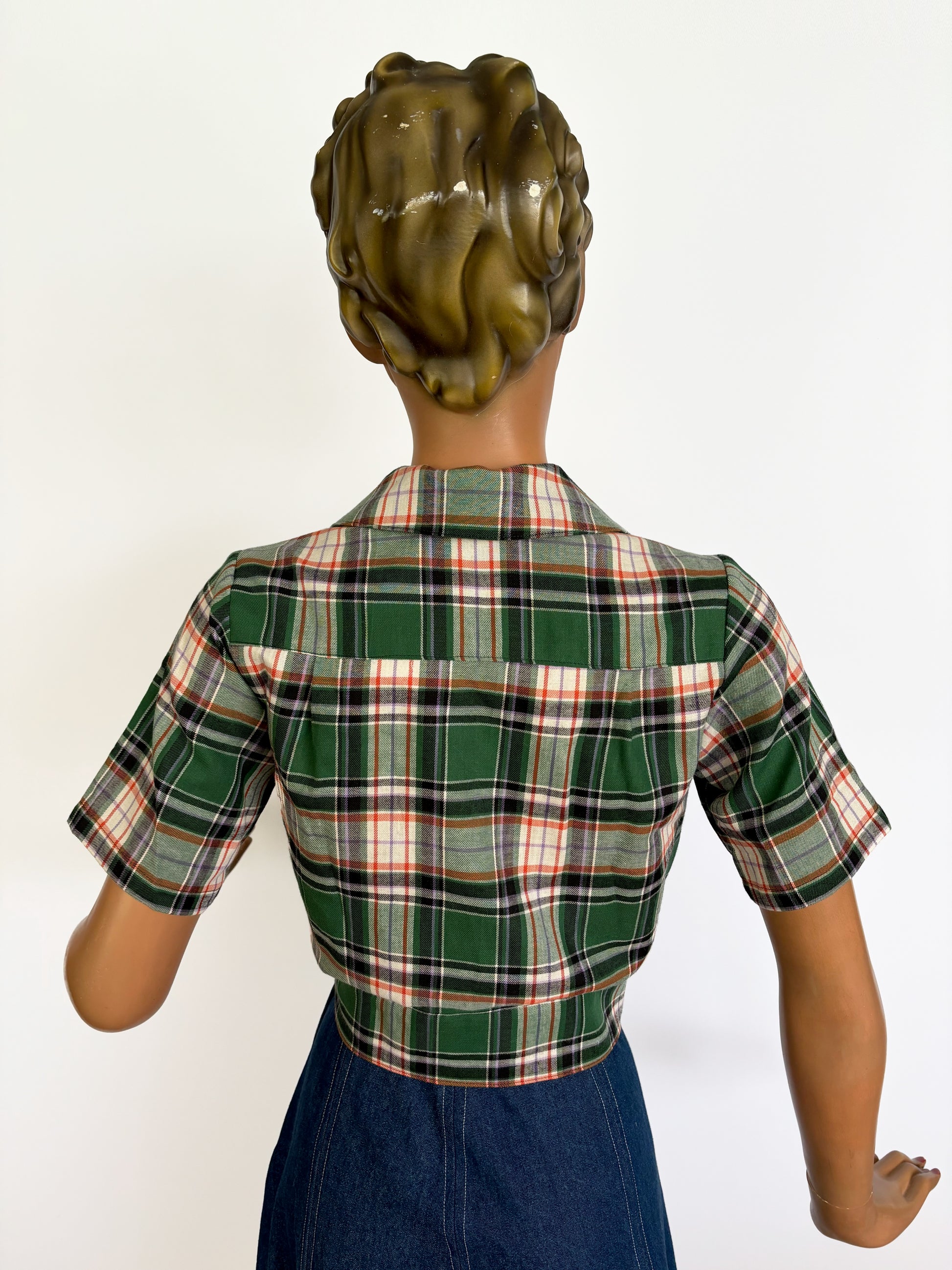 1940s style blouse in green and orange tartan, that looks perfect on your pencil skirt or slacks.