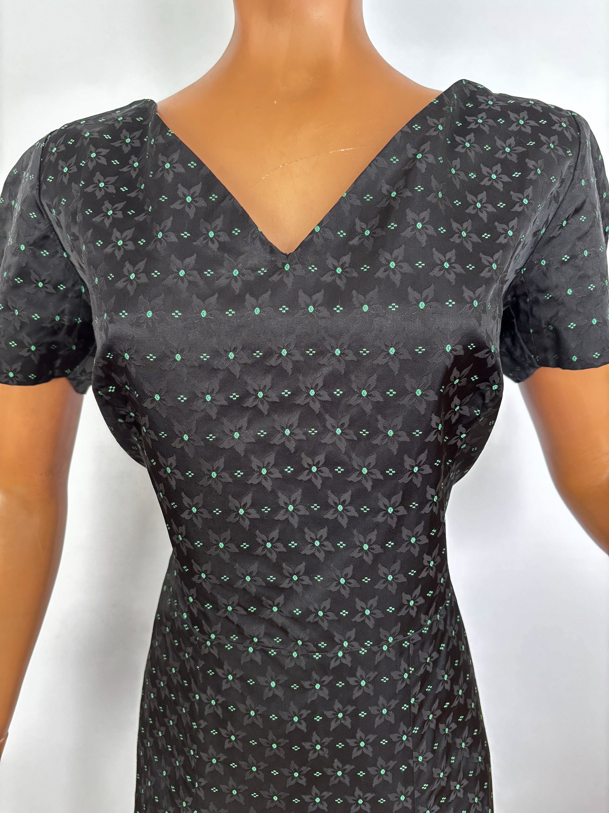 Late 1940s to early 1950s dress made from black rayon jacquard with an intricate woven floral pattern in green. The fabric has a subtle sheen and soft drape, similar to lightweight taffeta. The dress has a V-neck at both front and back and short sleeves. Six-panel skirt and darts at the front and back. Closes at the side with a metal zipper.