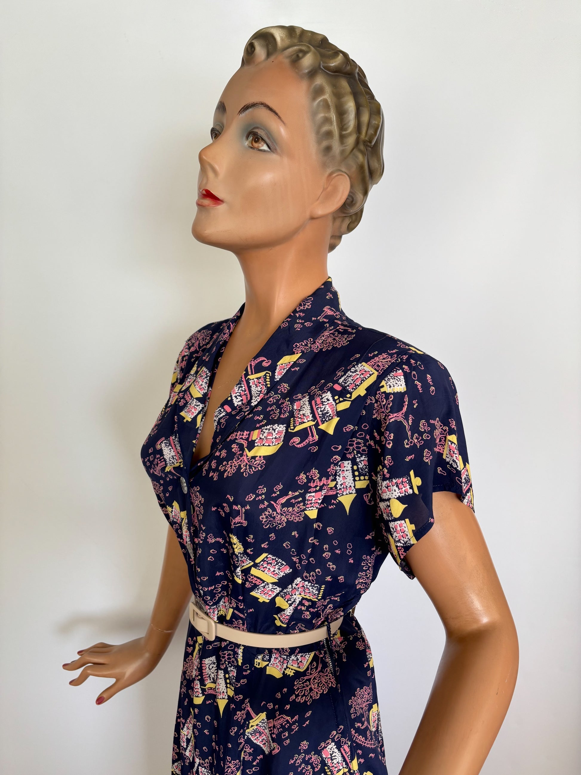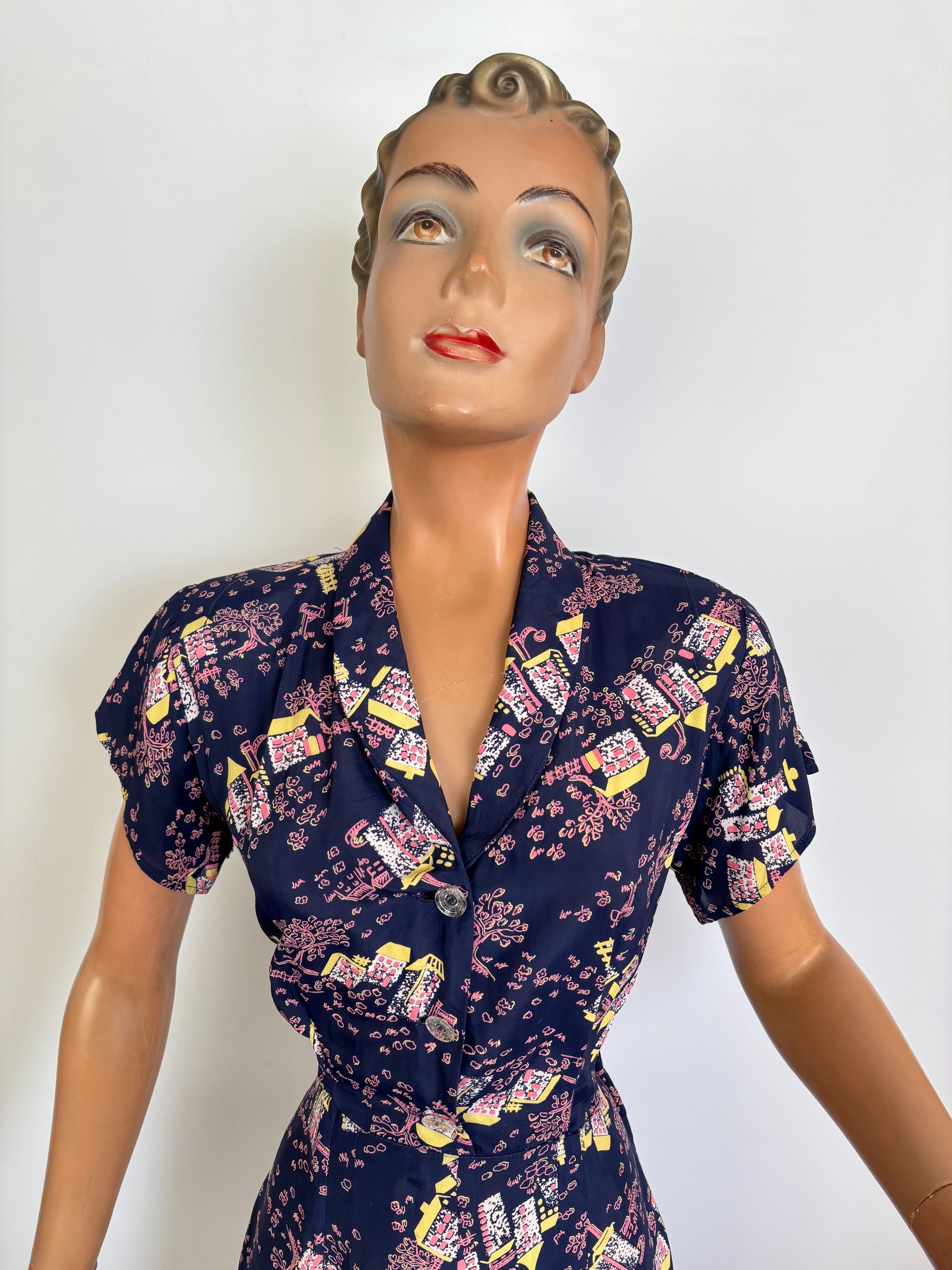 1940s style dress made from original 1940s cold rayon novelty print fabric in navy blue with houses, trees, and mailbox motifs in pink, yellow, and white. The dress has a shawl collar and closes at the front with original glass buttons. The short sleeves are shaped, and the shoulders have newly added padding. The bodice has stitched shoulder pleats at the front. The skirt has four front pleats stitched down to the hip. It closes with a metal side zipper. Belt loops are present, but no belt is included. Front and back shaping seams create a fitted waist.