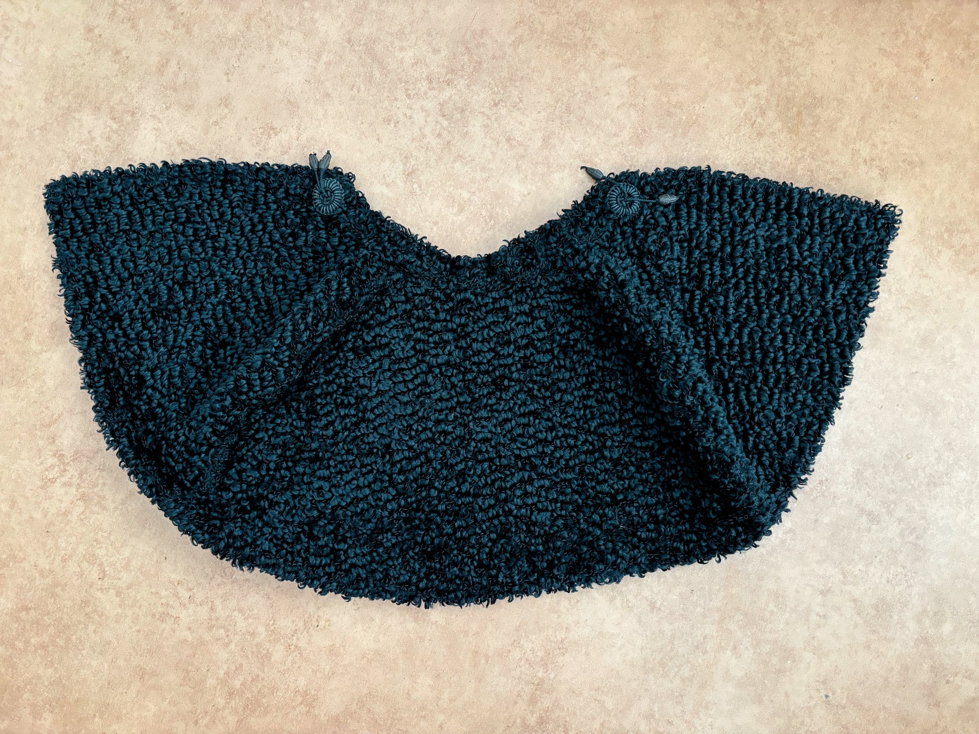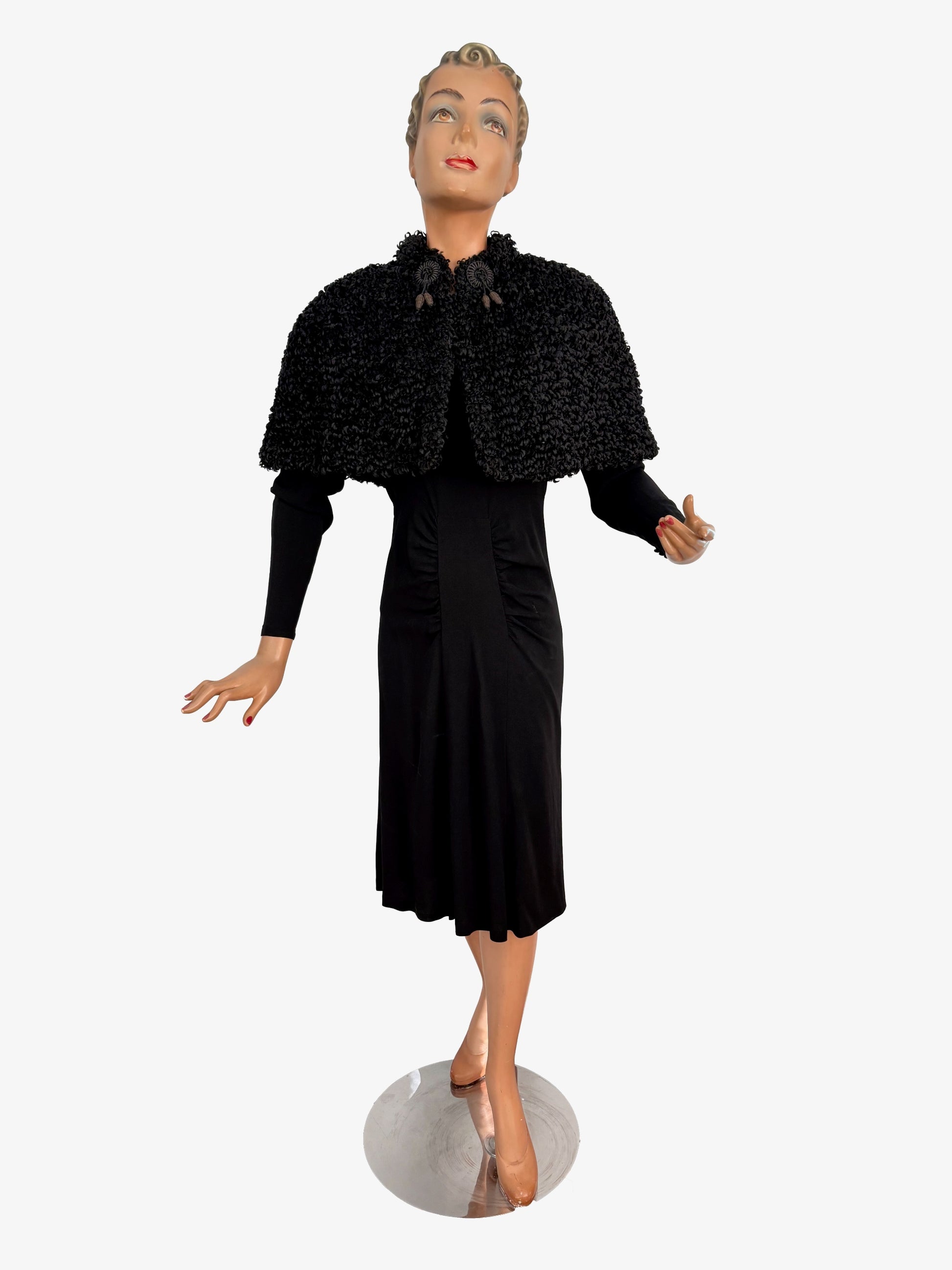 The capelet has a standing collar and closes at the front with three hook and eye fastenings. Decorative cord ornaments with small tassel details sit near the neckline. The semicircular cut allows it to drape over the shoulders in typical late 1930s to early 1940s fashion.