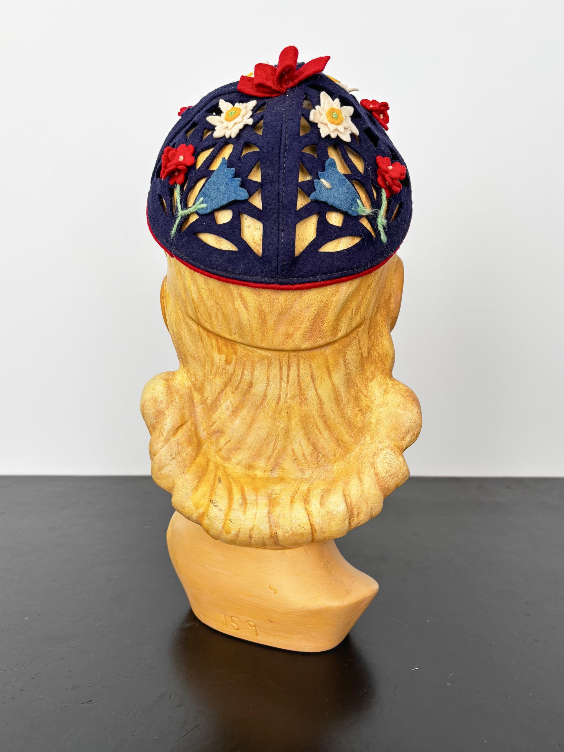 This adorable 1930s/40s German calot hat is made of navy felt with cutout details and colorful felt floral appliqué, including edelweiss motifs. It has a red trim along the edge and a small felt tab at the top.
