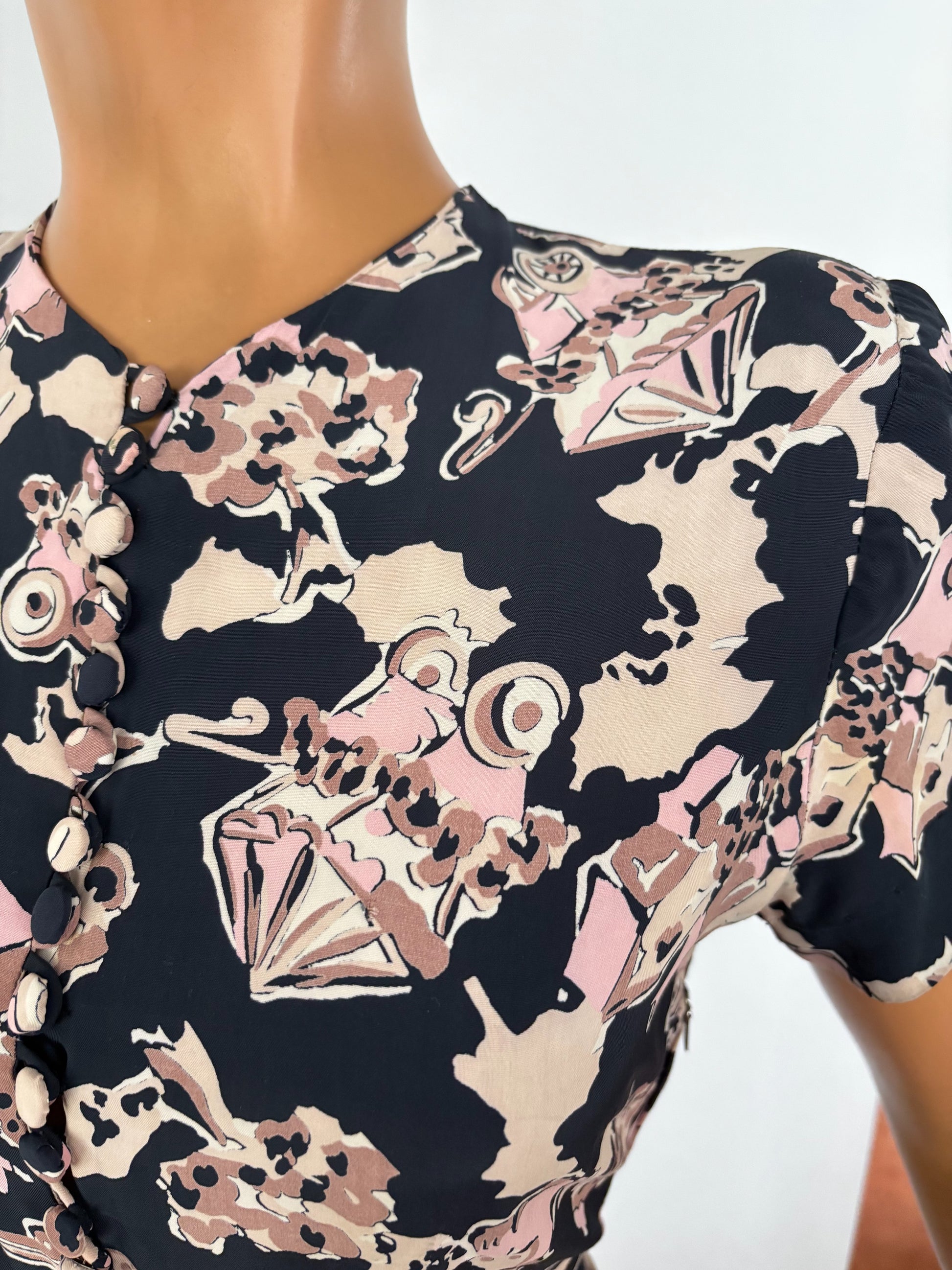 Made from rayon in black with a fabulous pink and beige novelty print. The pattern features parasols, fans, masks, and floral elements in a playful and artistic arrangement. The dress has a small rounded neckline, shoulder pads. short sleeves, and closes with a metal zipper. The front has a row of covered buttons, and the skirt is finished with a double flounce detail at the hips.