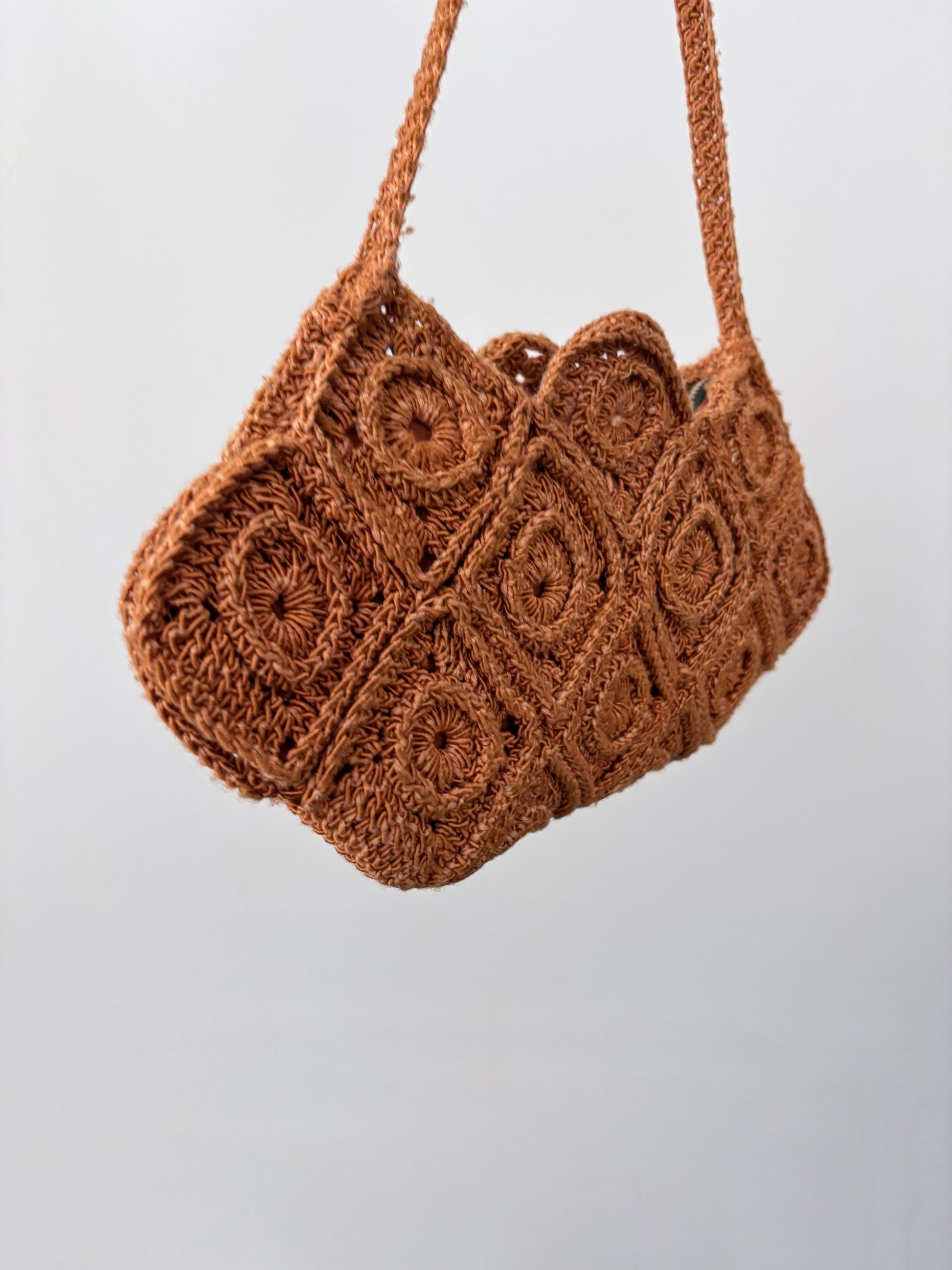 Handbag inspired by 1940s designs. The bag is crocheted from wool and has reinforced sides to help maintain its shape. It closes with a top zip and is fully lined with bronze-colored satin.