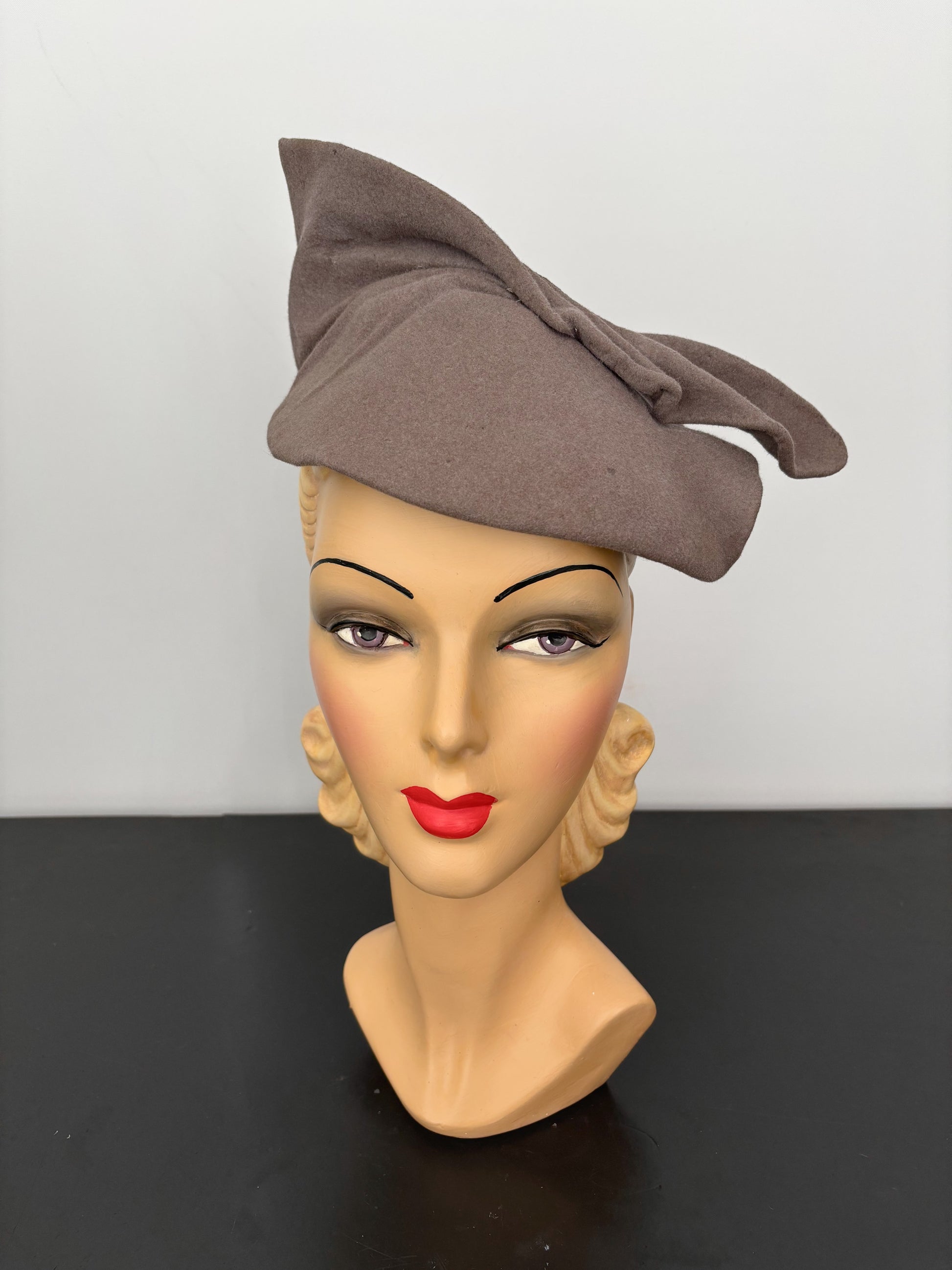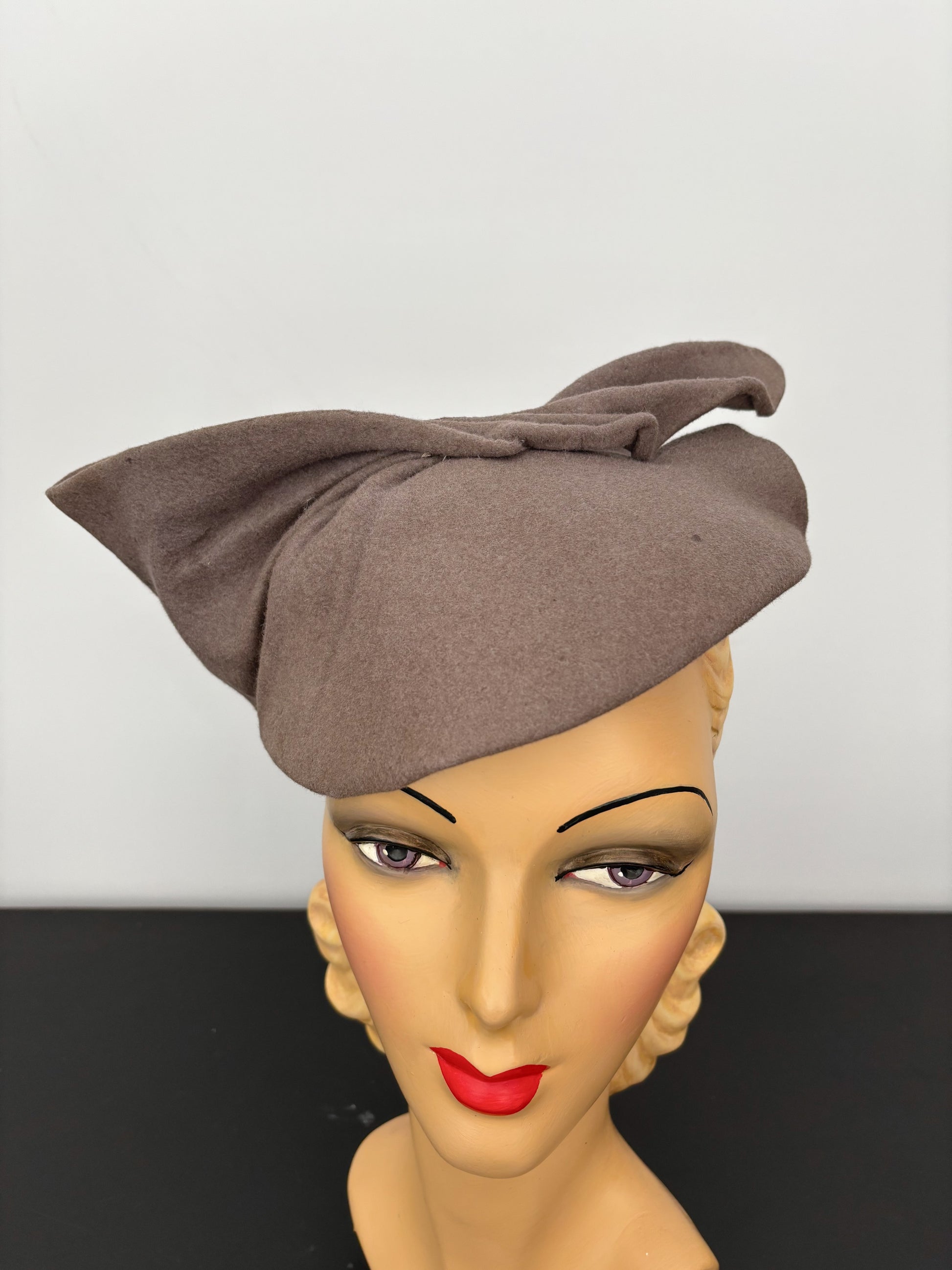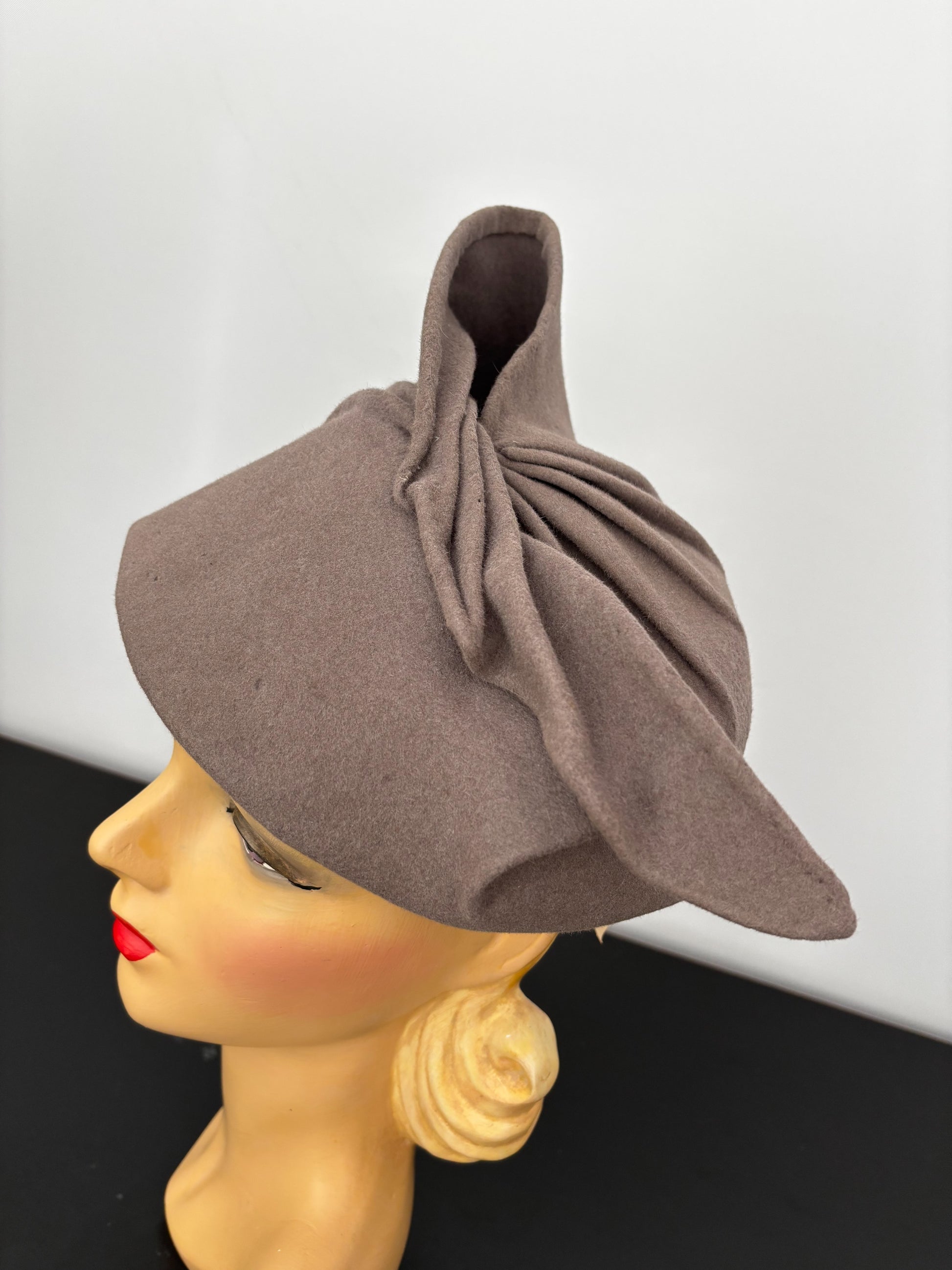 Beautiful late 1930s to early 1940s hat made of soft taupe wool felt with an architectural folded design. The asymmetric, sculptural shape is typical of the late Art Deco and early wartime era. The hat still has its original paper store tag reading “Feutre écru”.