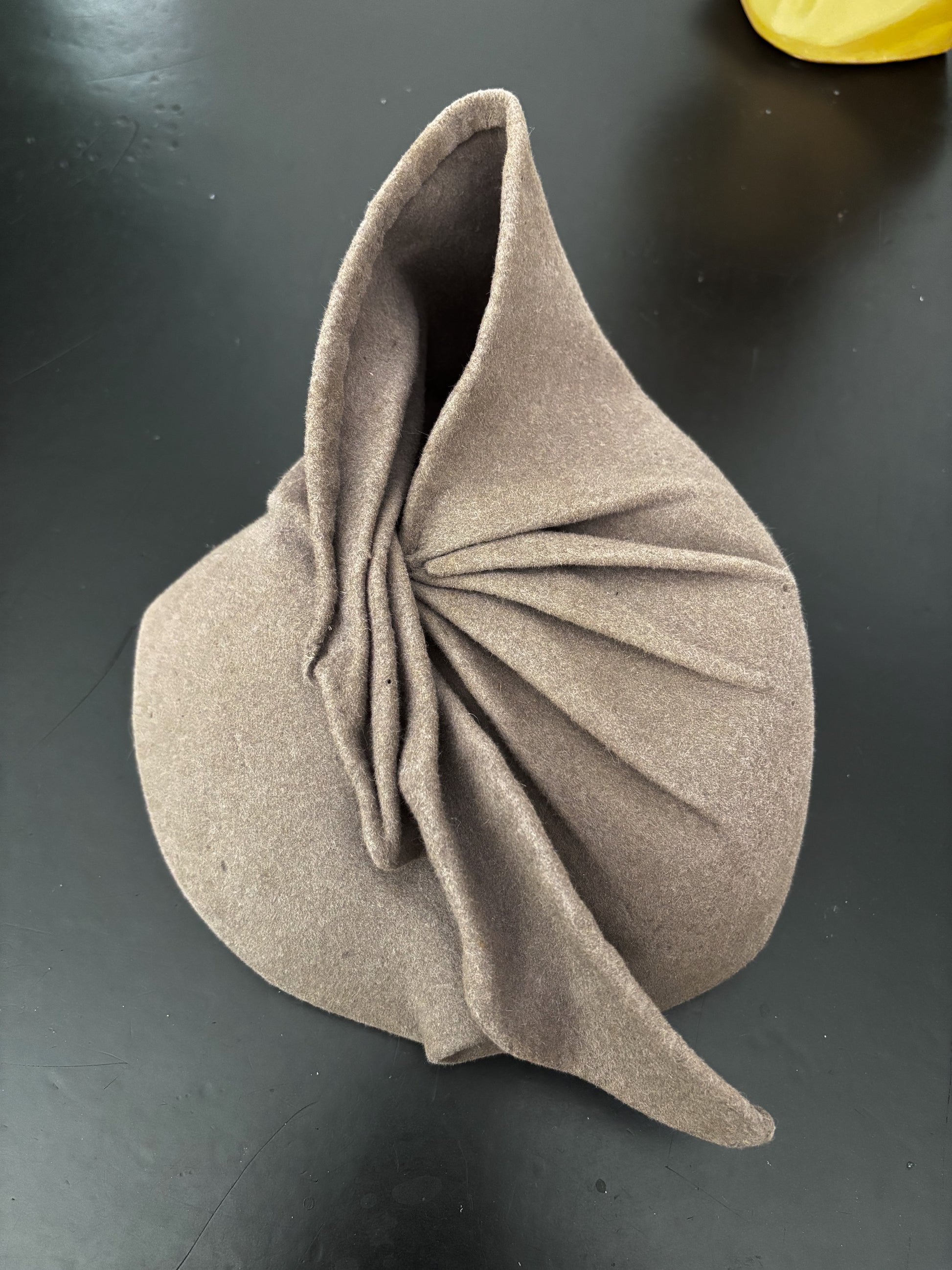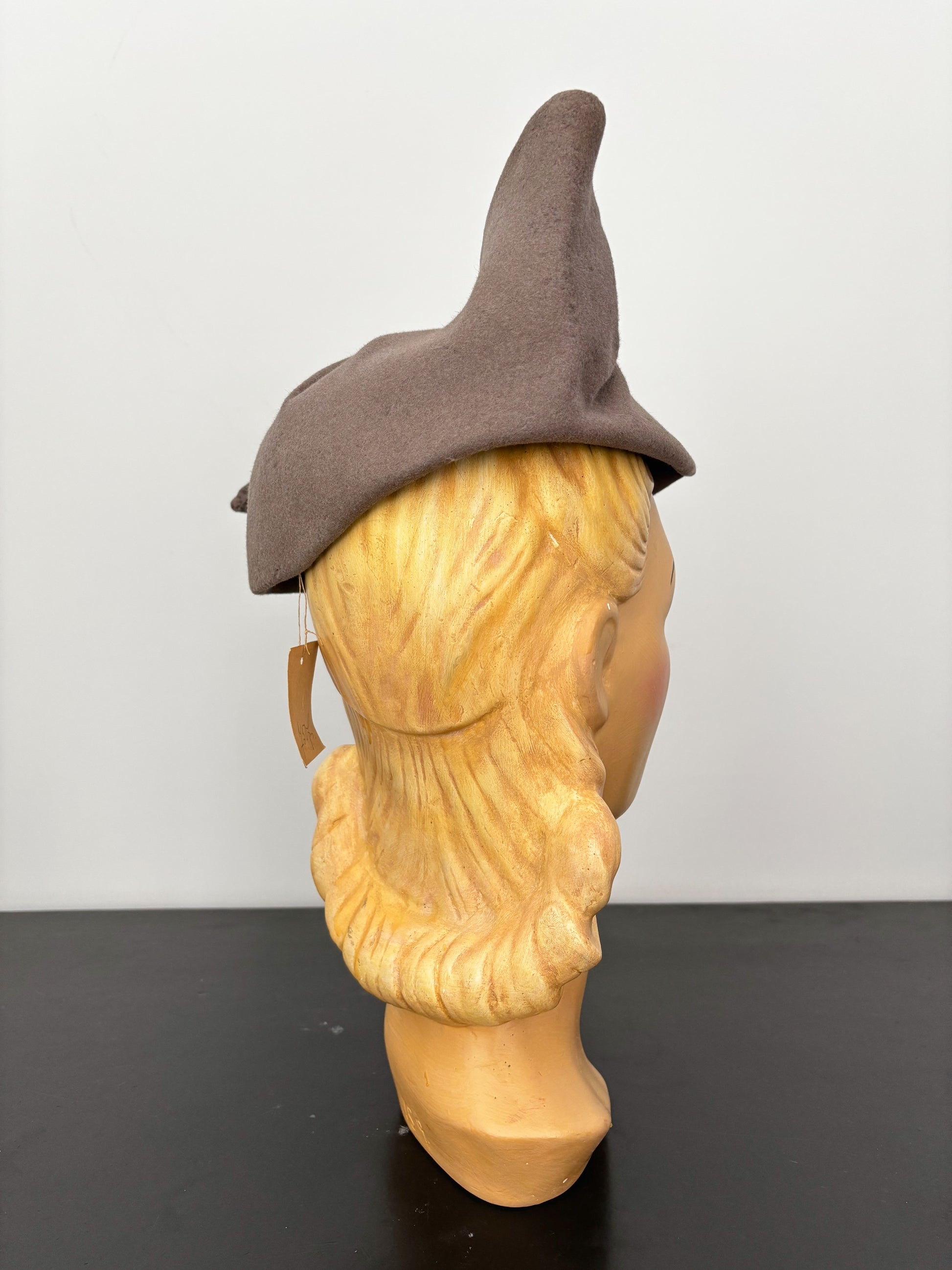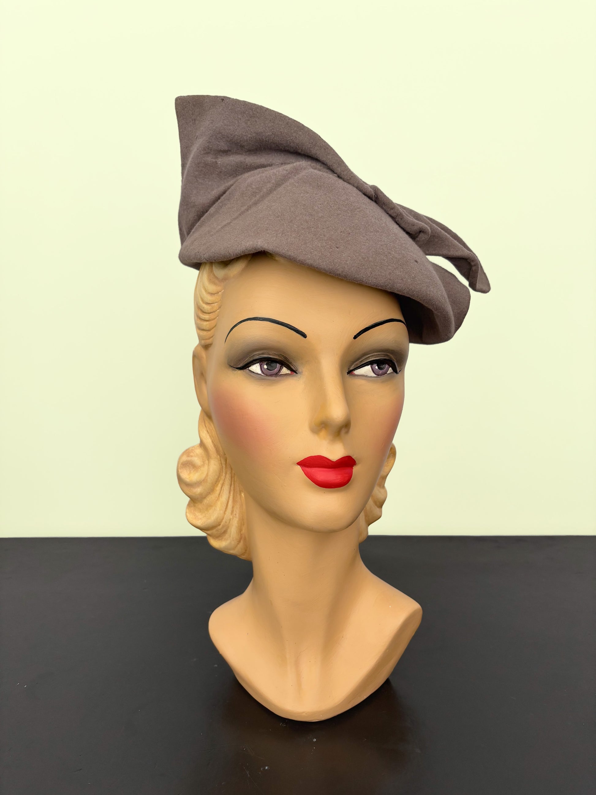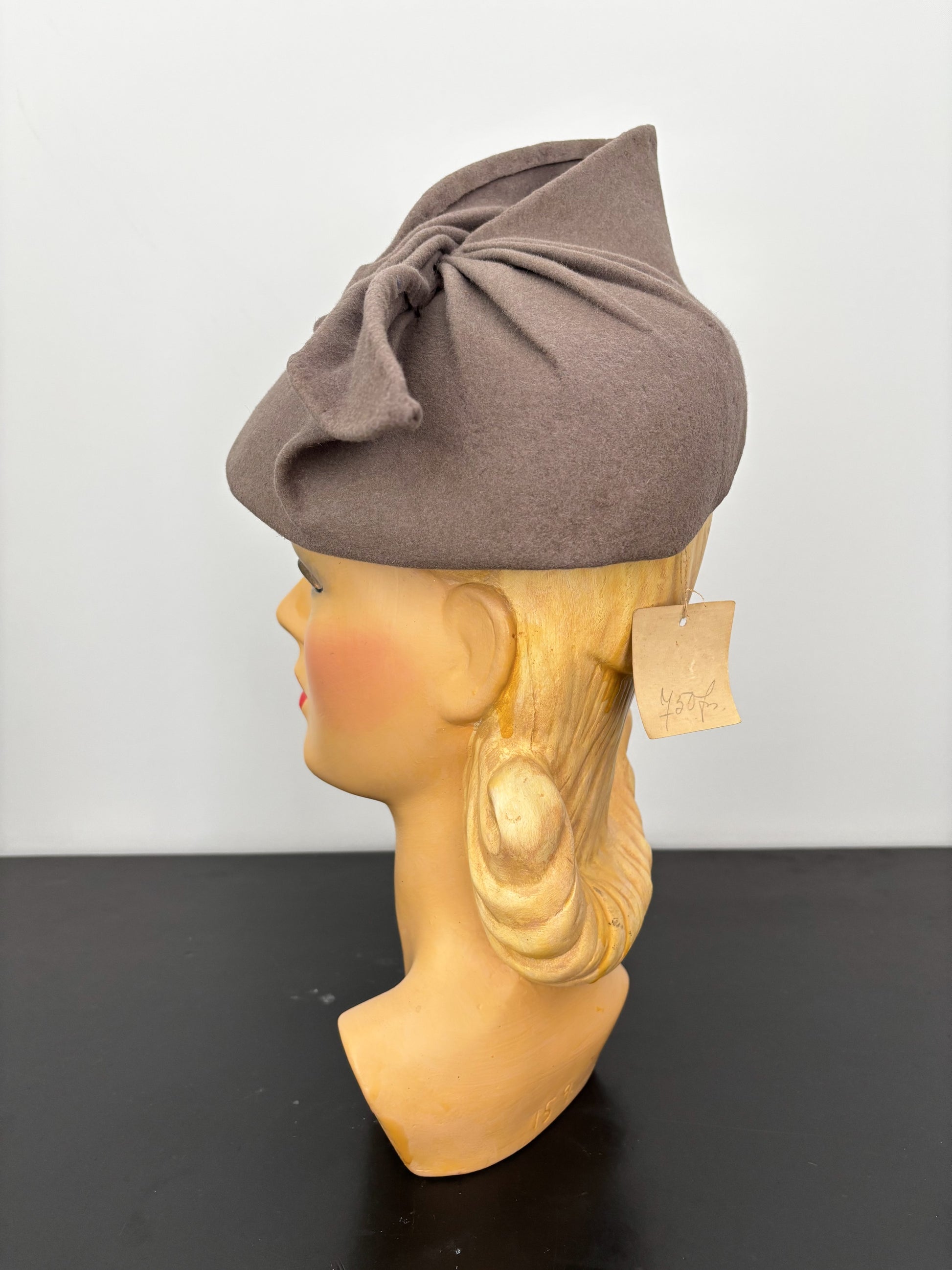 Beautiful late 1930s to early 1940s hat made of soft taupe wool felt with an architectural folded design. The asymmetric, sculptural shape is typical of the late Art Deco and early wartime era. The hat still has its original paper store tag reading “Feutre écru”.