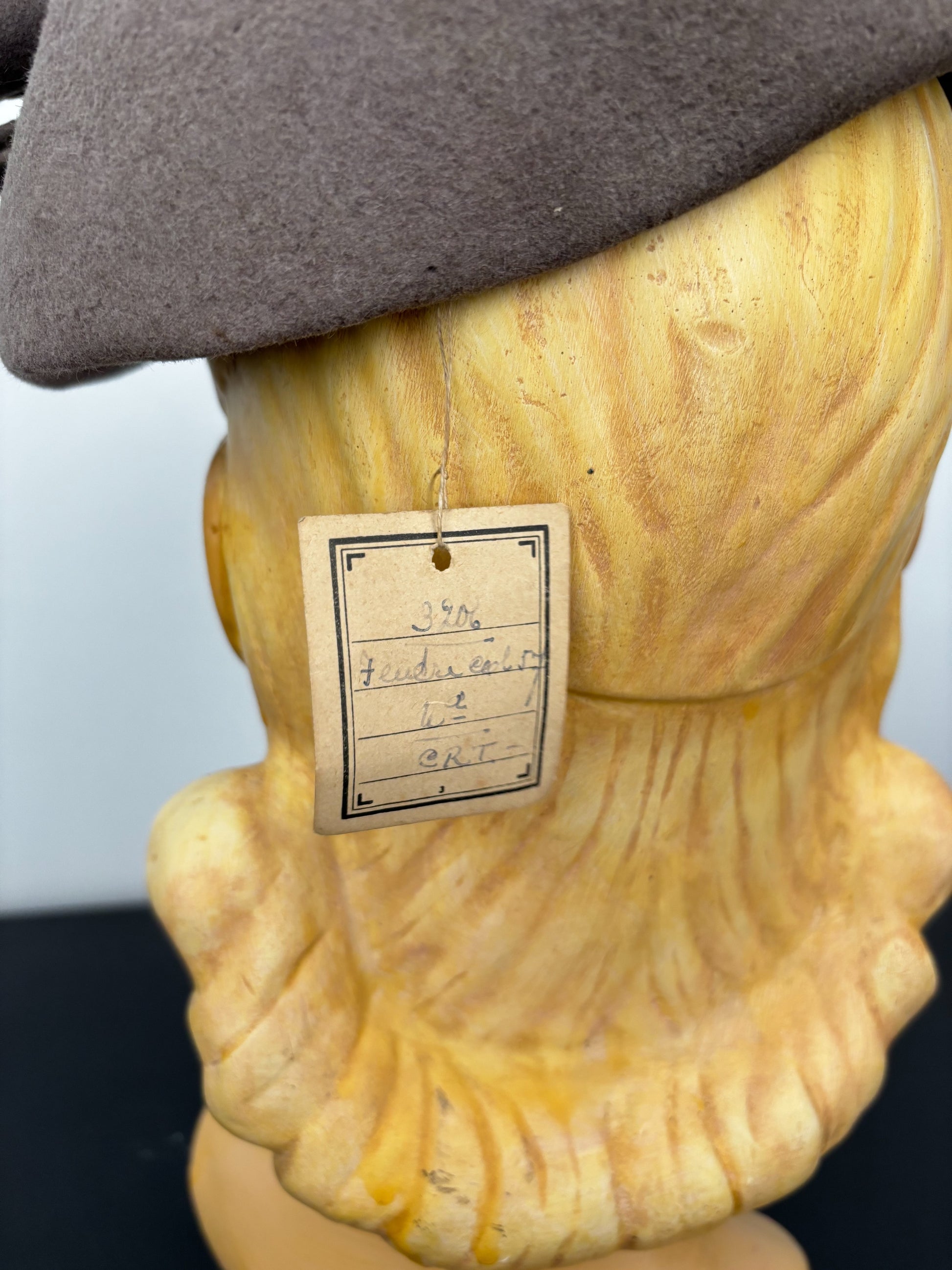In fair vintage condition. The felt shows several small nibbles and surface wear consistent with age. The hat remains structurally sound and displays beautifully.