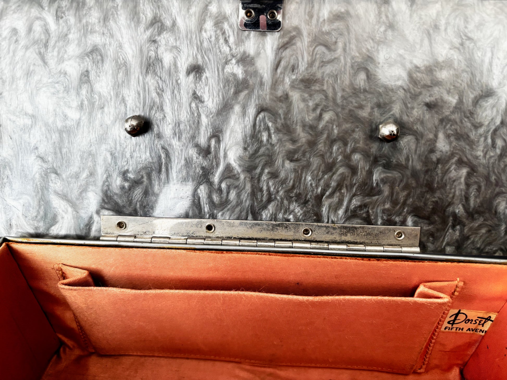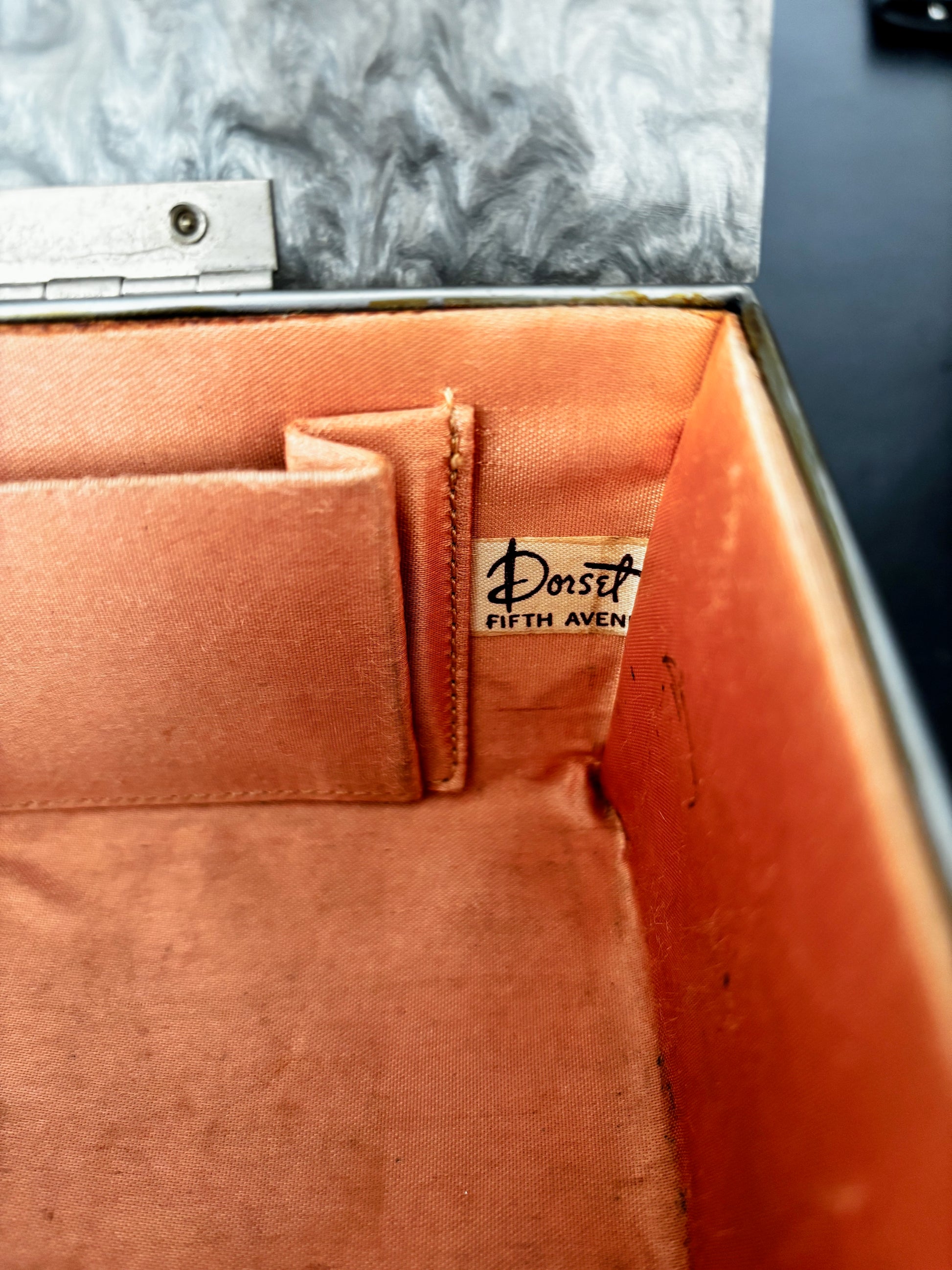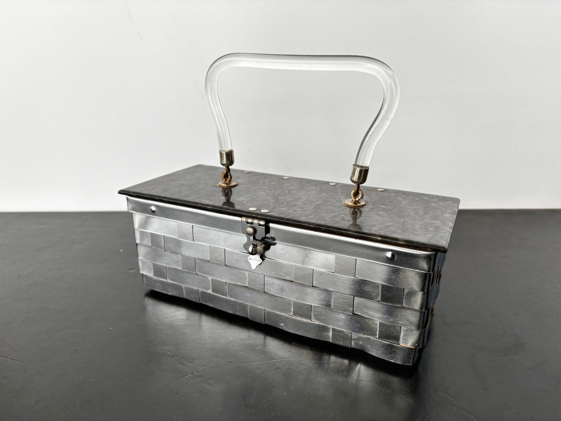 Beautiful early 1950s Dorset Fifth Avenue box handbag with silver-tone woven metal strips over a fabric base. It has a grey marbled lucite lid and a clear lucite handle with metal fittings. The bag closes with a small latch at the front and is lined in coral satin with an inner pocket.