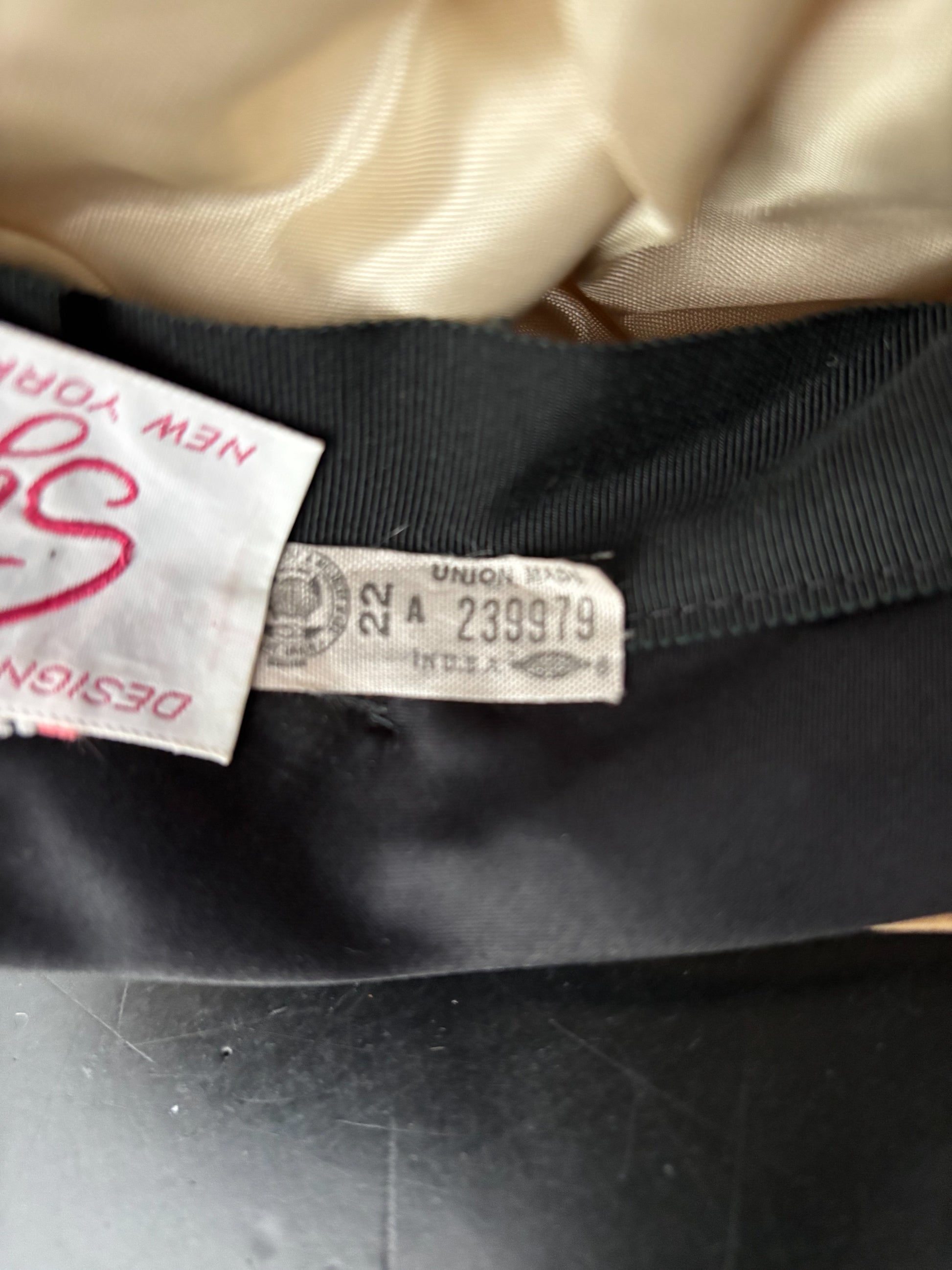 Gorgeous 1950s beret by Sylvia New York – St. Louis, crafted from soft camel-coloured velour with black velvet panels and a light beige centre. The crown is softly pleated in a floral shape, creating a voluminous New Look silhouette. Fully lined in cream rayon with an inner grosgrain band. Designed to rest lightly on the head or slightly tilted to one side.