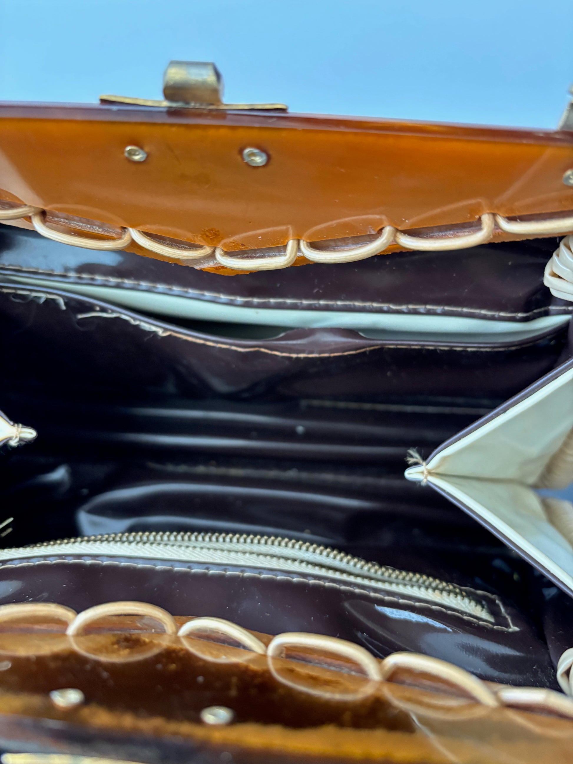 Beige plastic wicker handbag with a brown marbled lucite frame and handles. The front panel has woven lucite beads. It closes with a metal top clasp. Gold-tone hardware throughout.