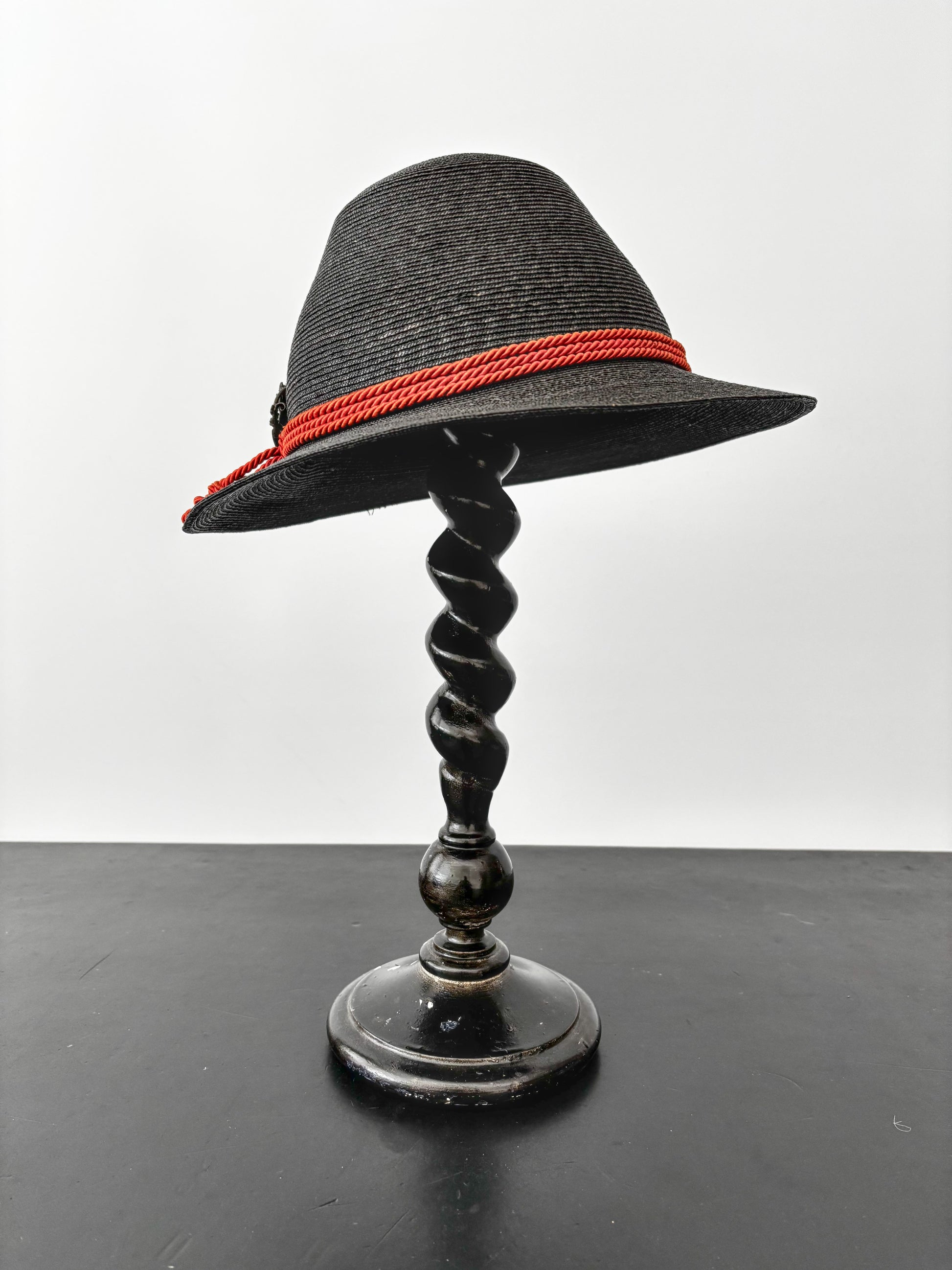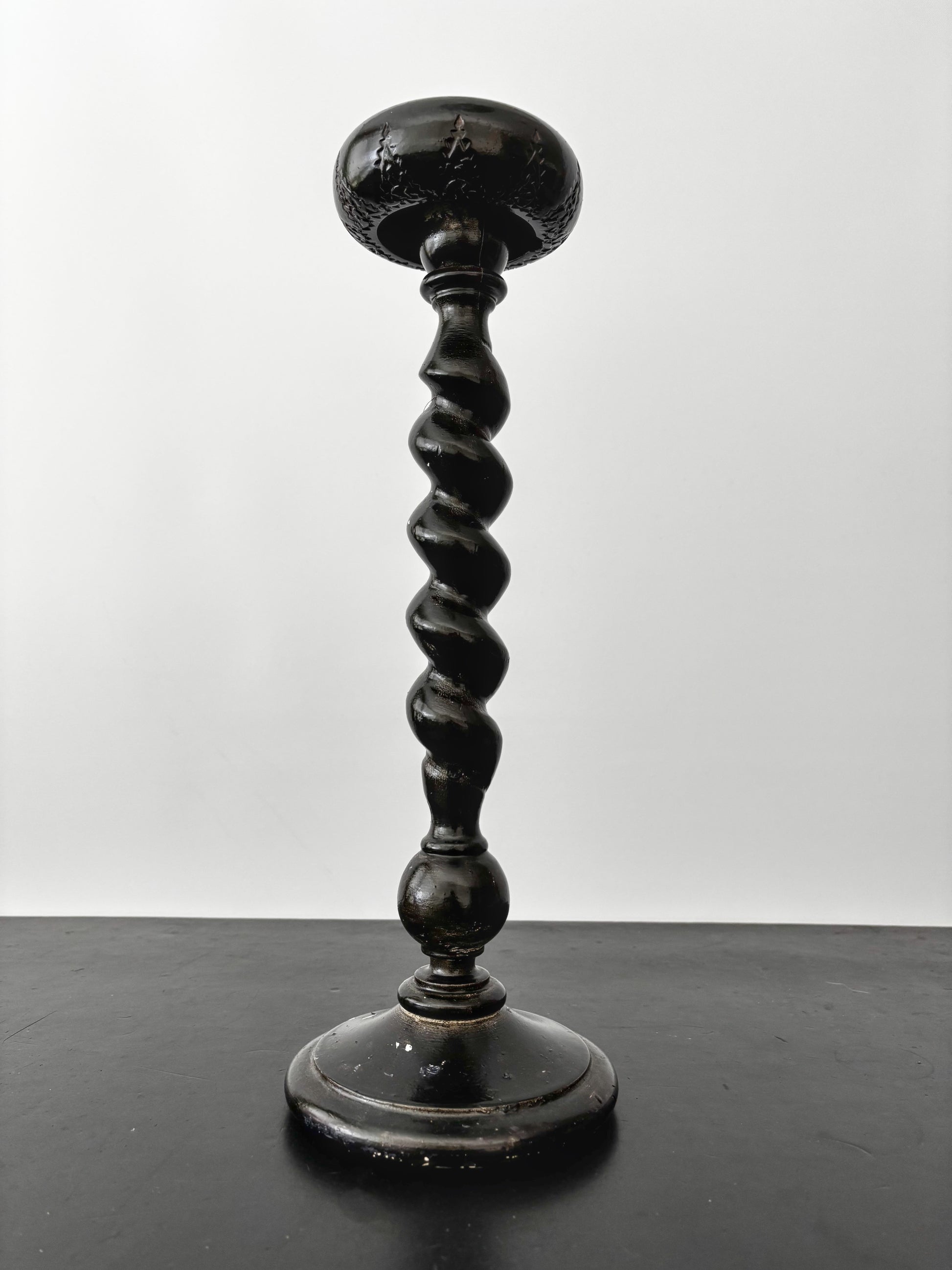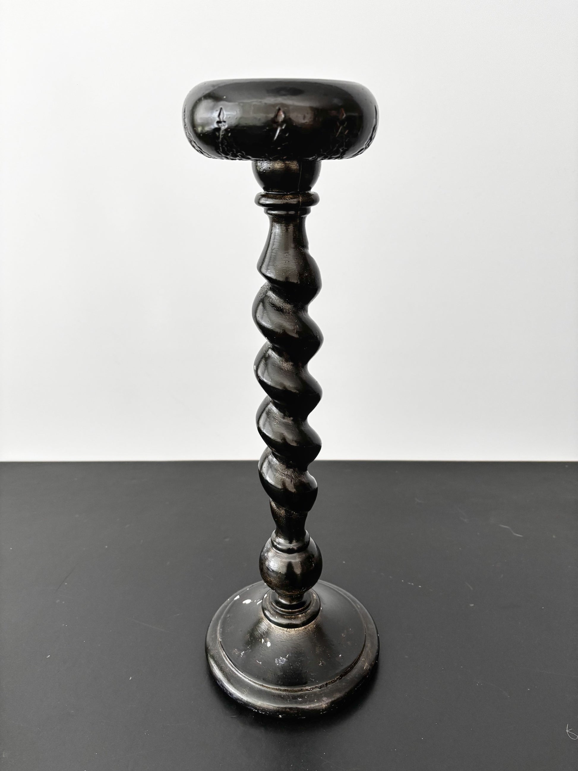 Antique wooden hat stand dating from the late 19th to early 20th century. It has a beautifully twisted column and mushroom-shaped top with carved detailing around the edge. The wood has been painted black, giving it an ebonized look, though the paint shows significant wear, especially around the base, where it flakes off easily. The stand also appears to have been partially repainted at some point. The wood itself is lightweight.