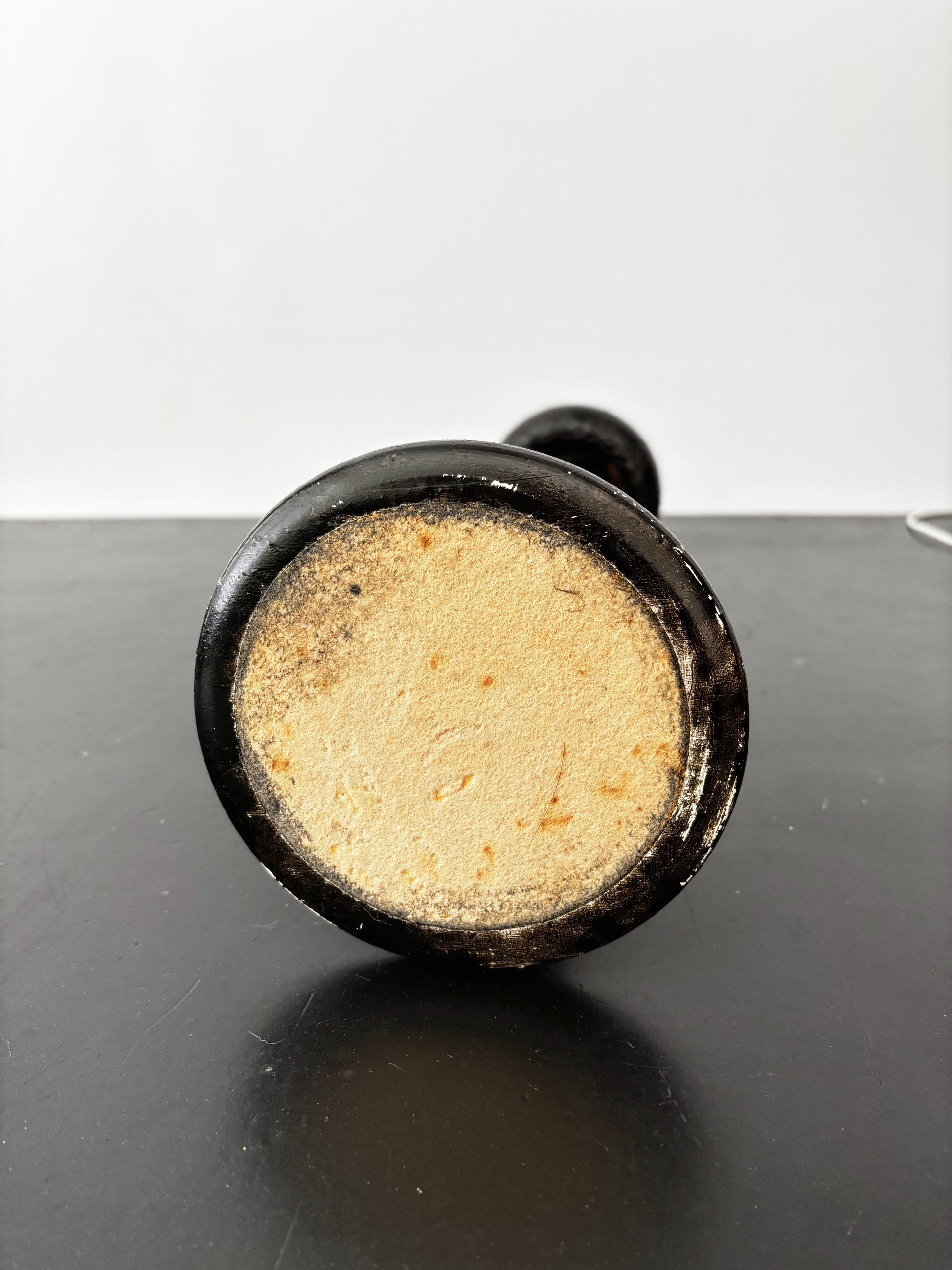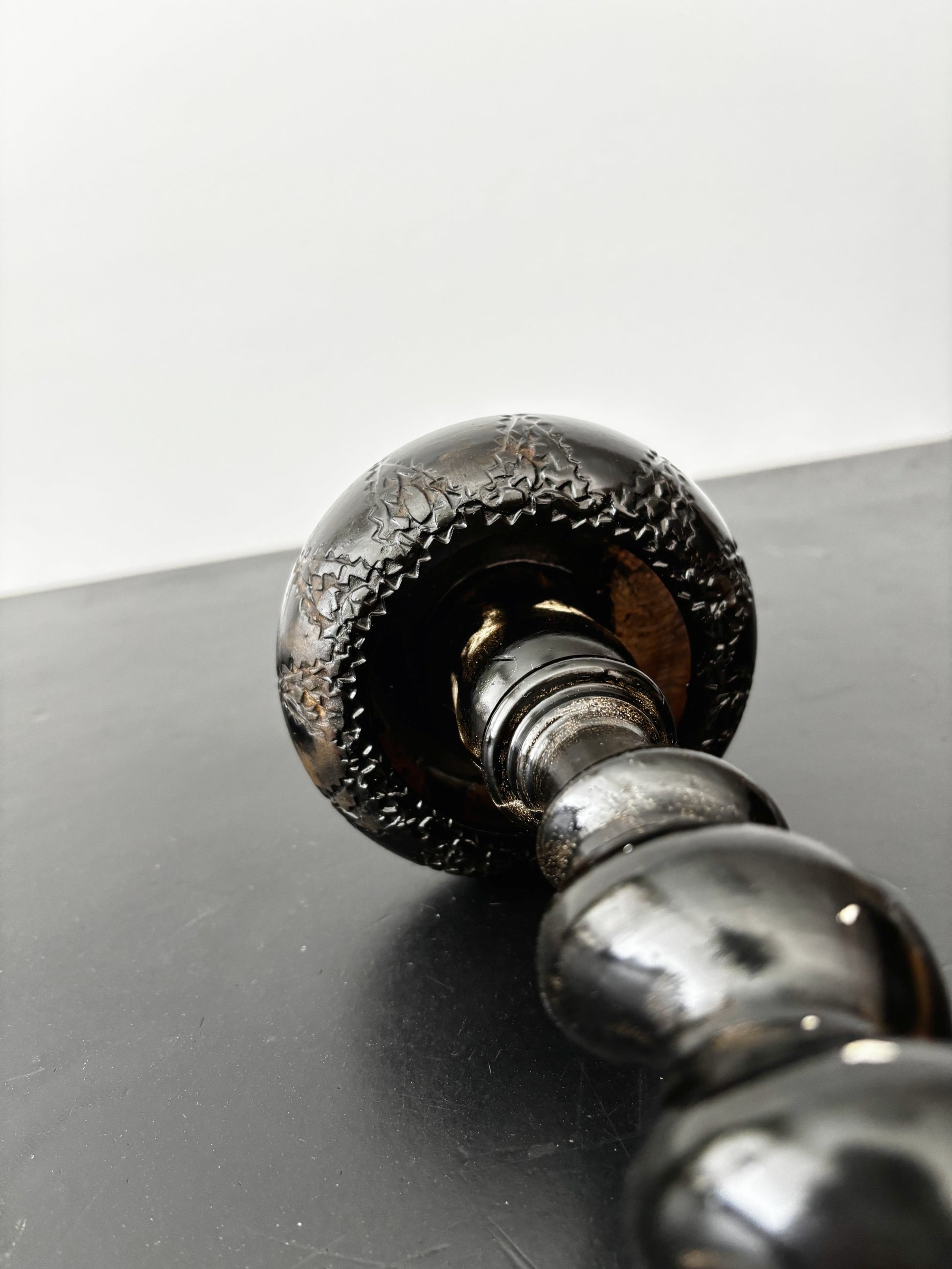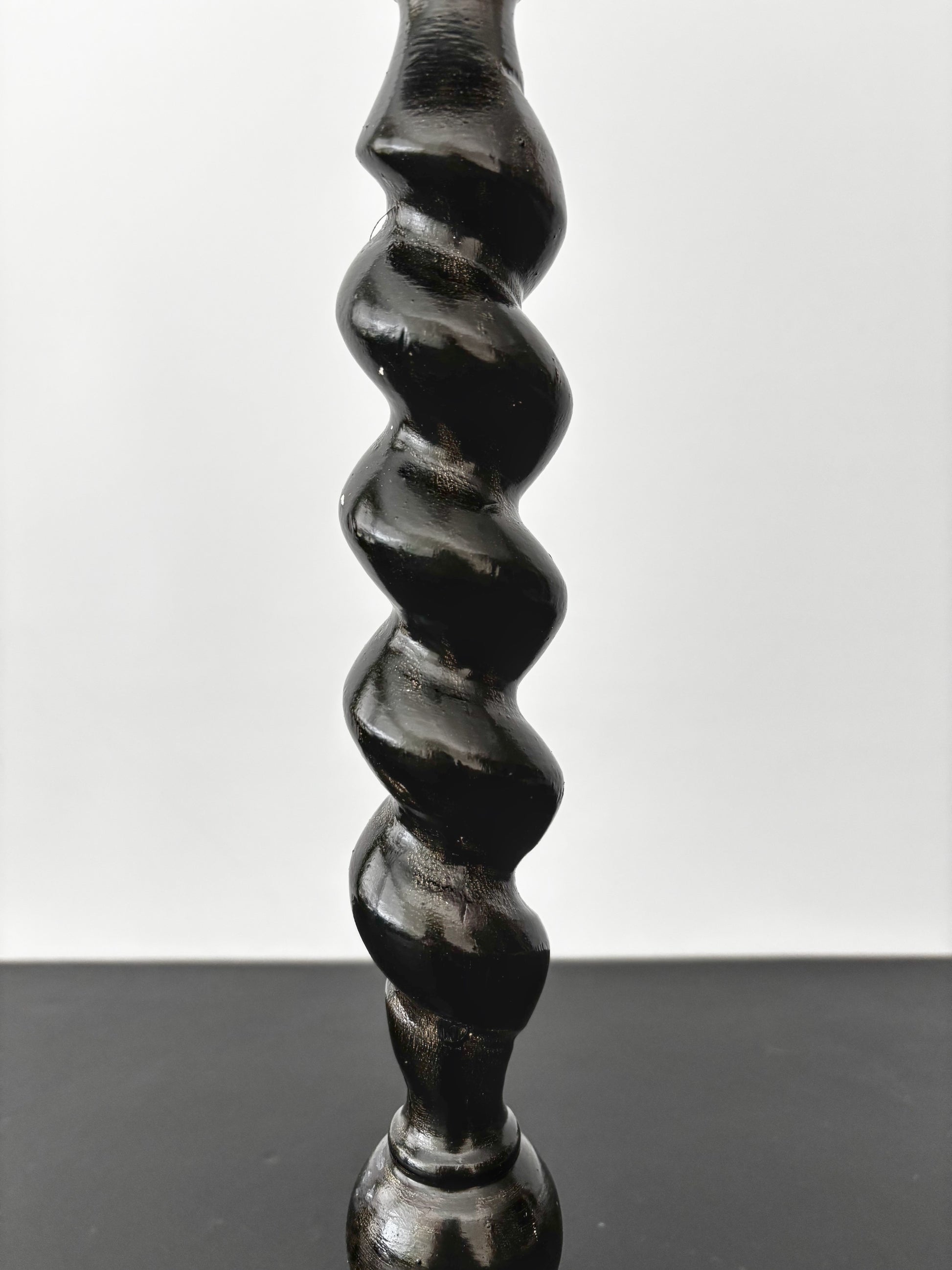 Antique wooden hat stand dating from the late 19th to early 20th century. It has a beautifully twisted column and mushroom-shaped top with carved detailing around the edge. The wood has been painted black, giving it an ebonized look, though the paint shows significant wear, especially around the base, where it flakes off easily. The stand also appears to have been partially repainted at some point. The wood itself is lightweight.