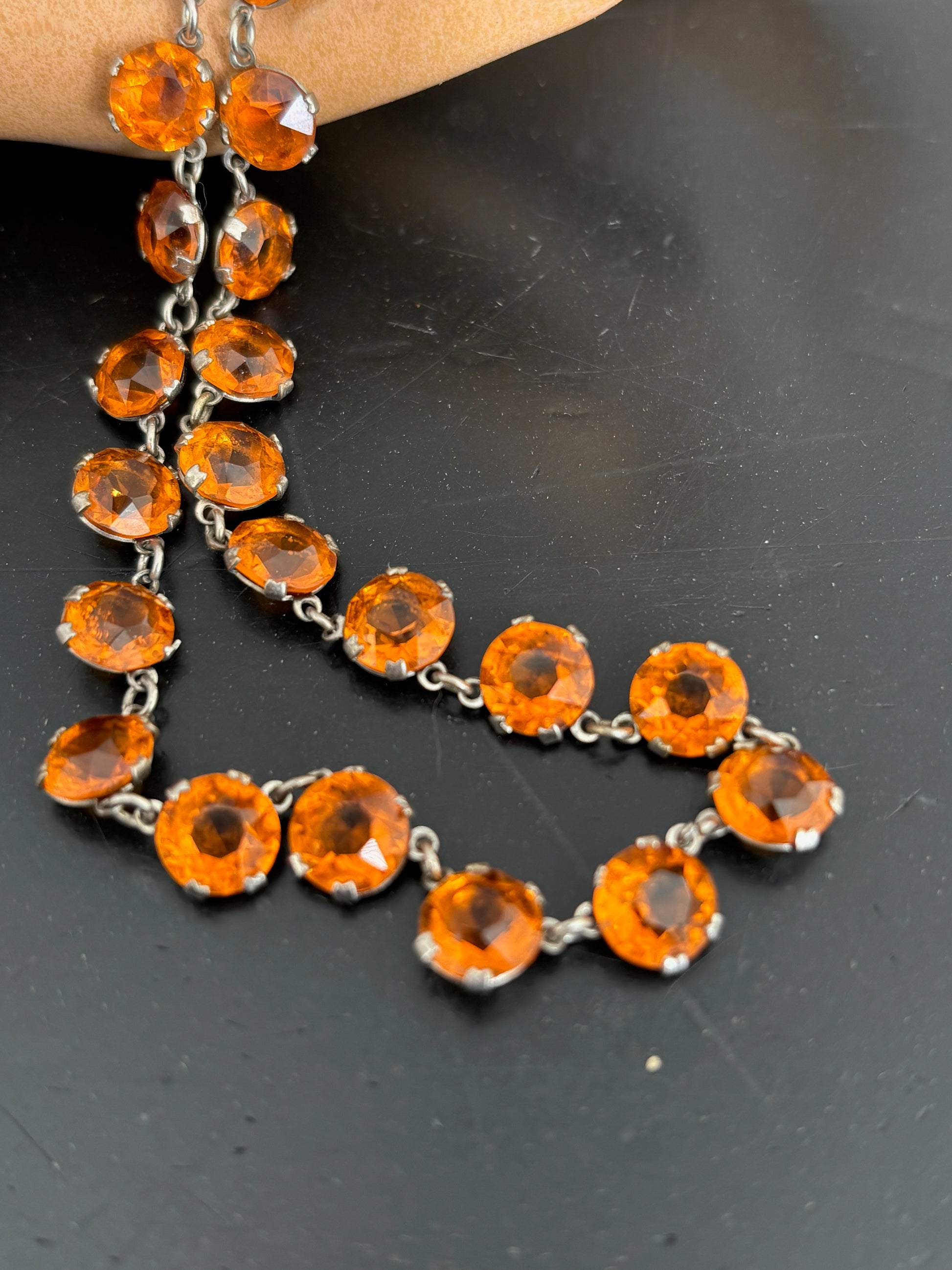 Necklace set with faceted round amber-orange glass rhinestones in open back prong settings. Each stone is individually linked in silver-tone white metal. The stones are foil-free and allow light to pass through from the back.