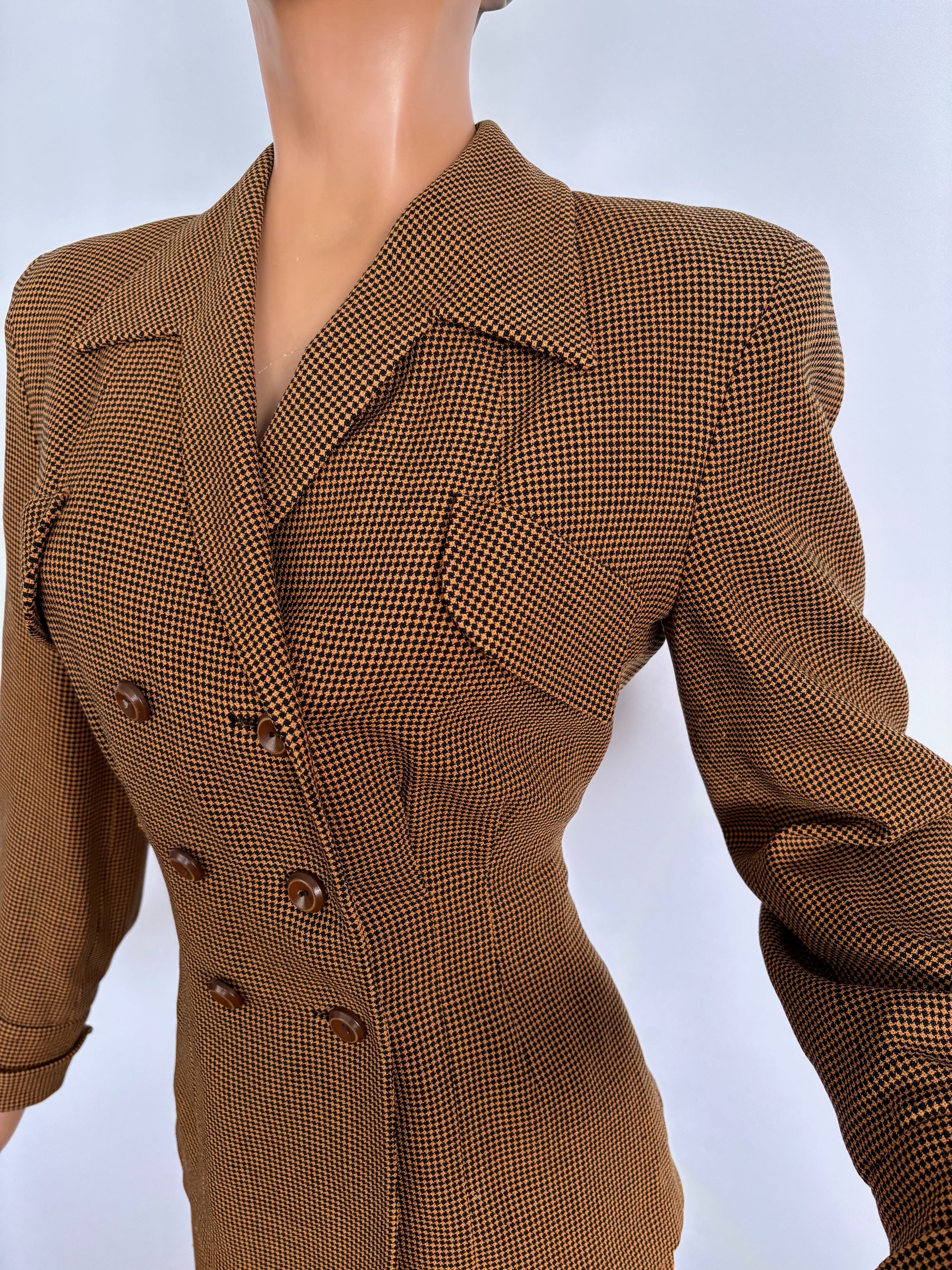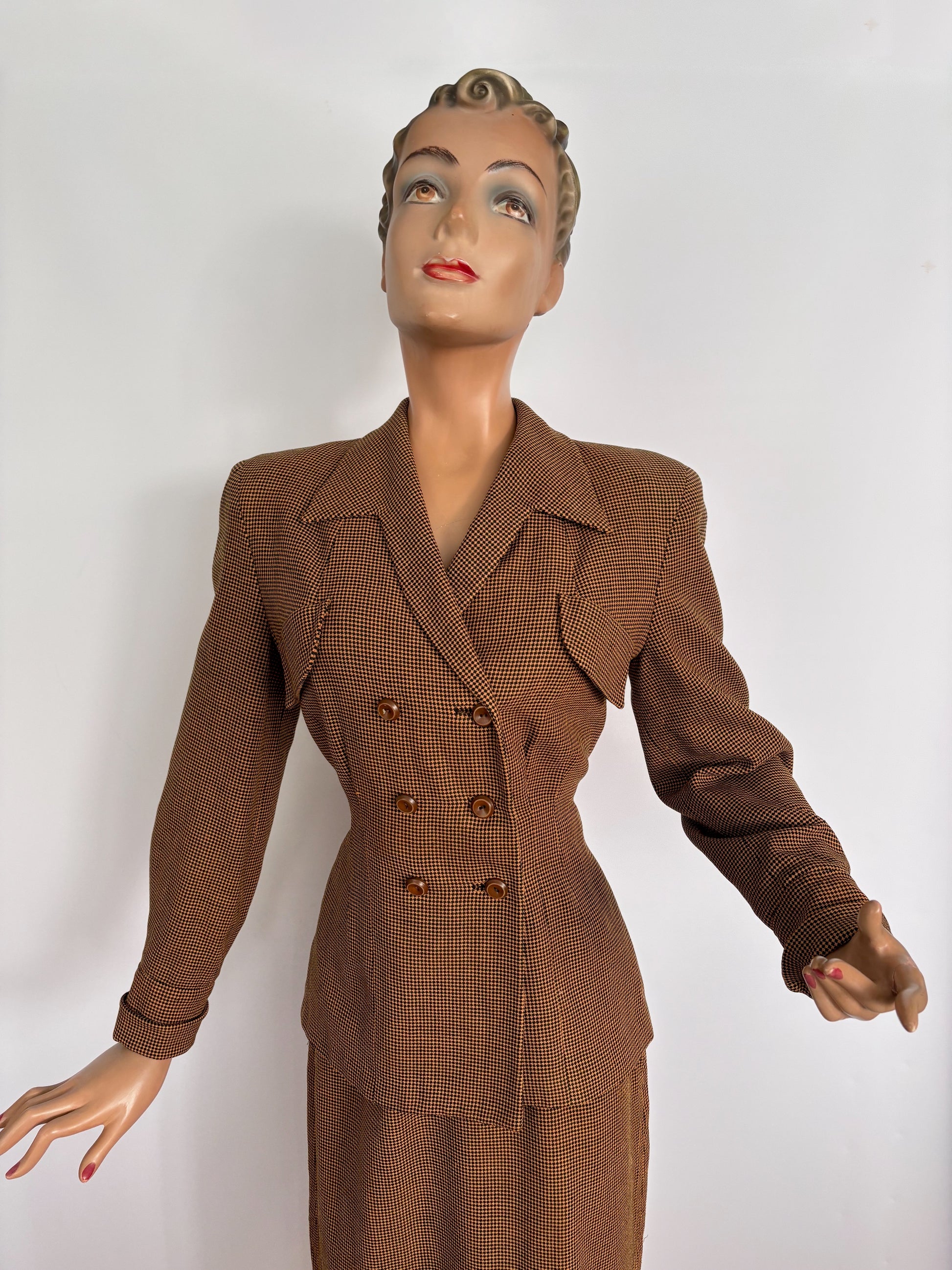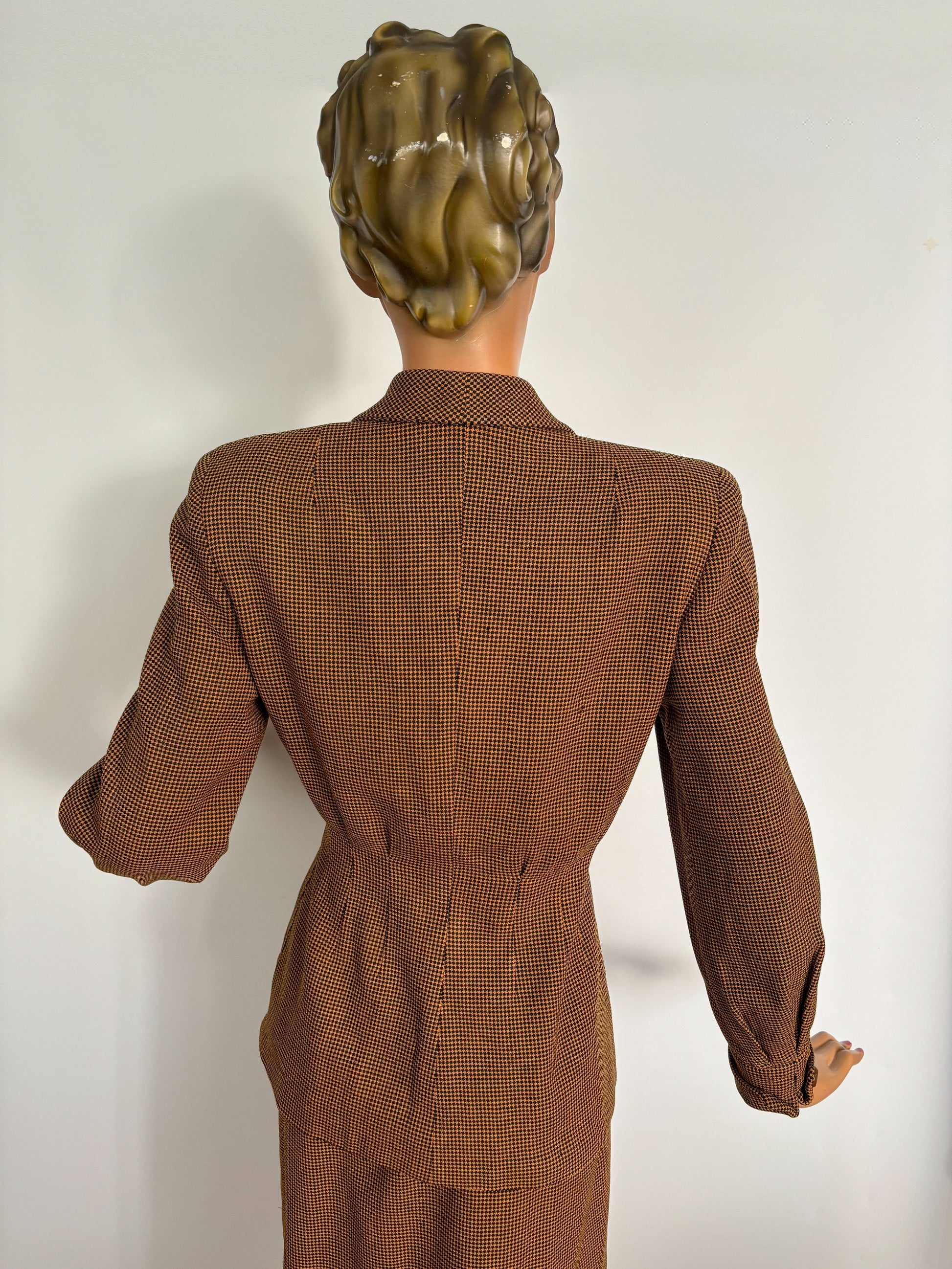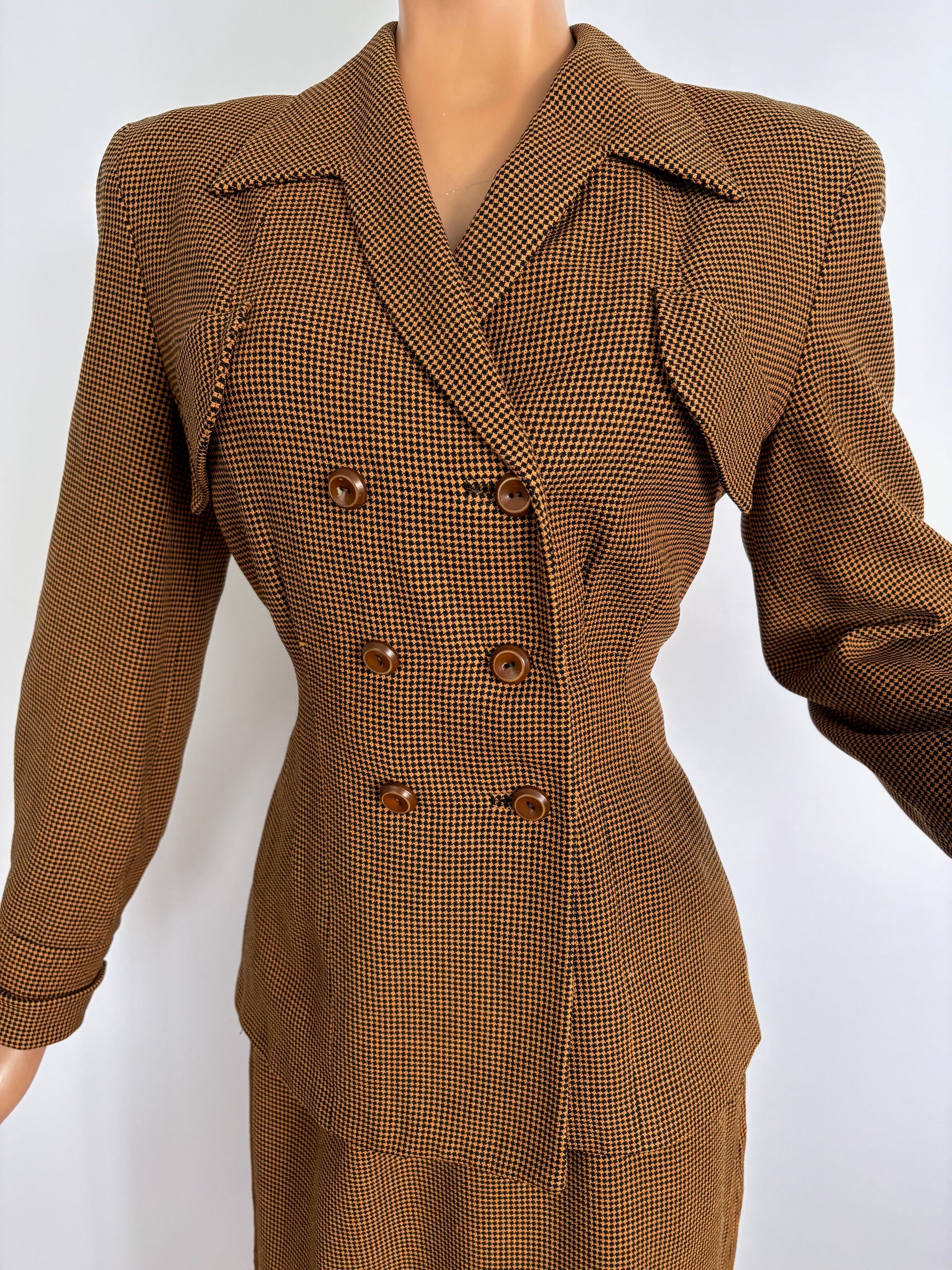 Two-piece 1940s women’s suit consisting of a jacket and matching skirt. Made from wool gabardine with a fine houndstooth pattern in a warm brown tone. The jacket has a strong period silhouette with pronounced shoulder padding and a sharply defined waist.