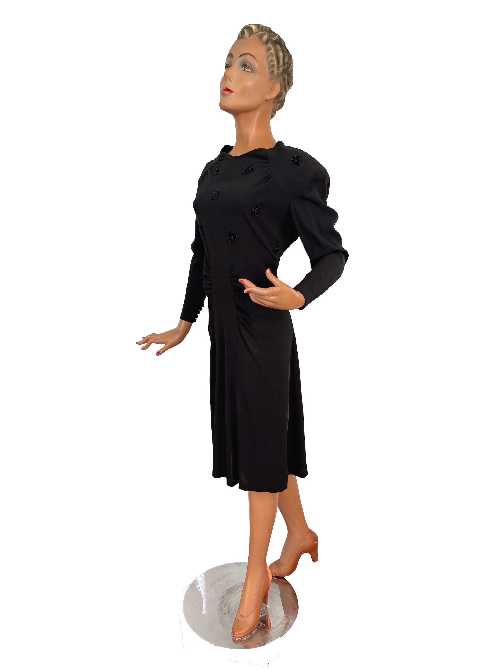 Black crepe dress from the 1940s with small velvet appliqués at the bodice front and back. The dress has a square neckline with soft pleating running from the neckline toward the shoulders and sleeves. The waist has gathered draping panels that frame a smooth center front section. The skirt is lightly flared.