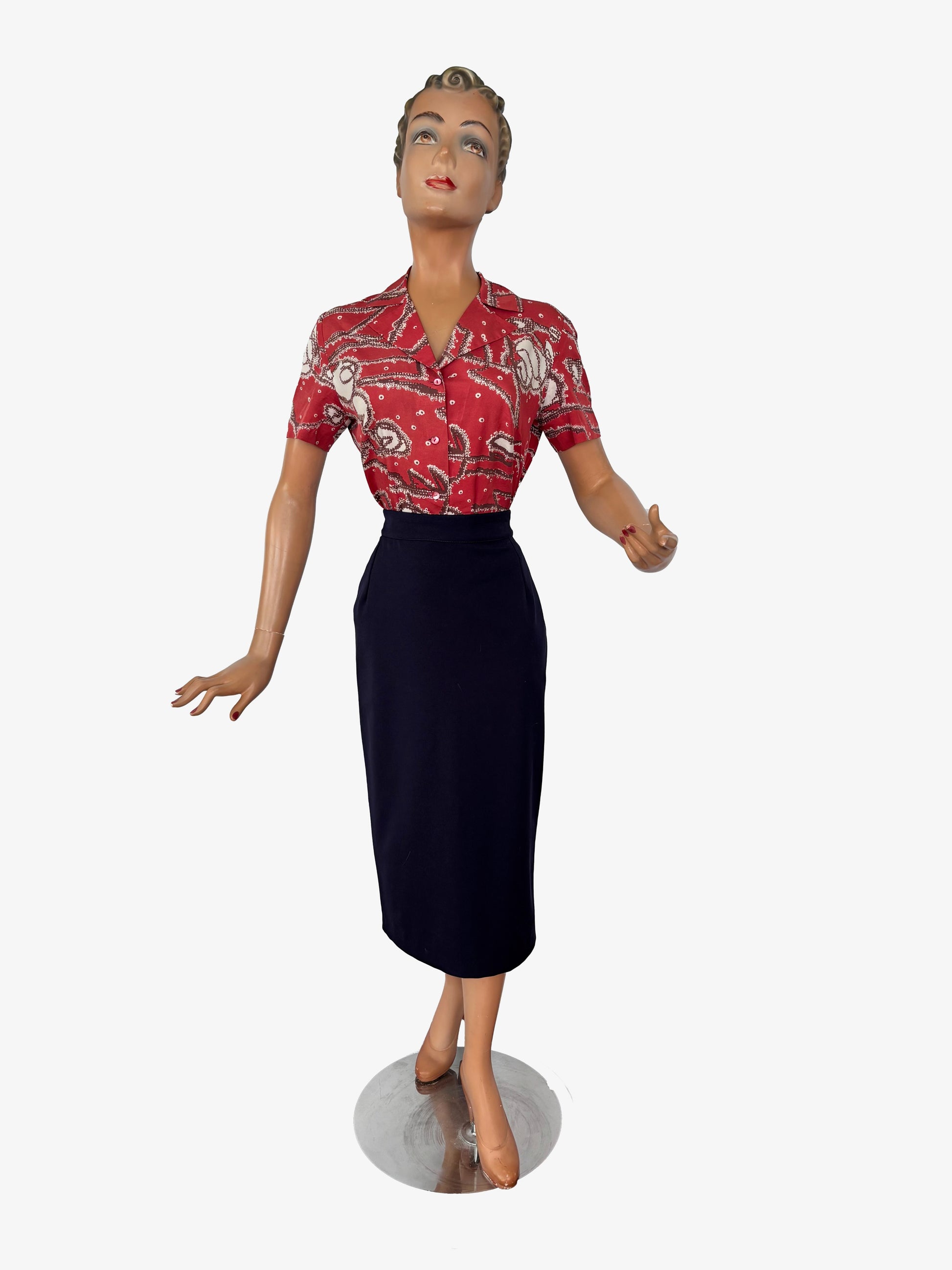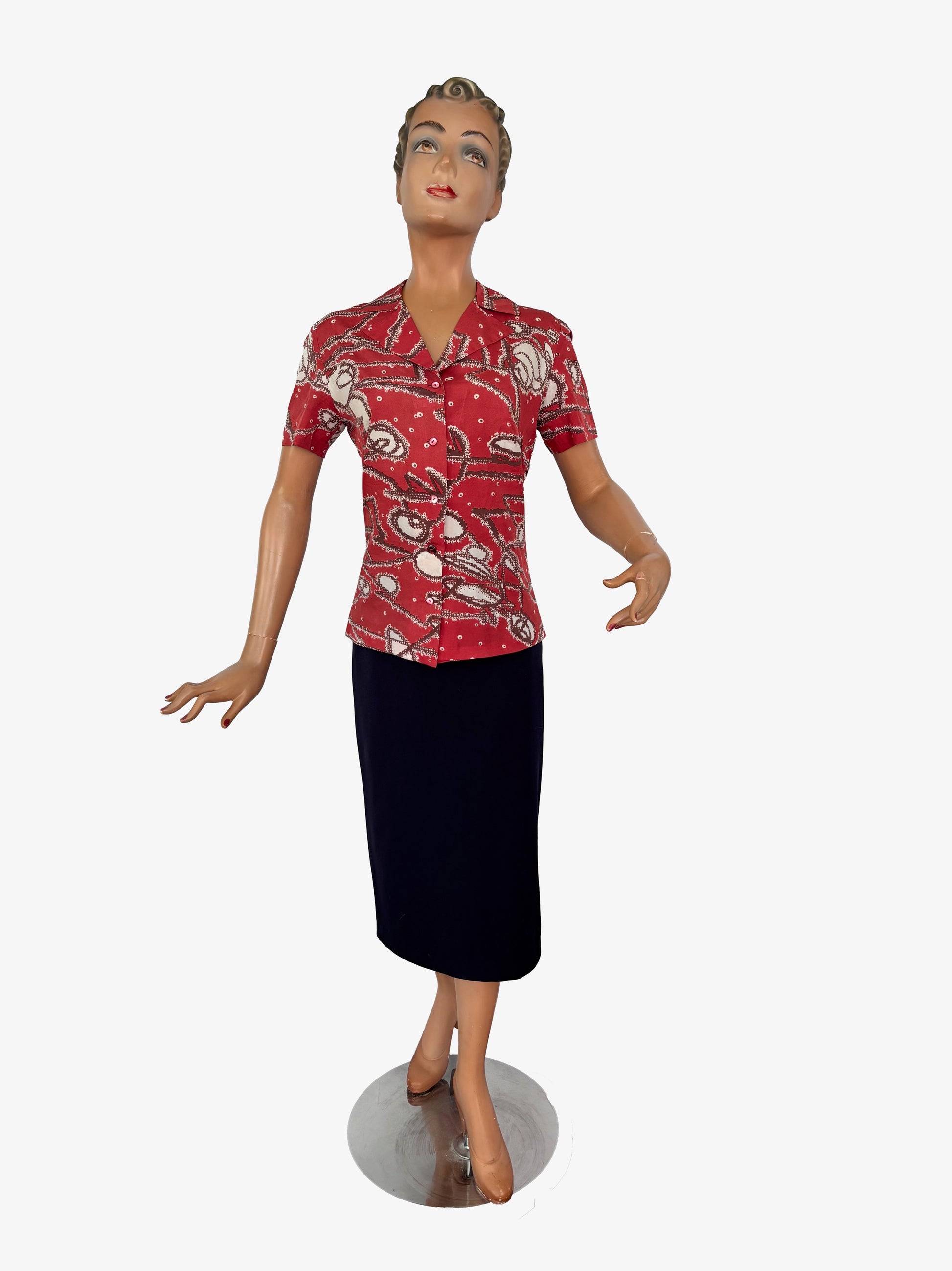 Early 1960s blouse with a vivid abstract print in deep red, brown and cream. Made from a smooth synthetic fabric, soft to the touch and comfortable to wear. The blouse has a classic open revere collar, short sleeves, and a full button front. Lightly tailored with darts at the bust and waist. The bottom button has been replaced.