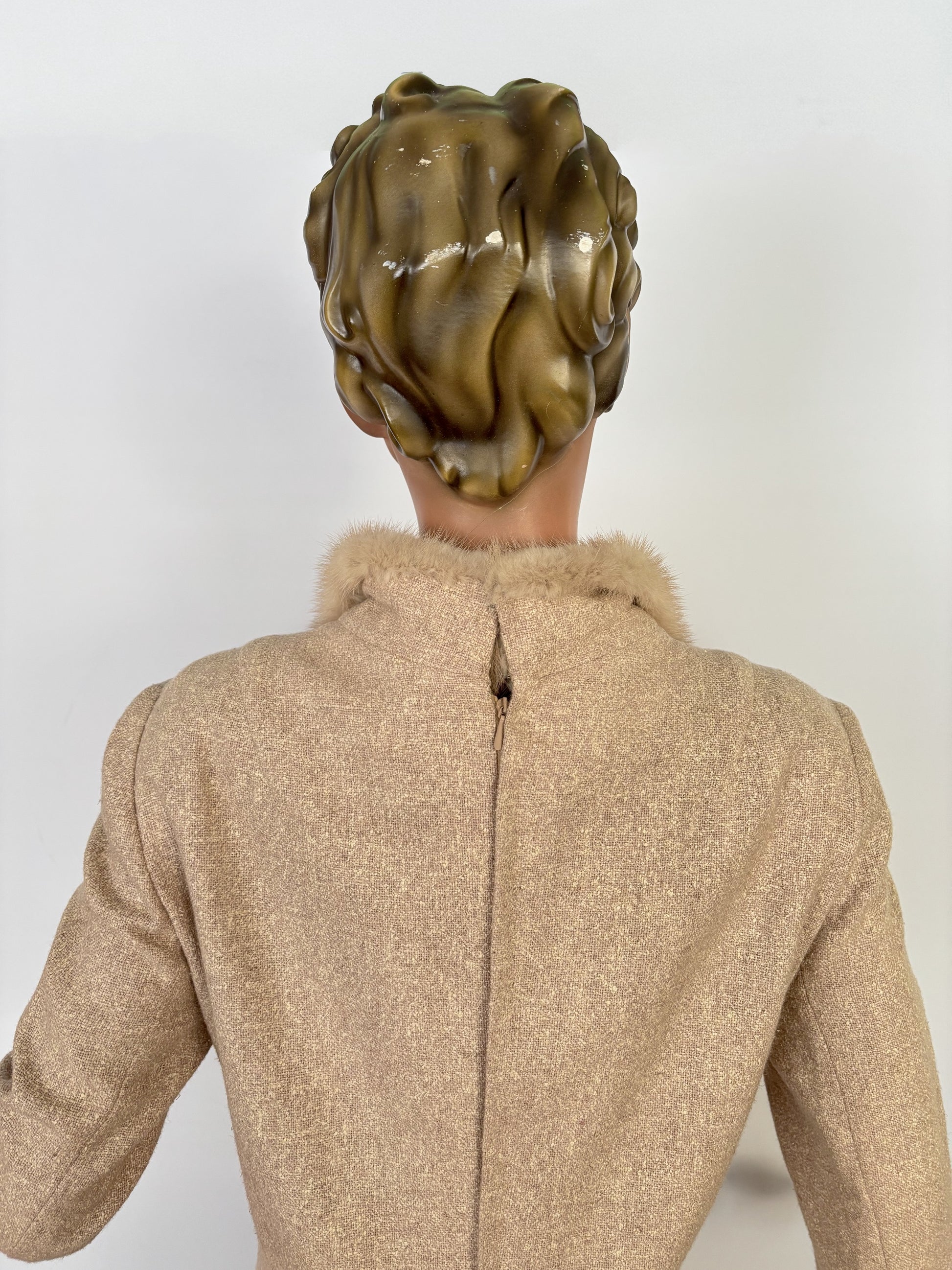 Late 1950s to early 1960s wool tweed dress in a beige/cream tone by Hirsch-Modell Berlin. The dress has a real mink collar and a deep V neckline with a short front placket. It closes with two fabric-covered buttons at the front and a metal zipper at the back. The bodice is shaped with stitched seam lines that form a pointed waistline at the front. It has long sleeves that taper slightly toward the cuffs. The skirt widens gently toward the hem. The dress is lined in the body; the sleeves are unlined.