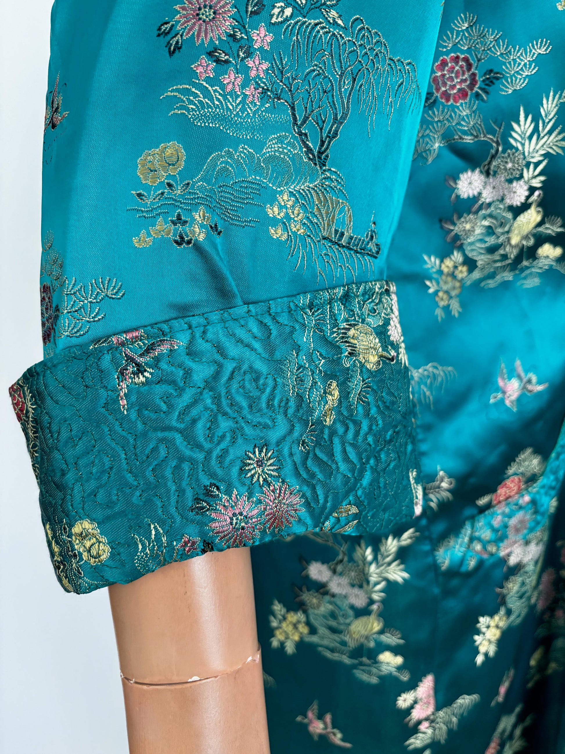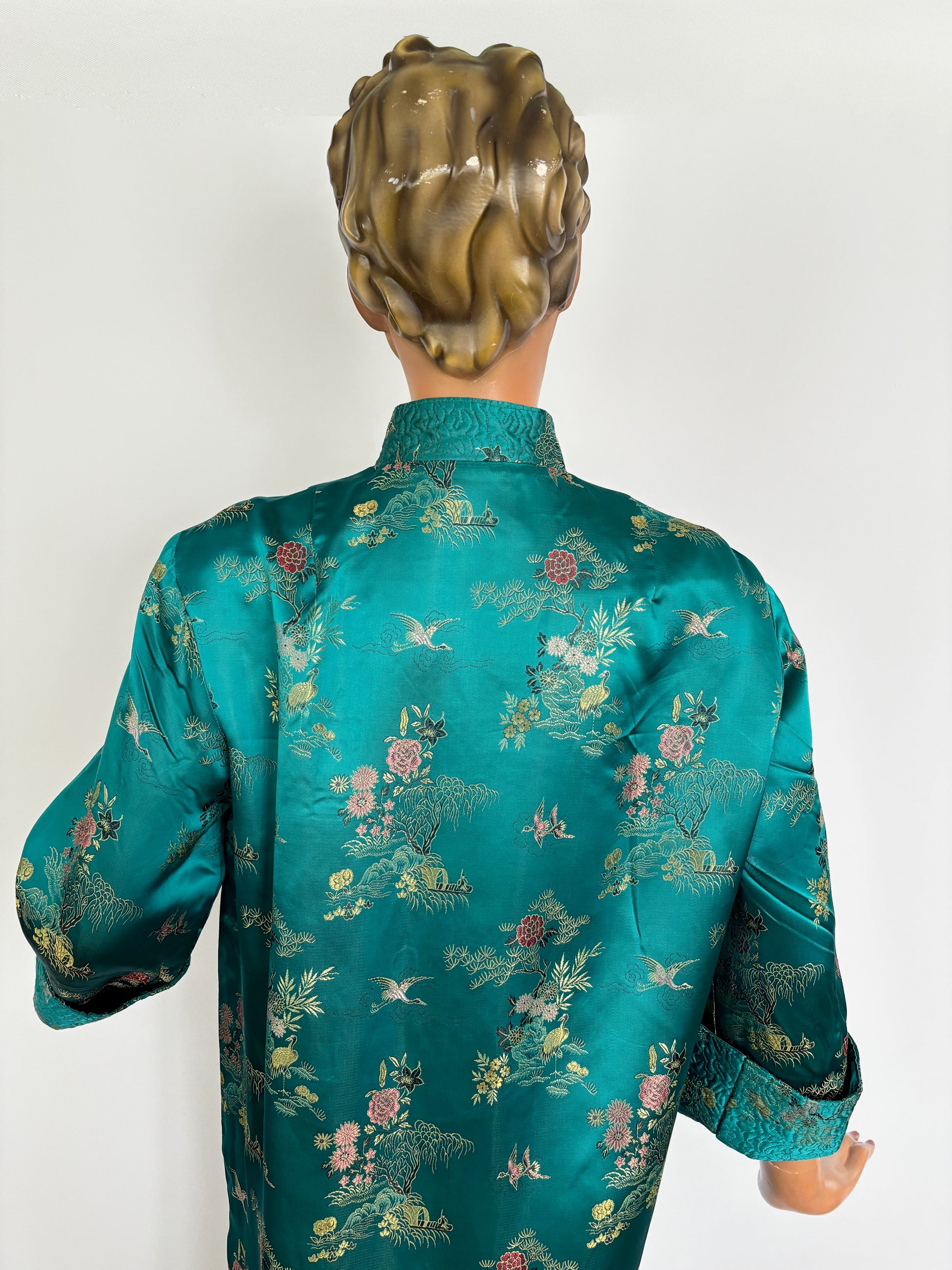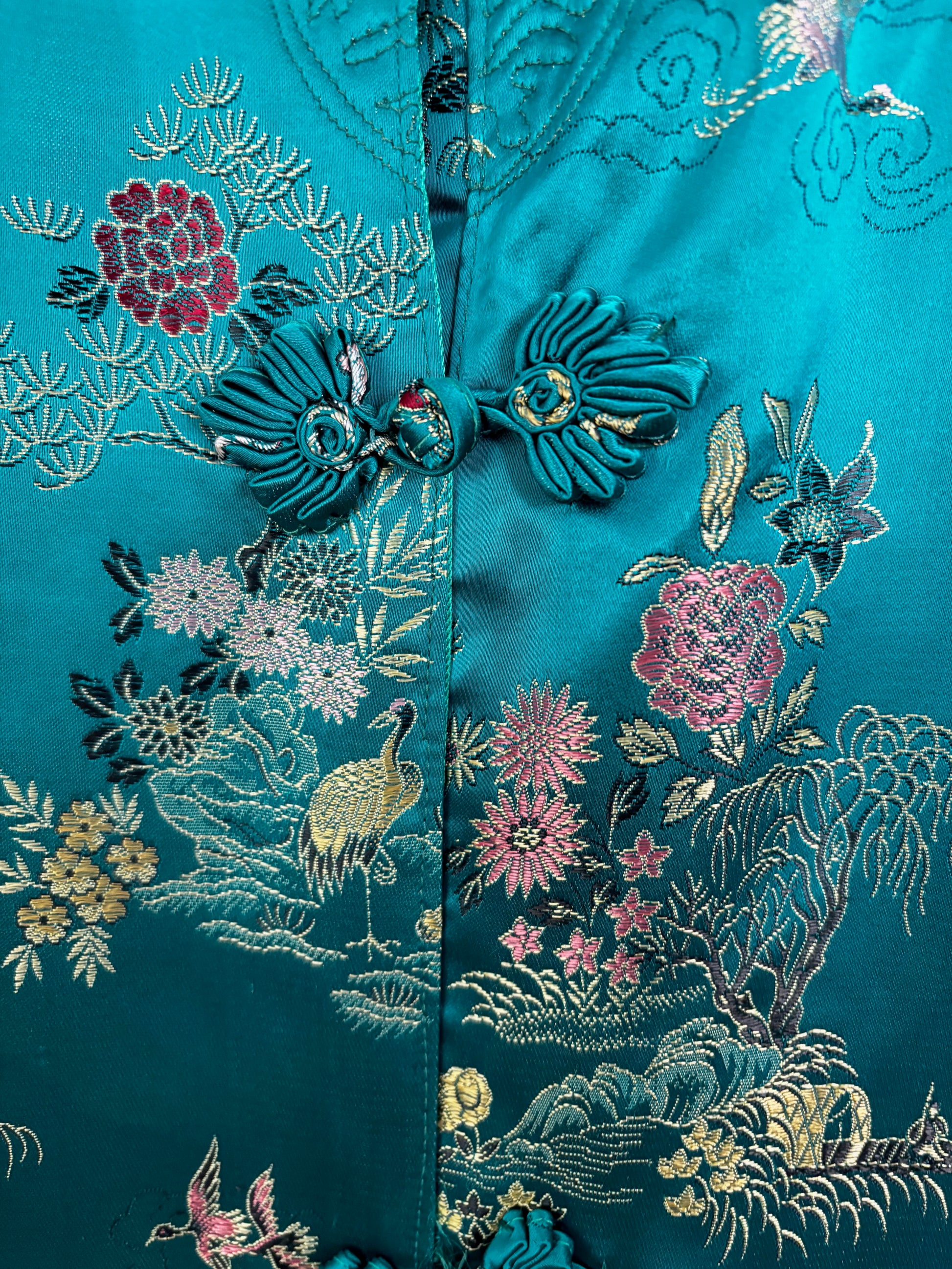 L/XL | 1950s Teal Green Satin Brocade Hostess Dress With Frog Closures