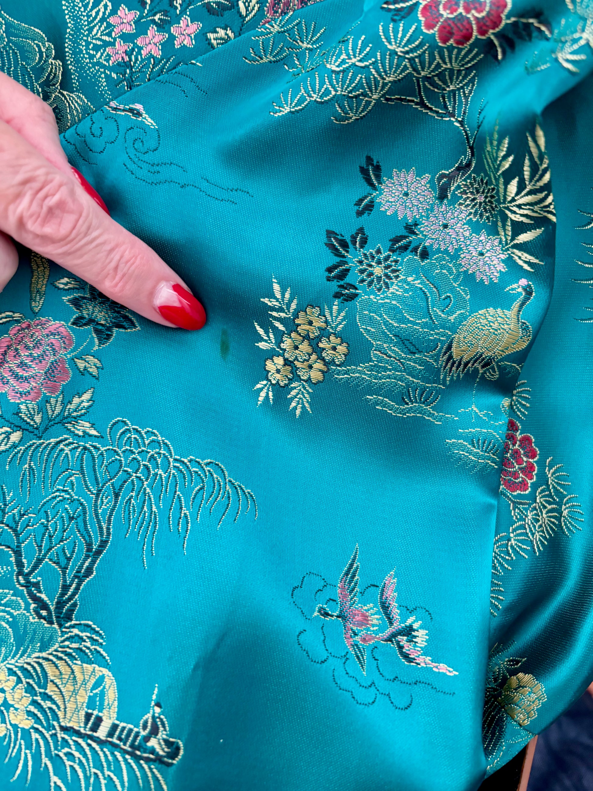 Elegant 1950s hostess dress in shimmering teal green satin brocade.