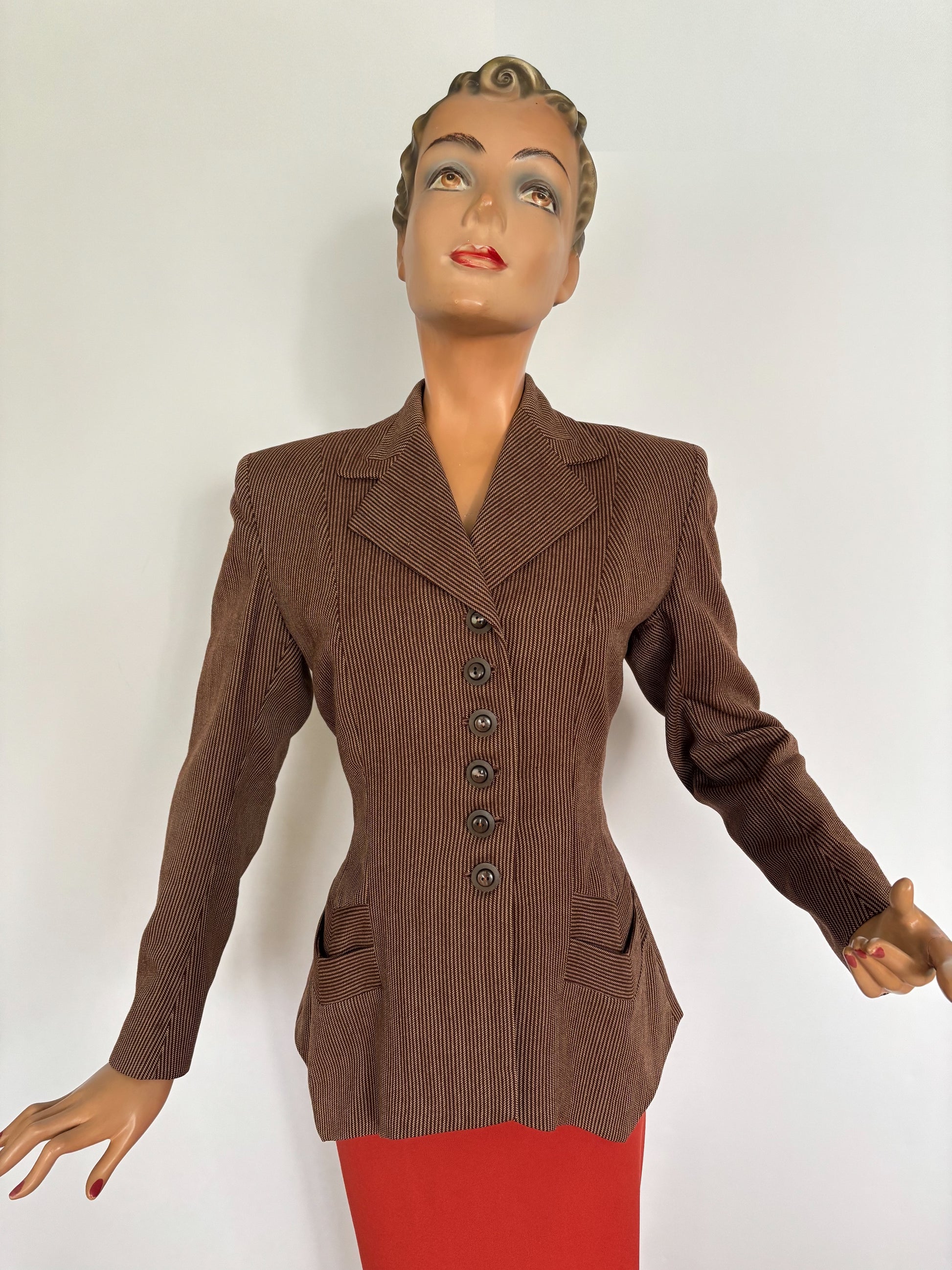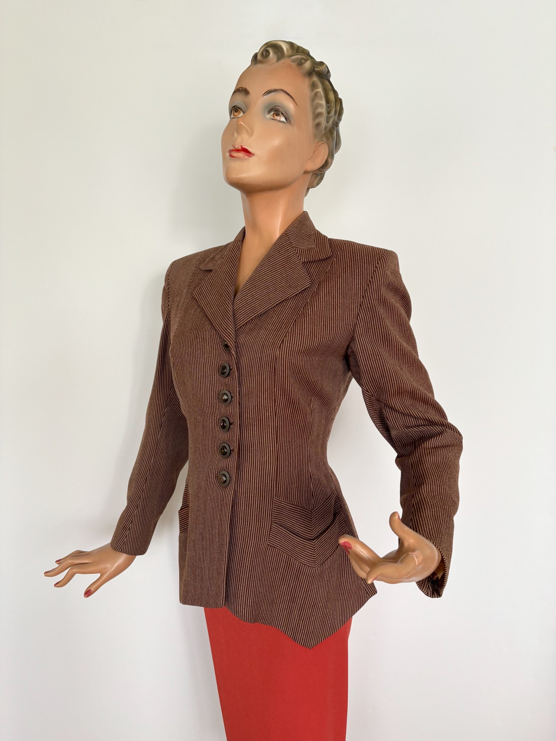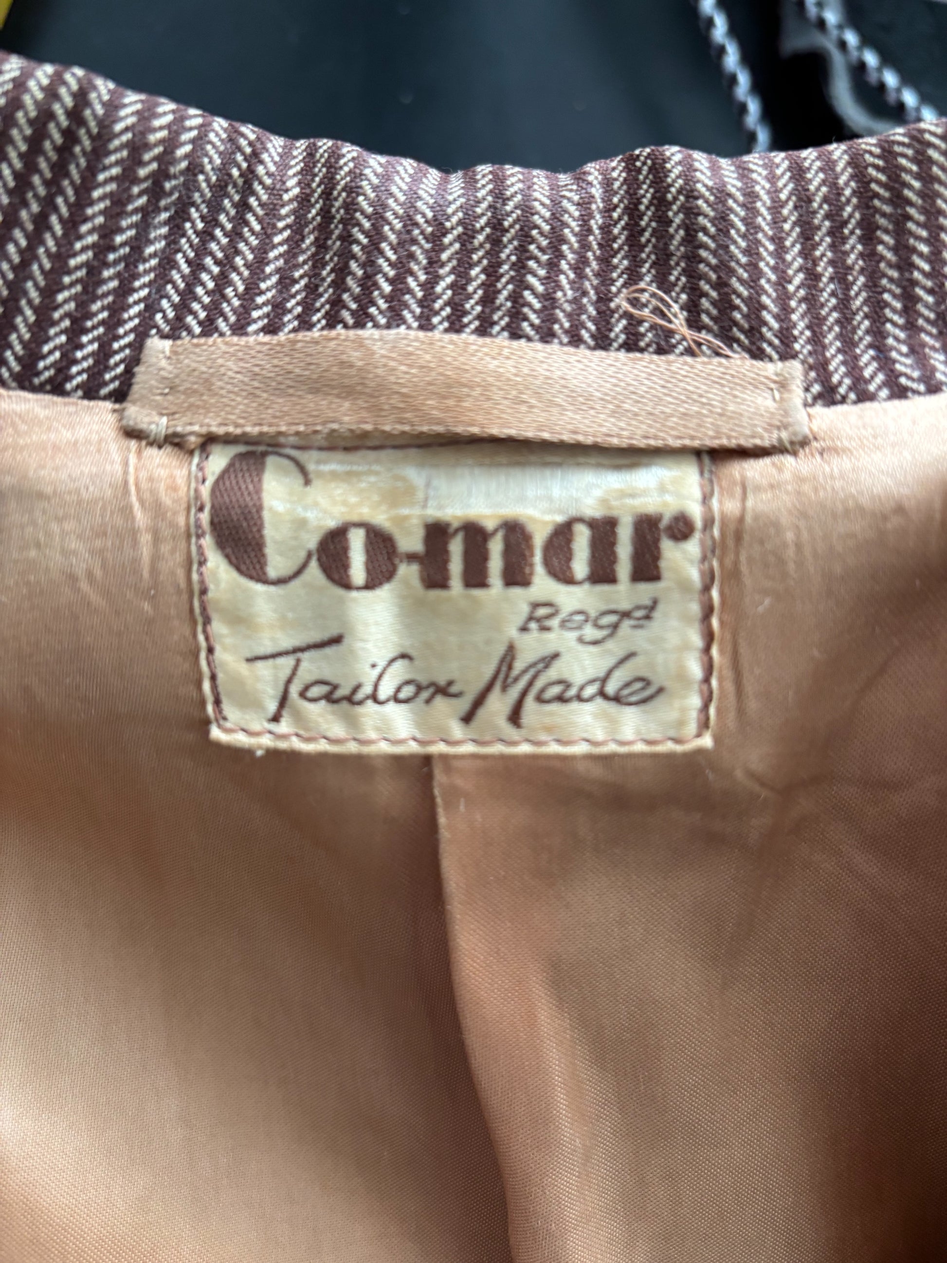 A beautiful tailored jacket from the 1940s, made from wool gabardine with a brown and beige herringbone stripe. Labeled Co-mar Regd – Tailor Made. The fabric pattern is carefully matched at the collar and pockets.