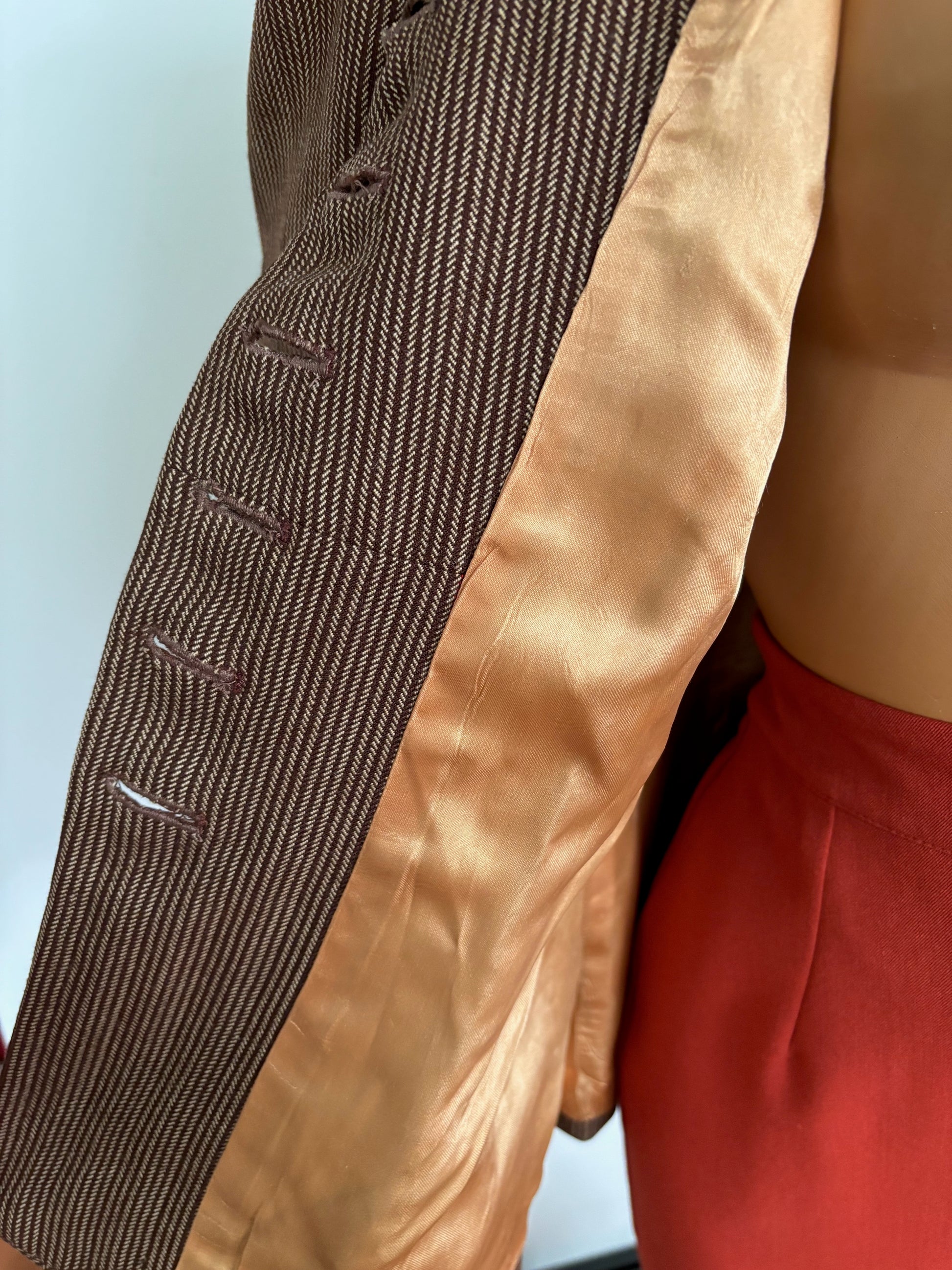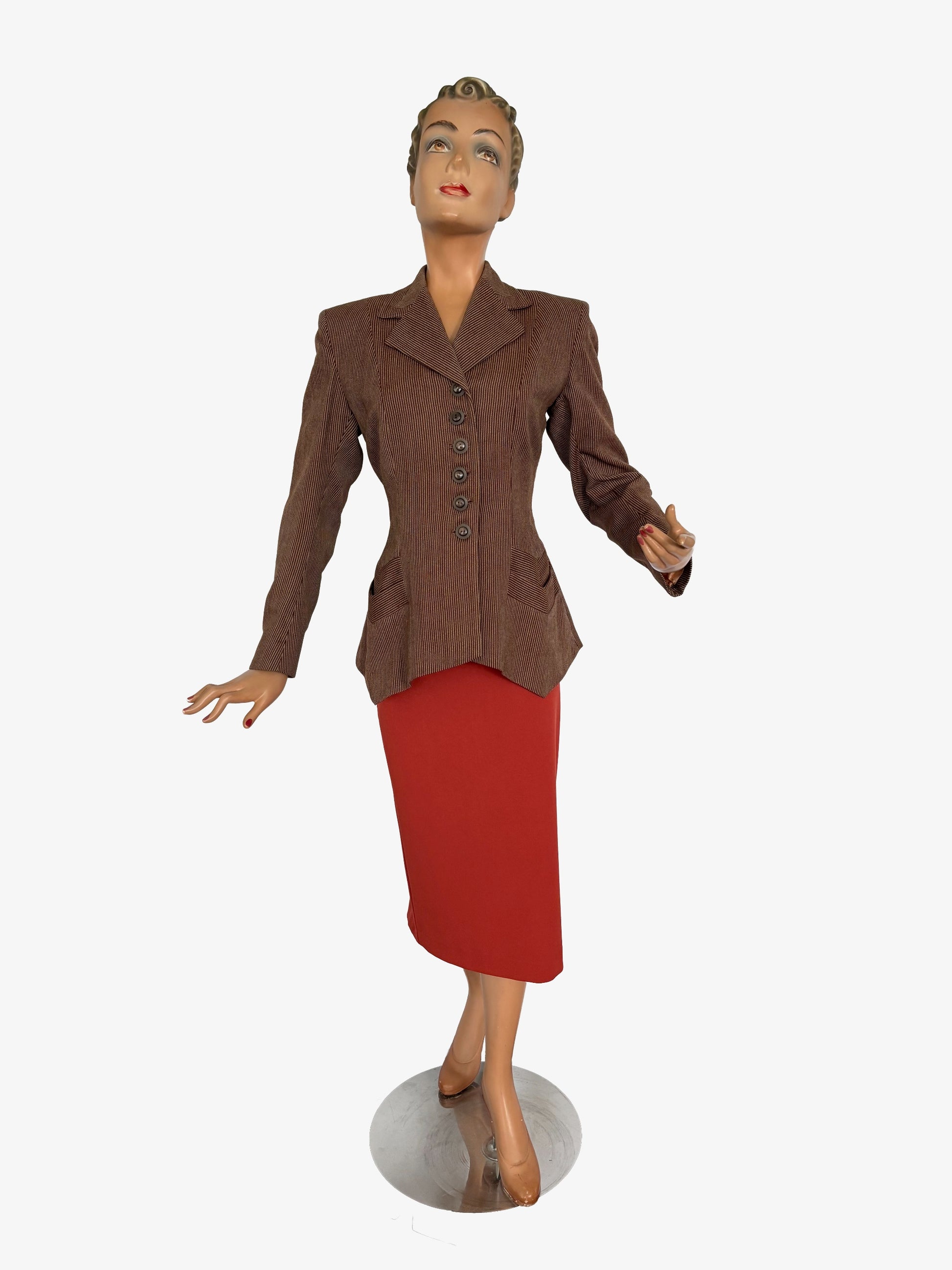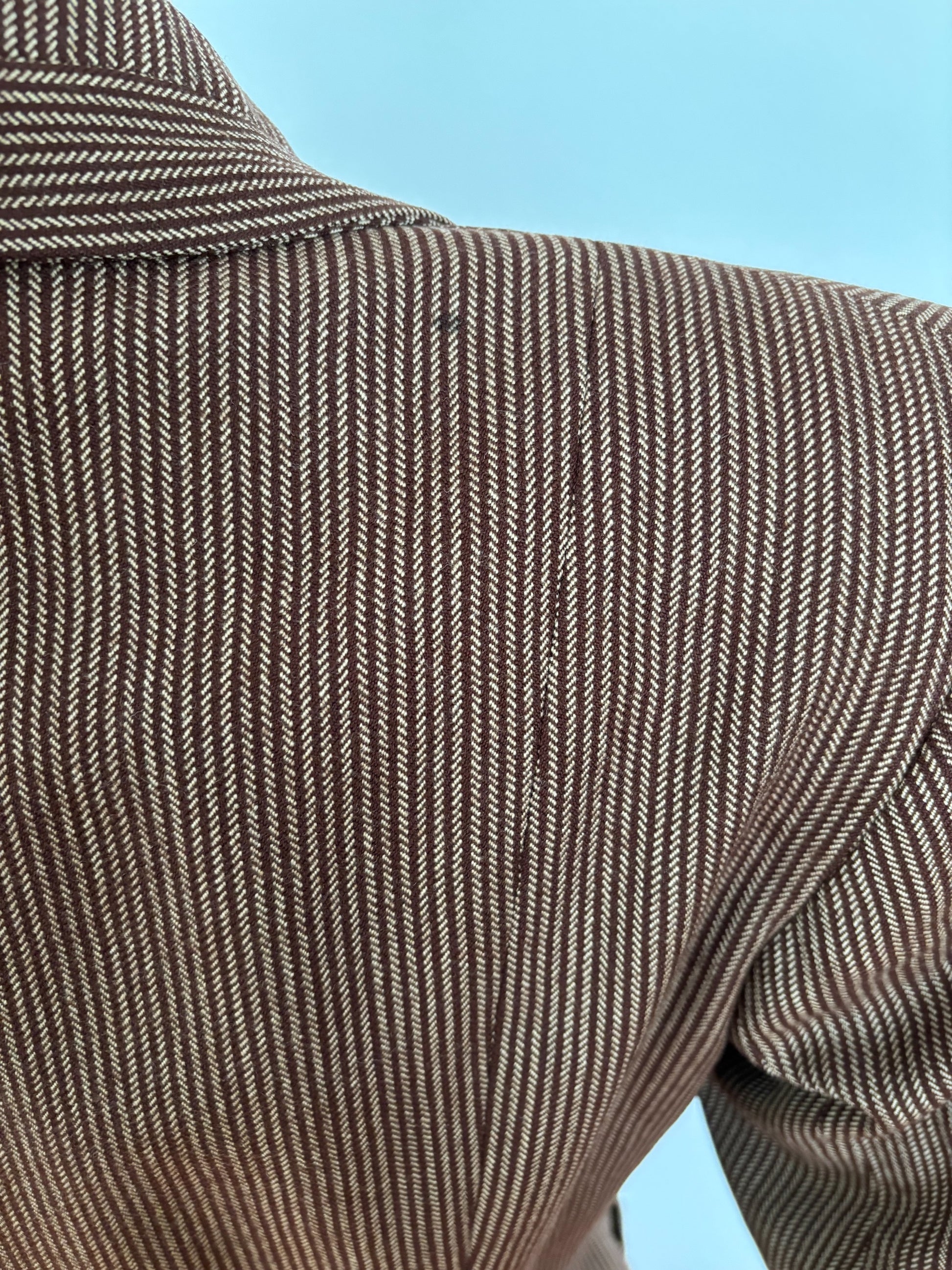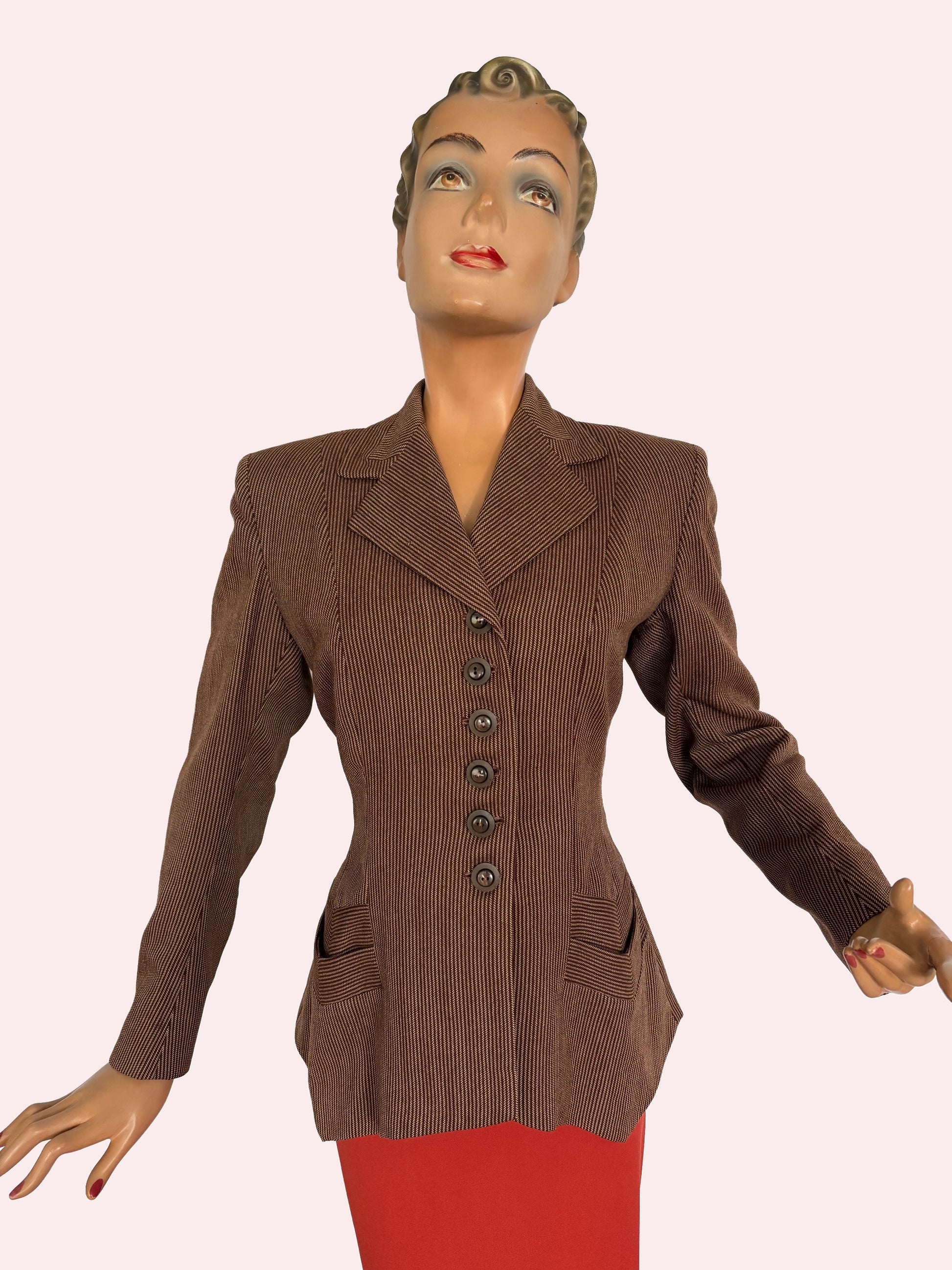 A beautiful tailored jacket from the 1940s, made from wool gabardine with a brown and beige herringbone stripe. Labeled Co-mar Regd – Tailor Made. The fabric pattern is carefully matched at the collar and pockets.