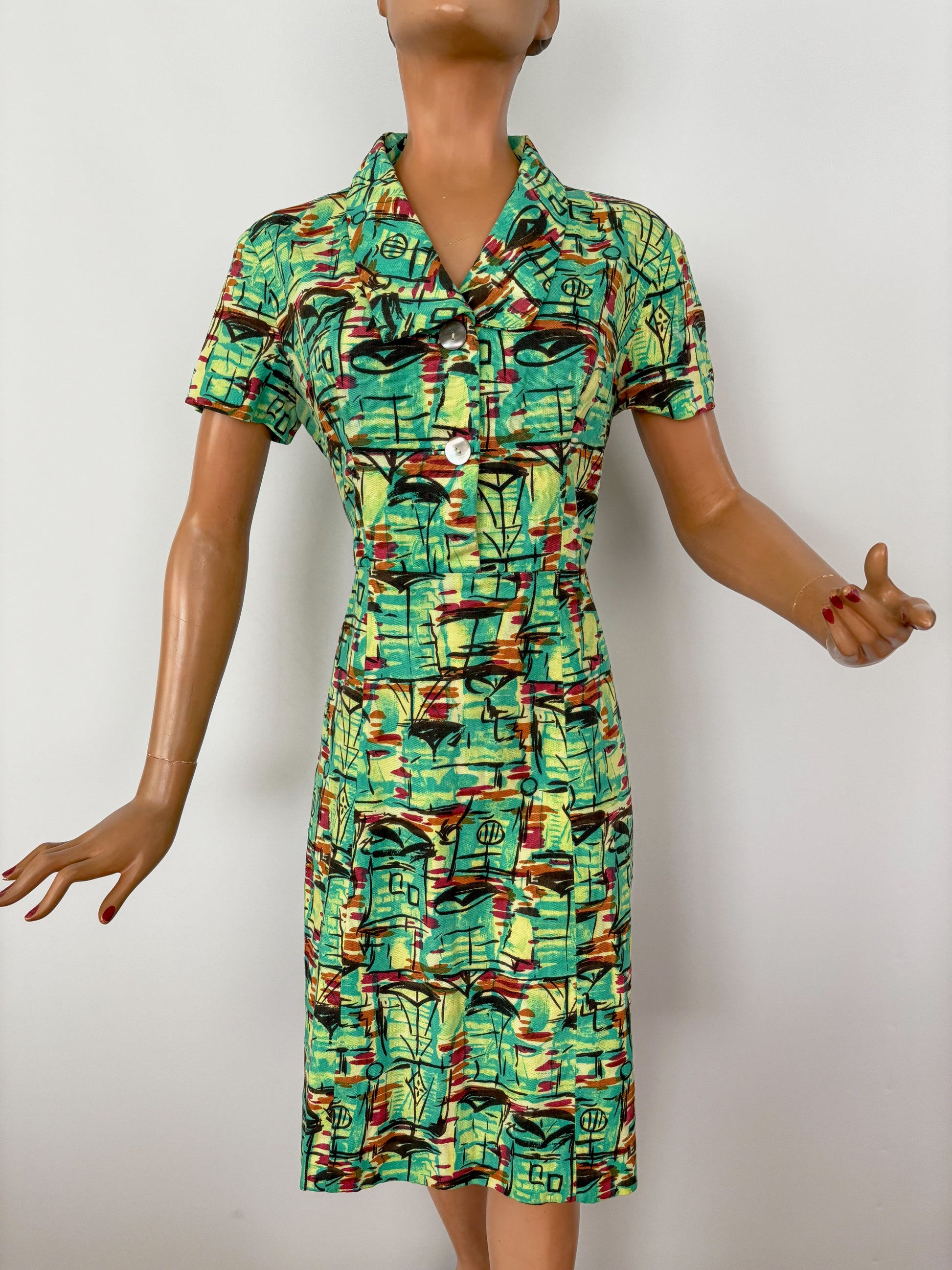 Mid-1950s day dress made of woven cotton with a cool atomic-style novelty print in turquoise green, yellow, black, rust and raspberry tones. The print features abstract mid-century modern shapes reminiscent of tiki or tropical motifs. The colours are still bright and crisp.