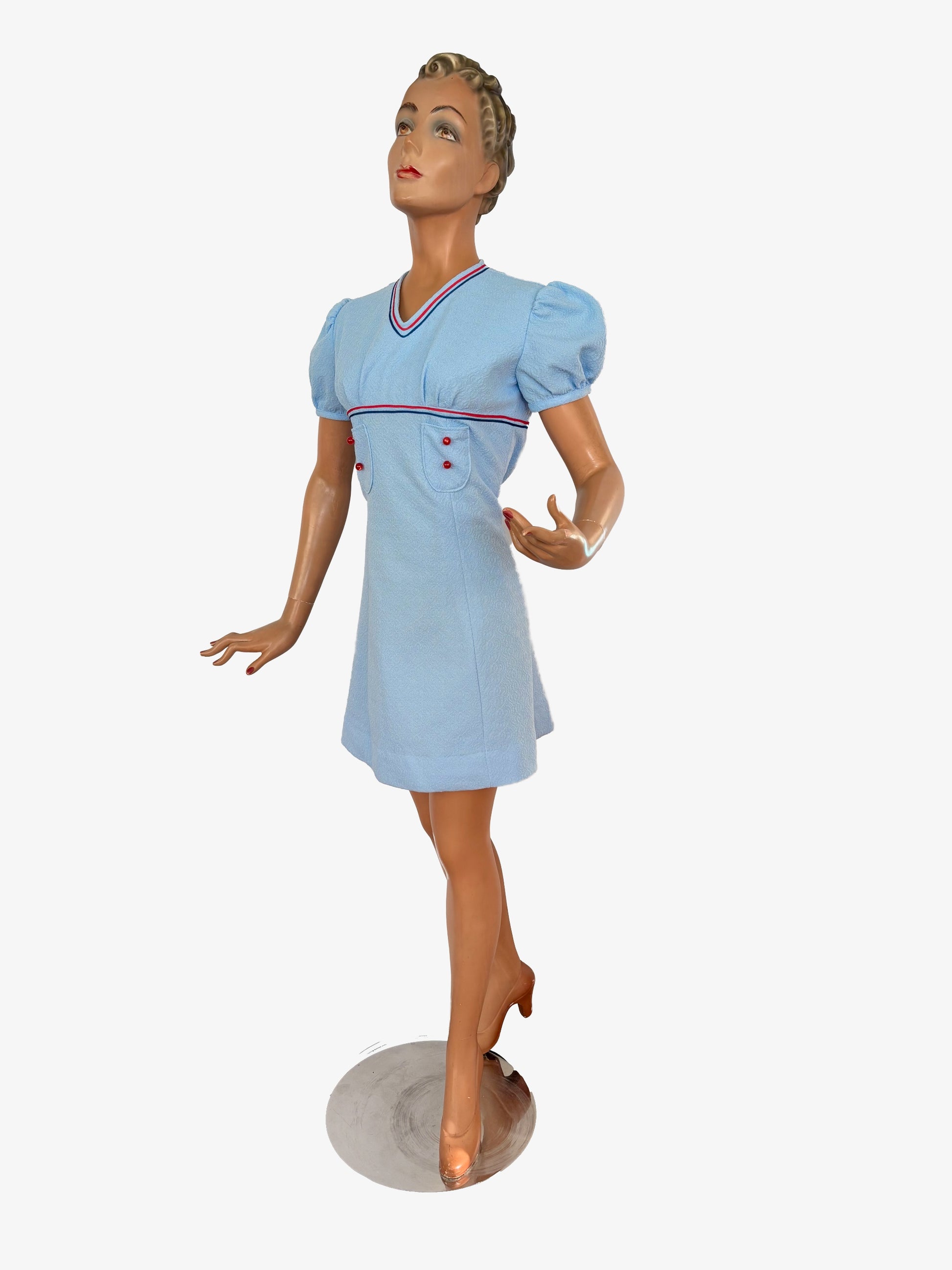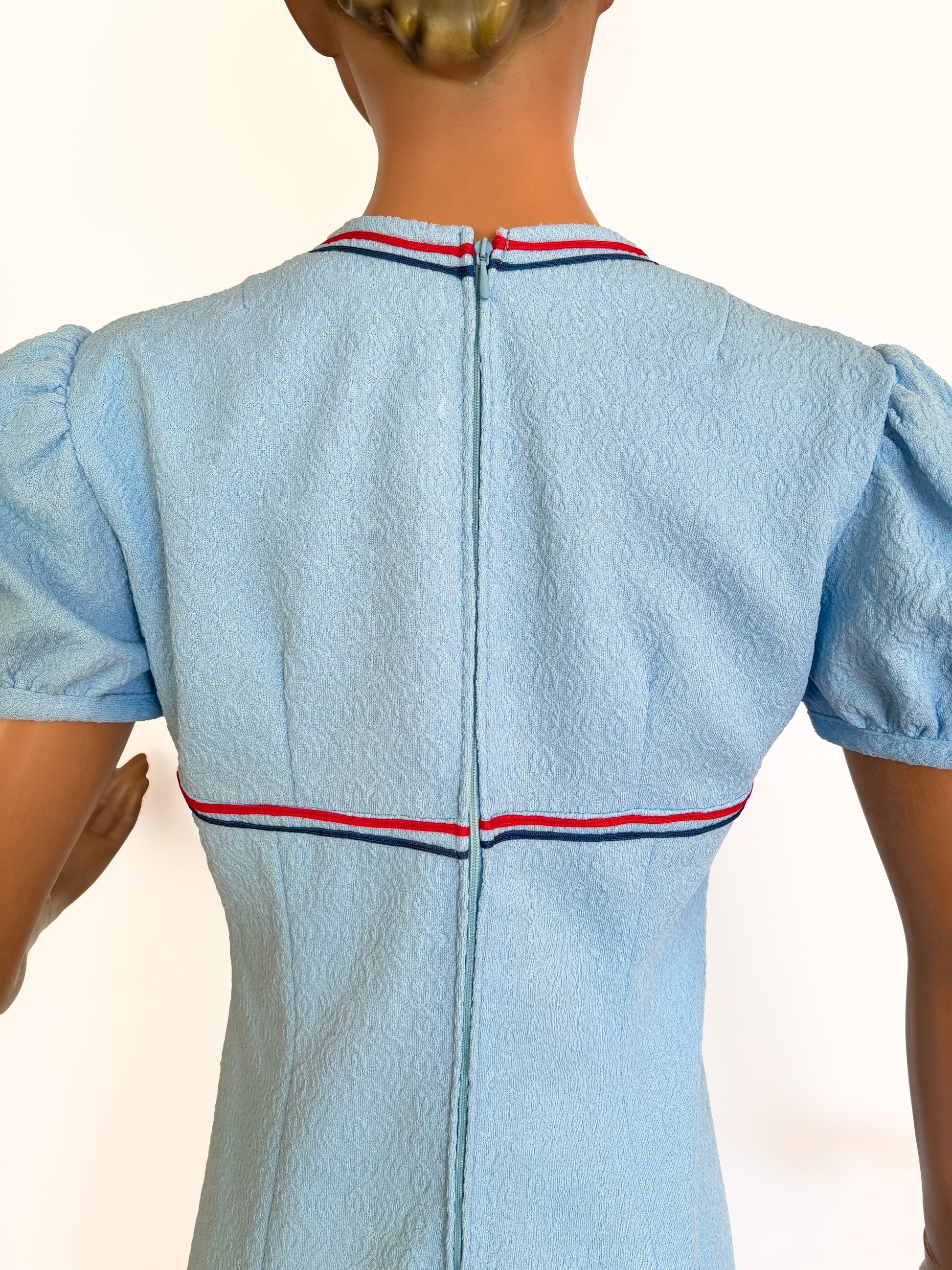Cute 1960s mod-style mini dress in light blue synthetic structured fabric with red and navy contrast trim. The dress has a V-neckline, short puff sleeves, and two small decorative front tabs with red buttons. It has darts at the bust and back, creating a gently flared A-line shape. The dress closes with a long zipper at the back and is fully lined, except for the sleeves. The fabric has a slight stretch.