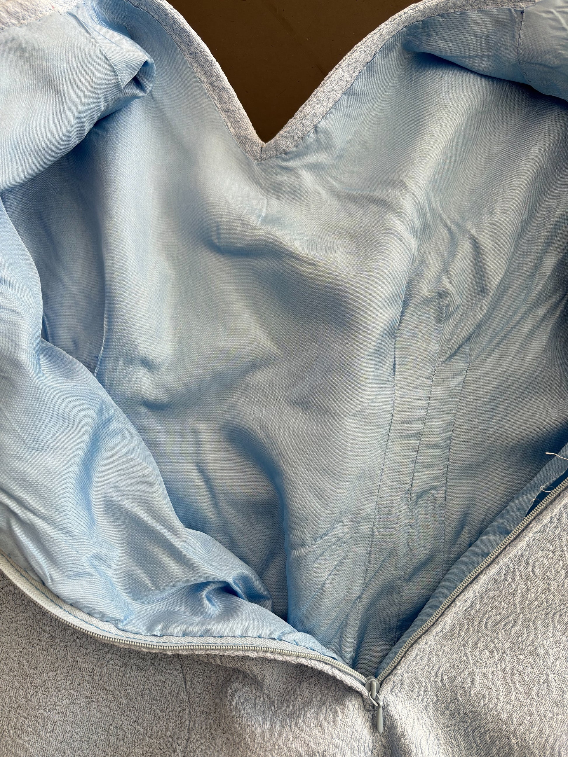 The color appears lighter and slightly washed out in the photos; in real life the dress has a richer baby blue tone.