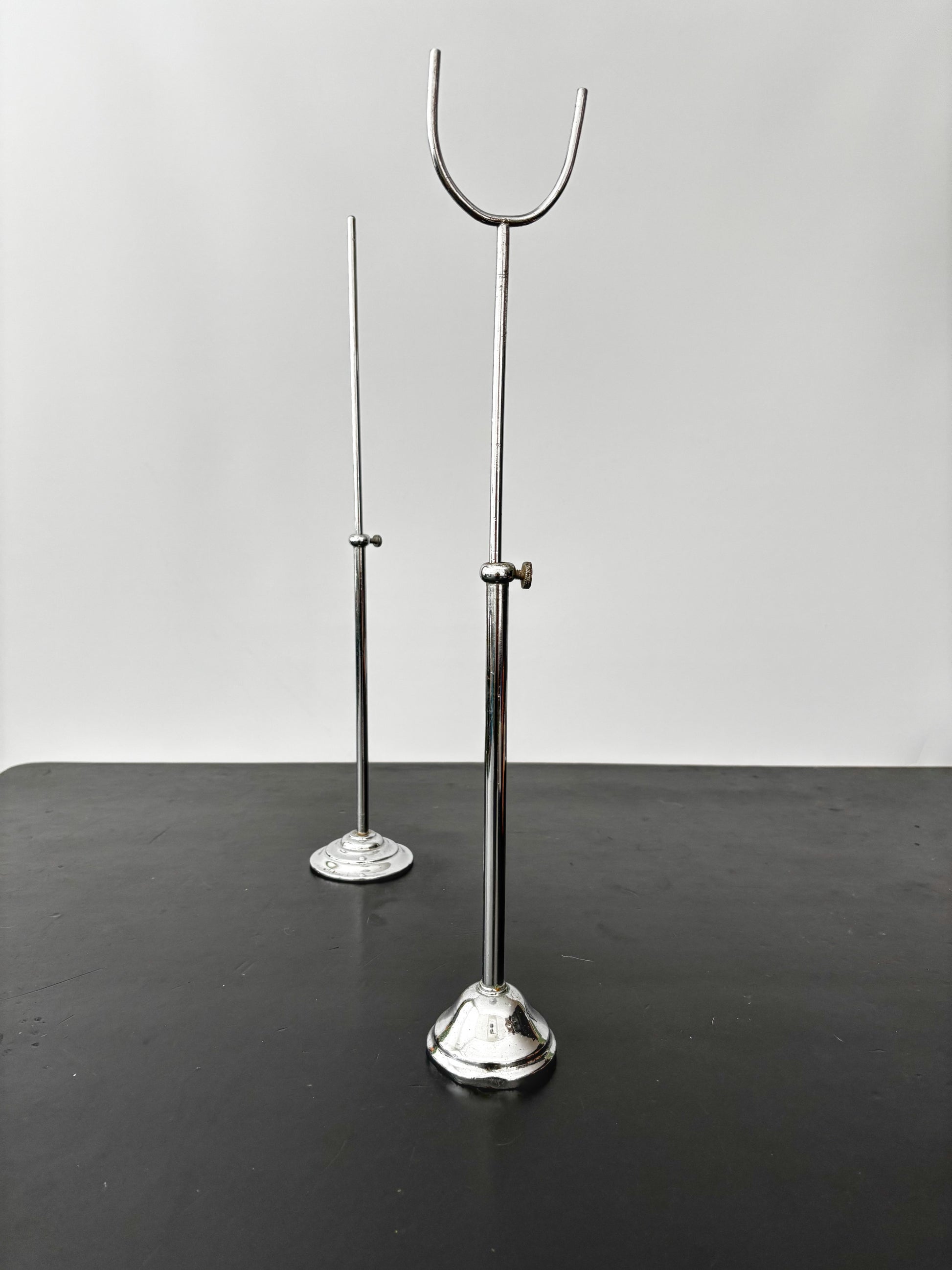 Pair of original shop display stands dating from the 1920s–1930s. Both are made of metal with a chrome finish and have adjustable height secured with a screw. One has a straight post top, while the other has a U-shaped top, likely intended for hats, small mannequins, or accessories. These stands were typically used in shops and millinery displays for hats, scarves, gloves, or other fashion items.
