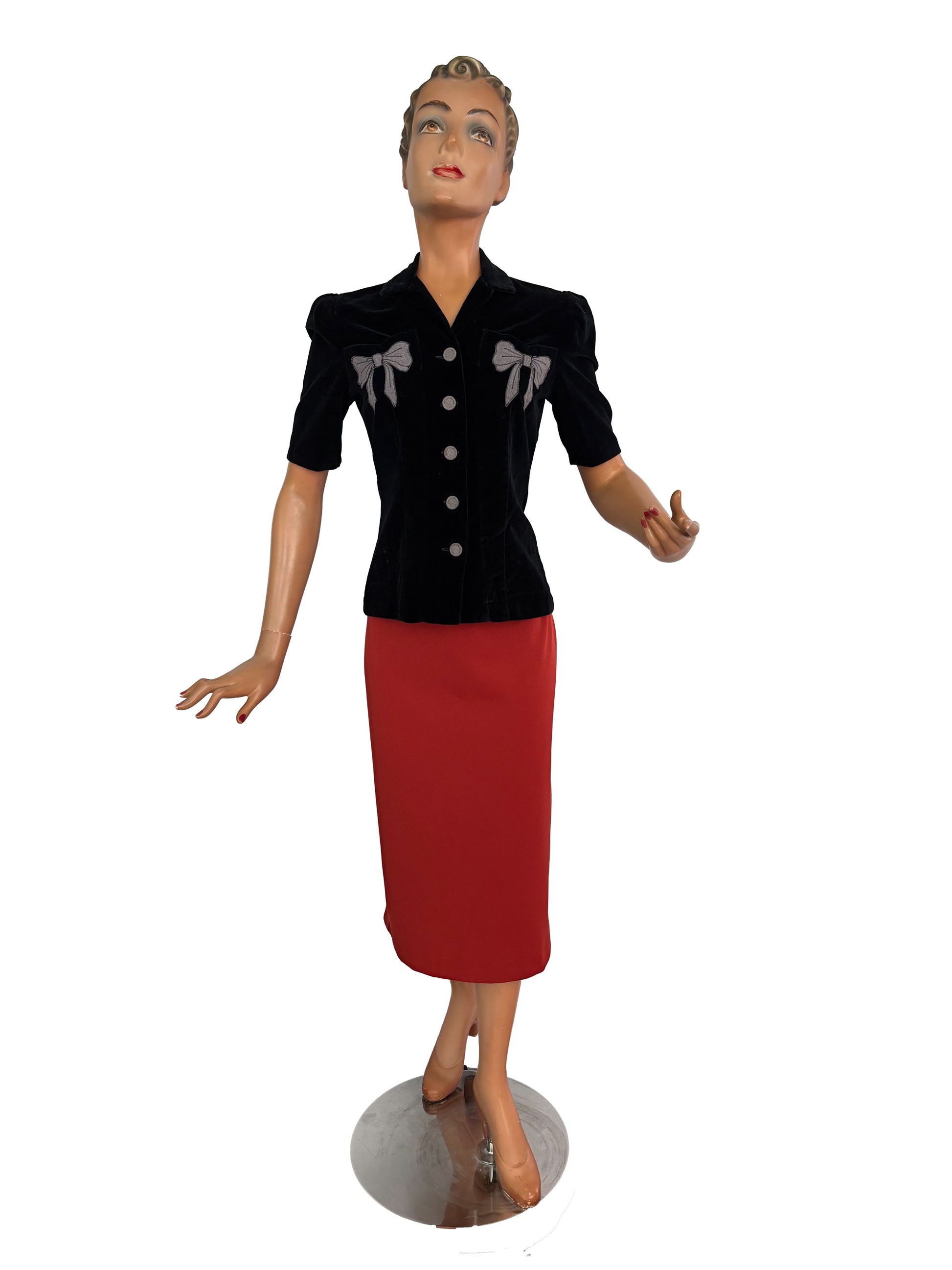 A very pretty 1940s black velvet jacket with two large gray fabric bows applied to the front. It has a button closure with fabric-covered buttons in the same material as the bows. The short sleeves have small shoulder pads, and it comes with an open collar. Bust darts and tailoring at front and back give it shape.