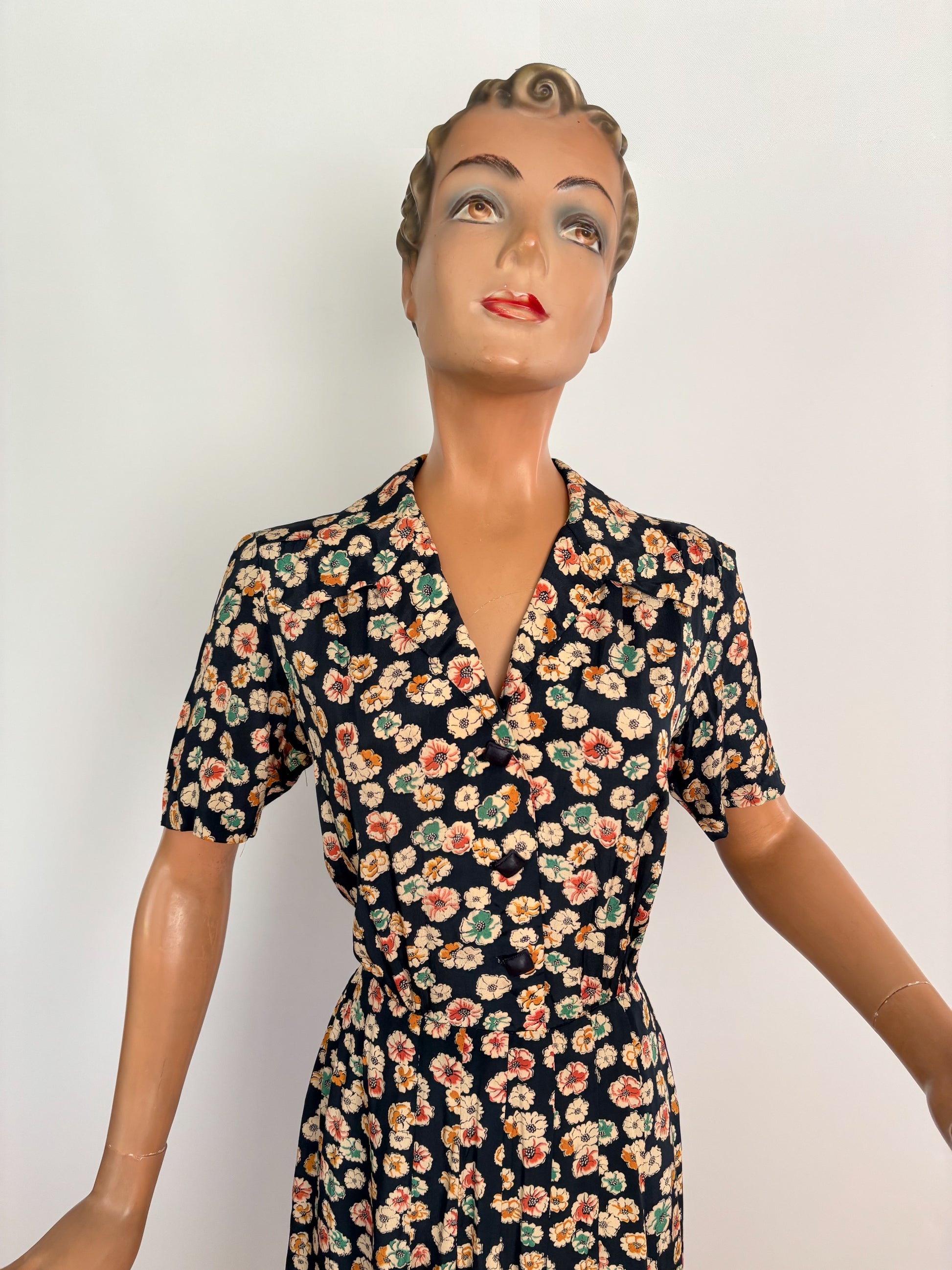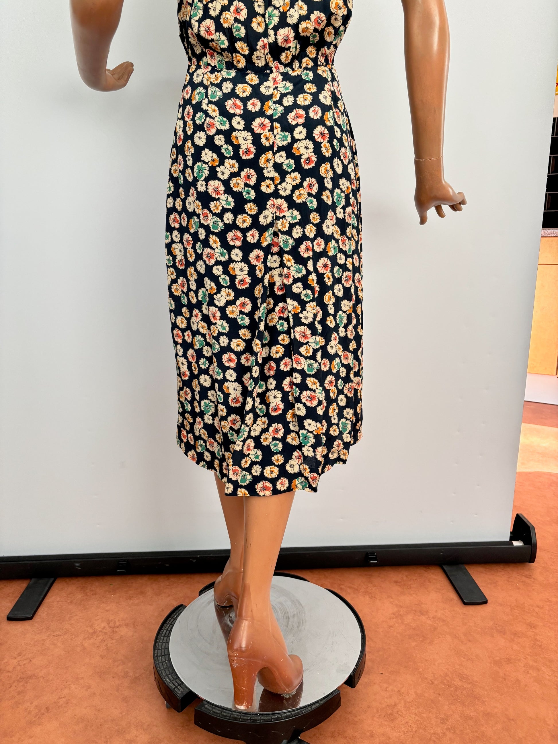 A beautiful 1940s rayon day dress in dark blue with an allover floral print. The dress has a revere collar, short sleeves, and a shaped waist seam with pleats at the skirt. The skirt is lined and has stitched flat pleats at the back, transitioning into a box pleat from the hip. It closes with a metal side zipper.