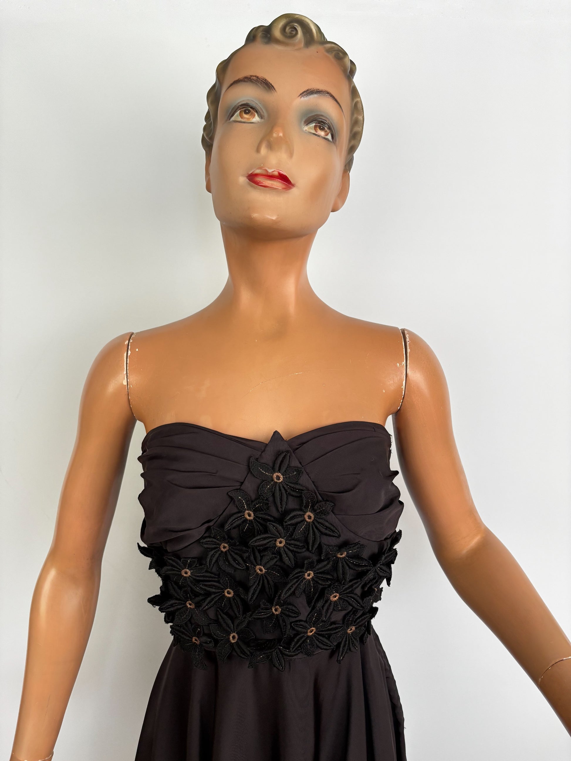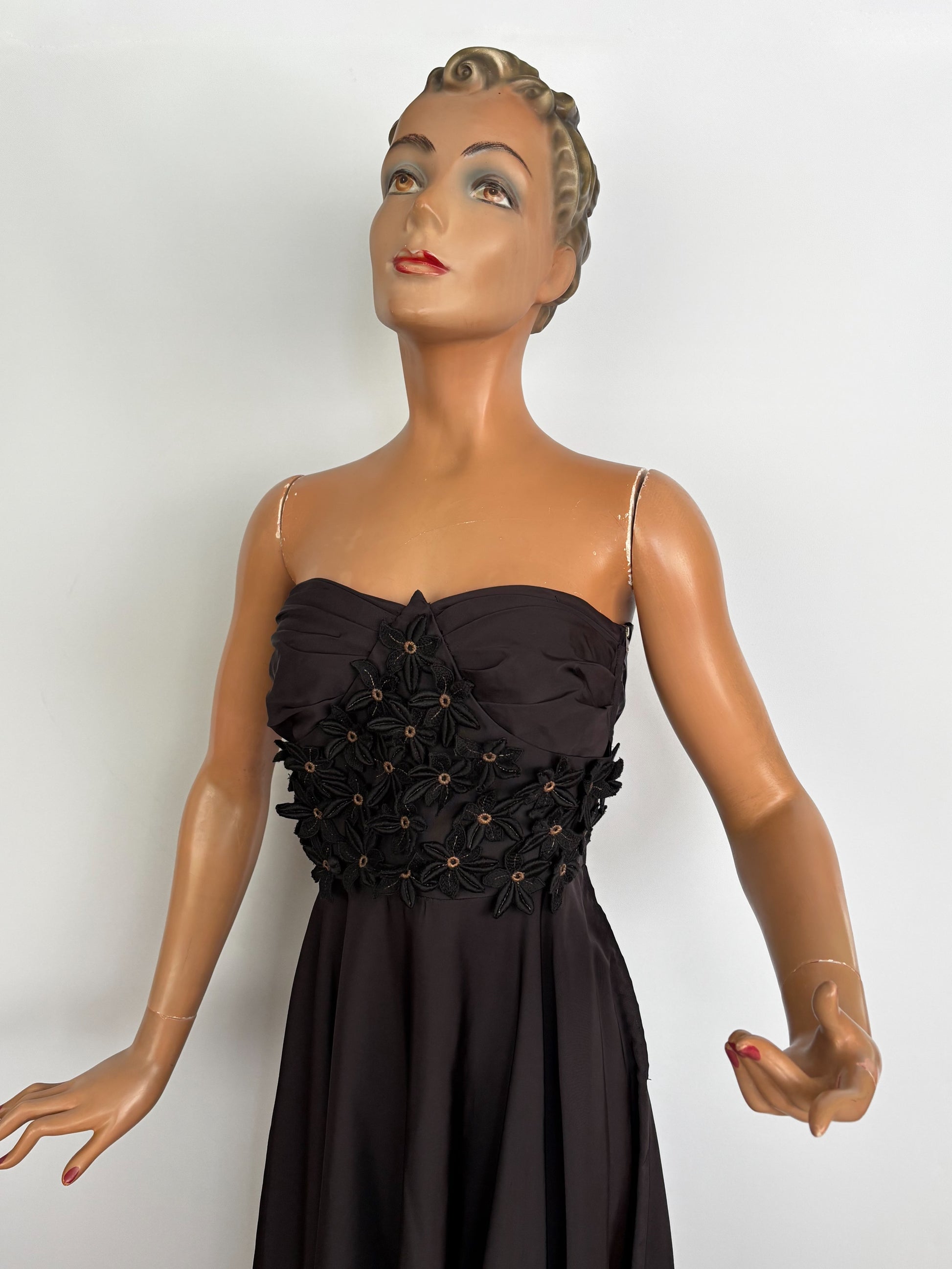 1950s strapless dress made from black taffeta with boned bodice and pleated bust section. The fabric is decorated with hand-applied floral appliqués made from satin ribbon with brown metallic thread details. The bodice has darts at the front and back and a pointed panel at the back.