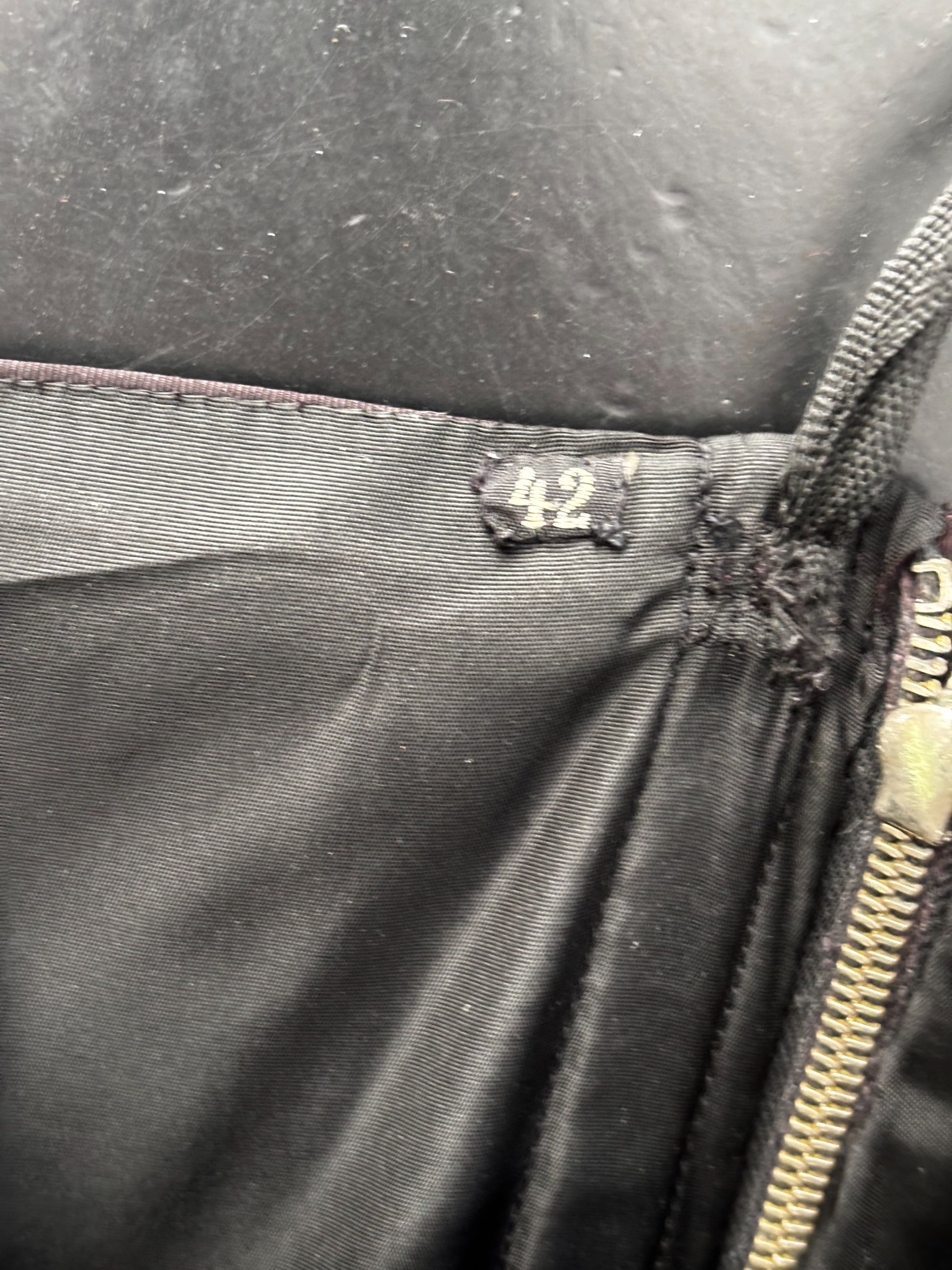 It closes at the side with a metal zipper. The skirt is a full circle and lined with black fabric. Inner structure includes metal boning and a reinforced bust section. Original size label 42 (fits a small).