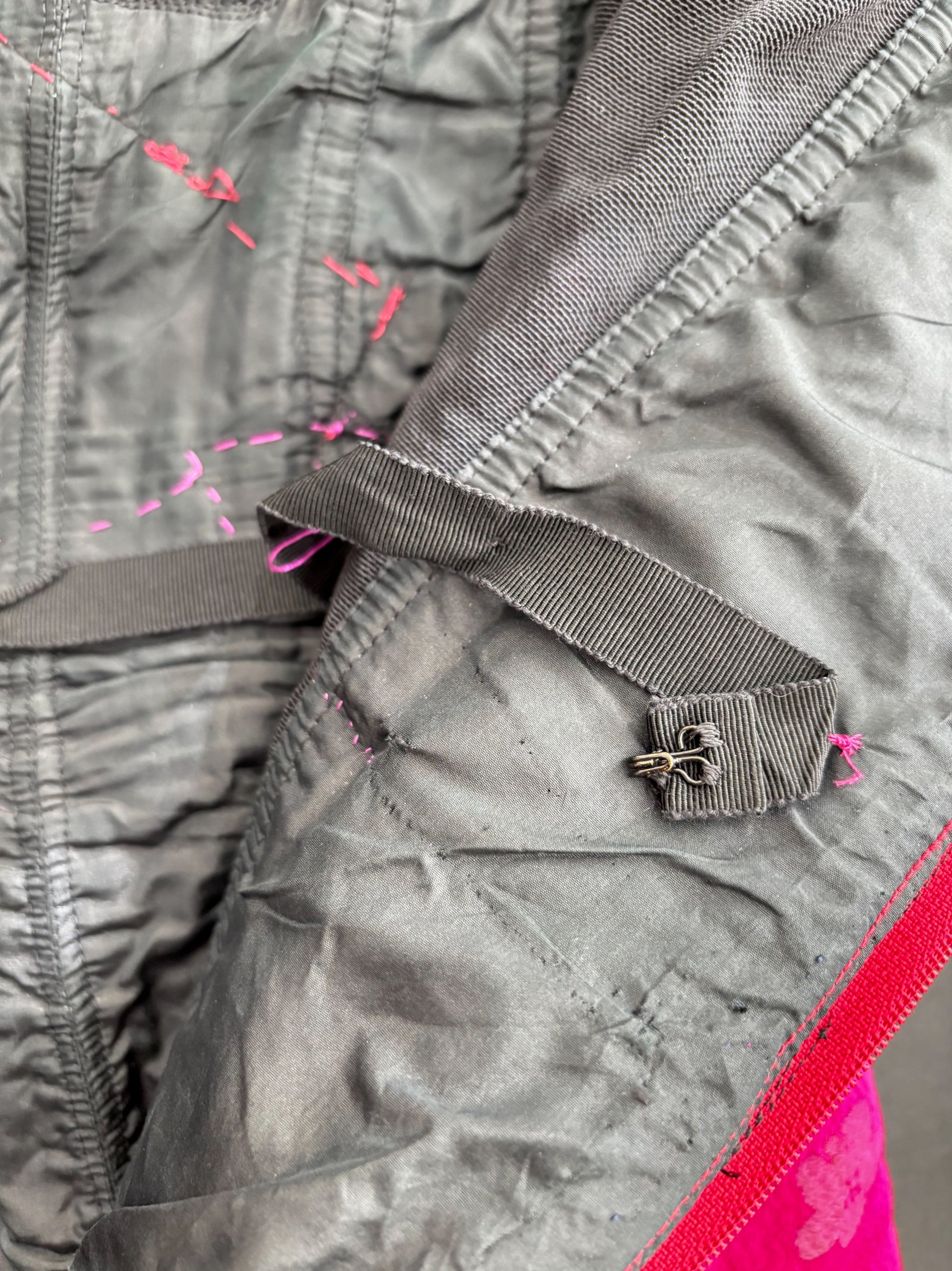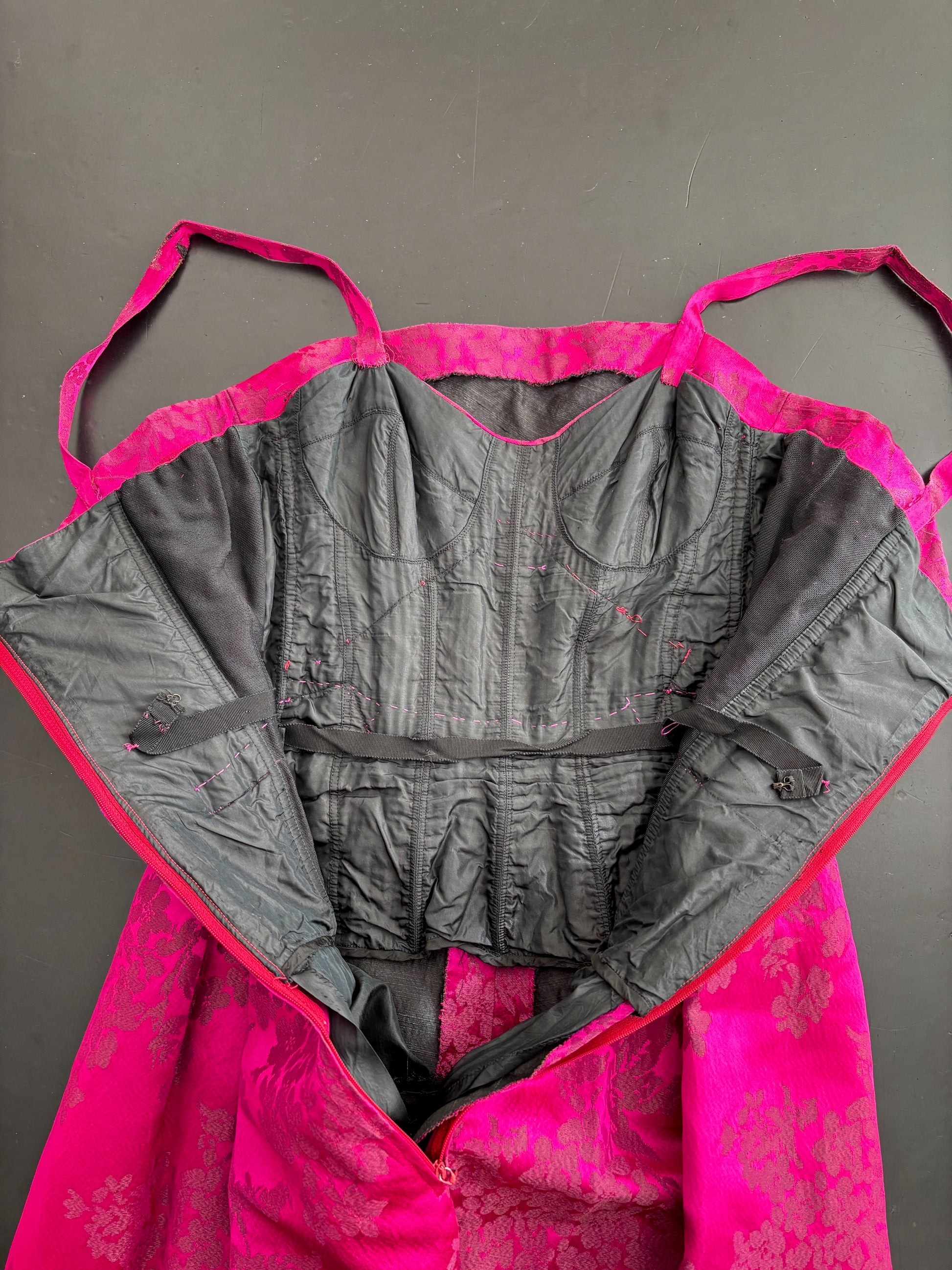 1950s evening dress made from heavy fuchsia brocade with woven floral pattern. The inner construction includes full metal boning and a built-in corset section with bust cups. The bodice has darts at the front and back and a stay band at the inner waist.