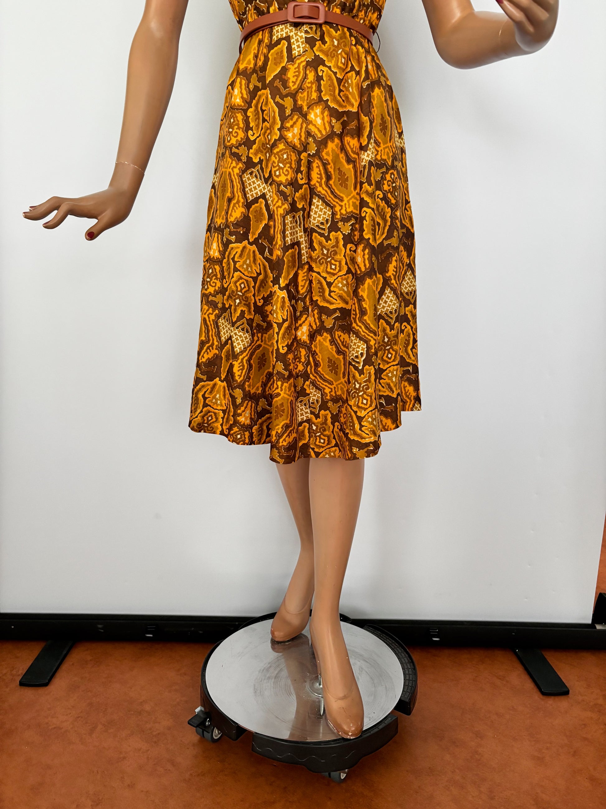 Vintage 1960s sleeveless dress made of silk with a printed batik-style pattern in shades of brown, mustard and yellow. The dress has a fitted bodice with darts at the bust and waist, and a full flared skirt cut in multiple panels. It closes with a zipper at the back. The skirt is lined. Belt loops, no belt.