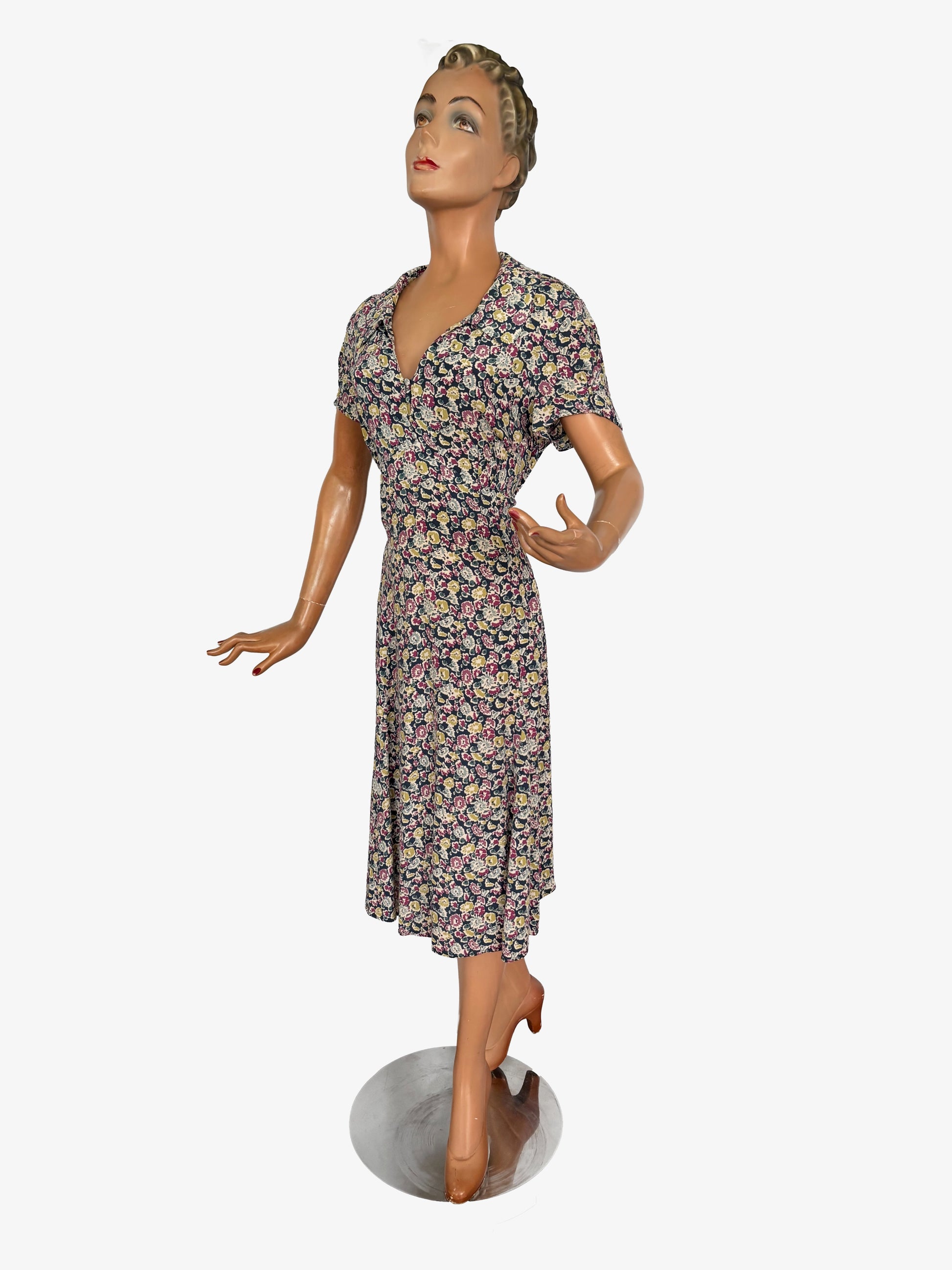 Rayon-crepe 1940s dress with multicolour floral print and a V-neck. Short sleeves with small pleats at the hem. No defined waist seam; shaping through darts under the bust. The skirt is panel-cut (6 panels). Modern side zipper set into the left side seam.