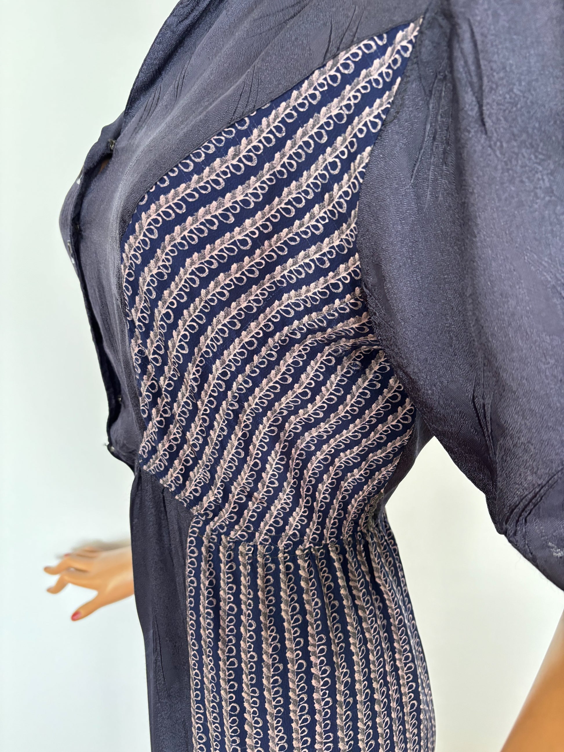 1940s day dress in navy blue fabric with a subtle woven swirl texture and contrasting striped panels at the sides and skirt hem. The bodice closes at the front with buttons down to the hip and has a hook-and-eye closure at the waist. It has a soft revere collar and short sleeves with gentle gathers at the shoulders. The skirt falls from the waist seam into a straight, lightly shaped silhouette. The striped panels add vertical structure and visual contrast typical of 1940s daywear. Home made.