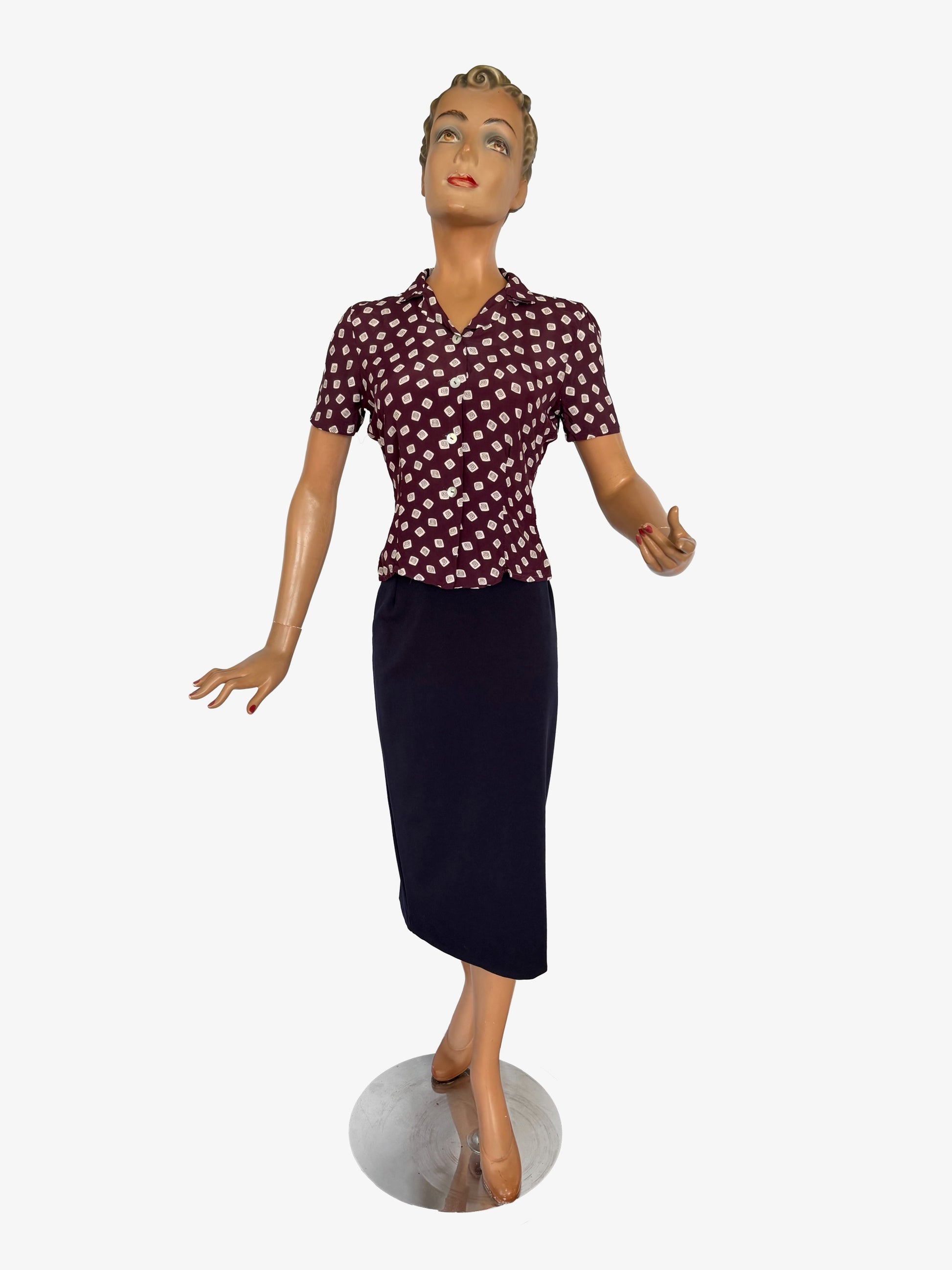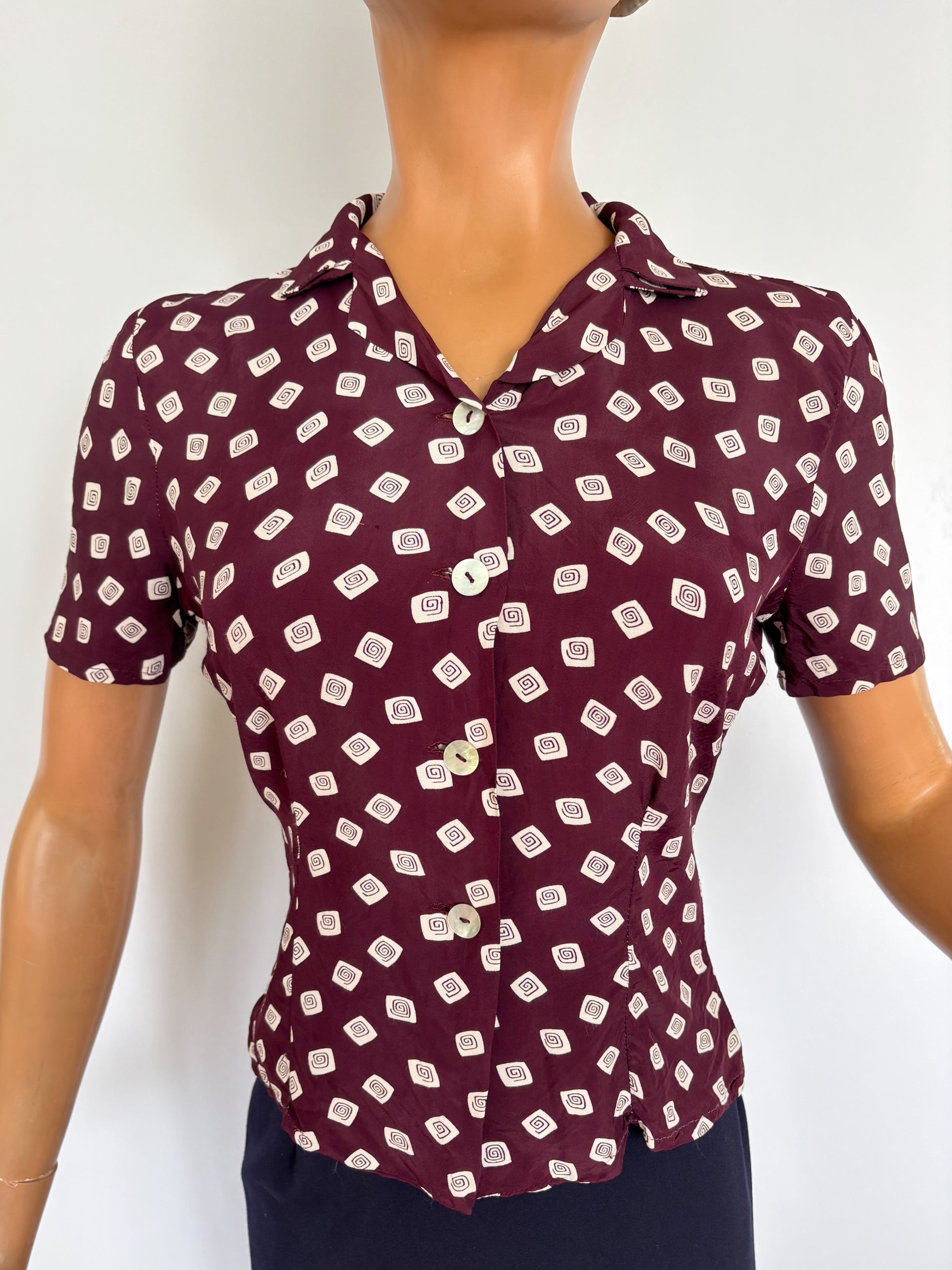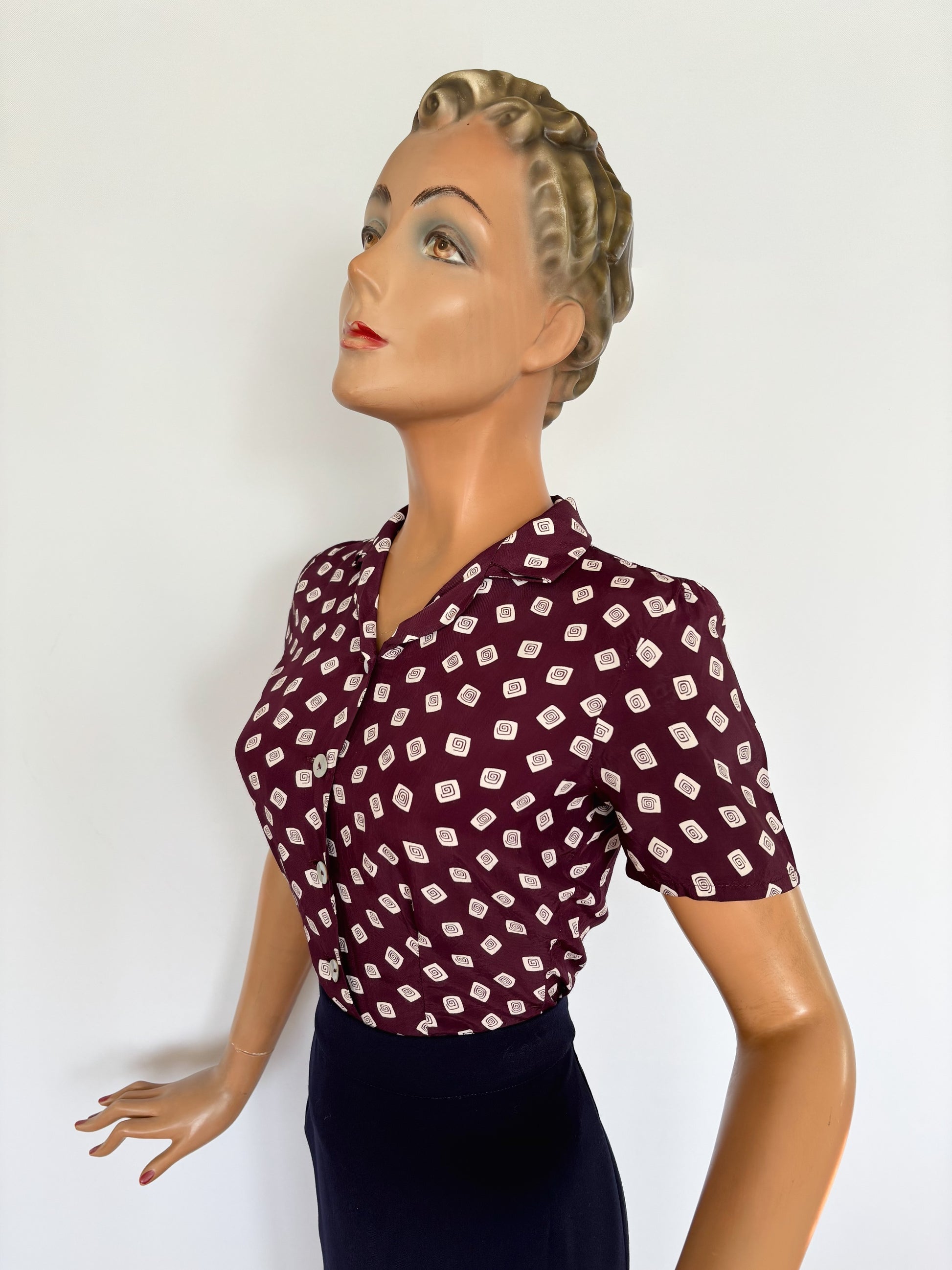 1940s-style blouse made from original vintage rayon fabric in a deep burgundy tone with a white geometric motif. The blouse has a classic revere collar, short sleeves, and a neat front closure with four mother-of-pearl buttons.