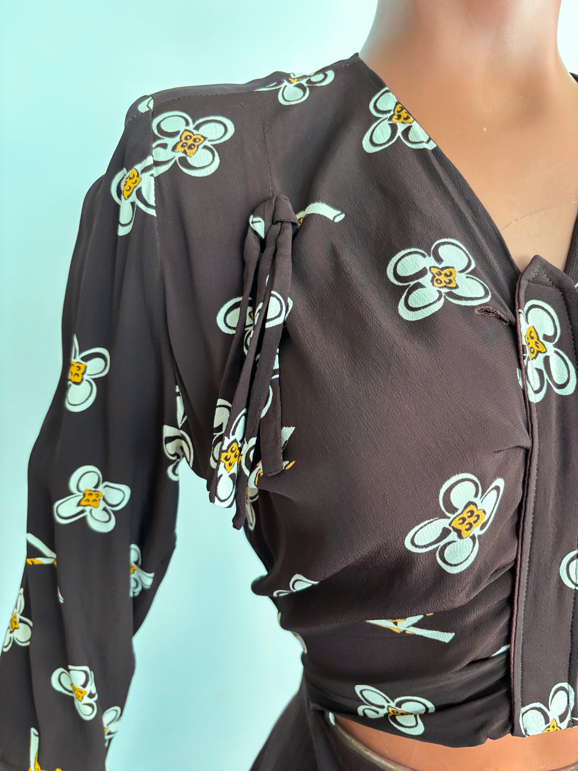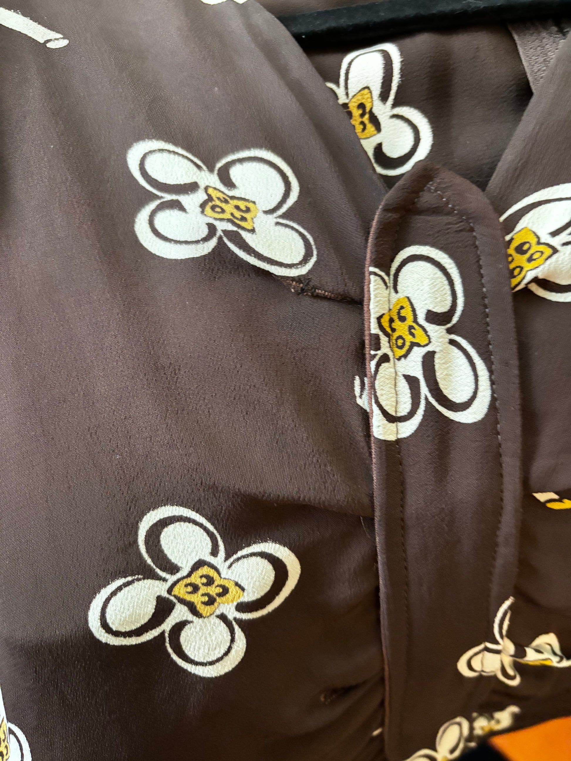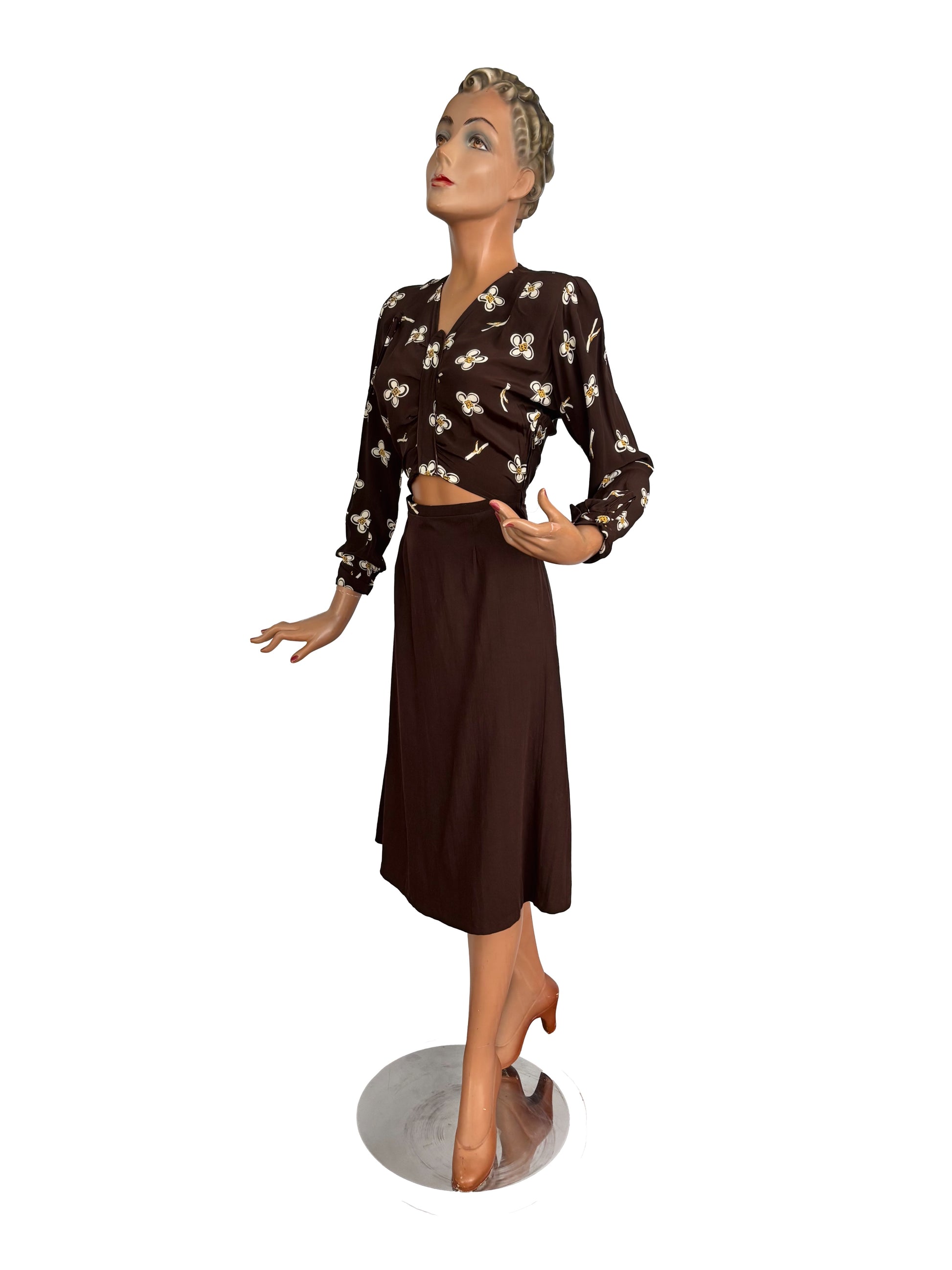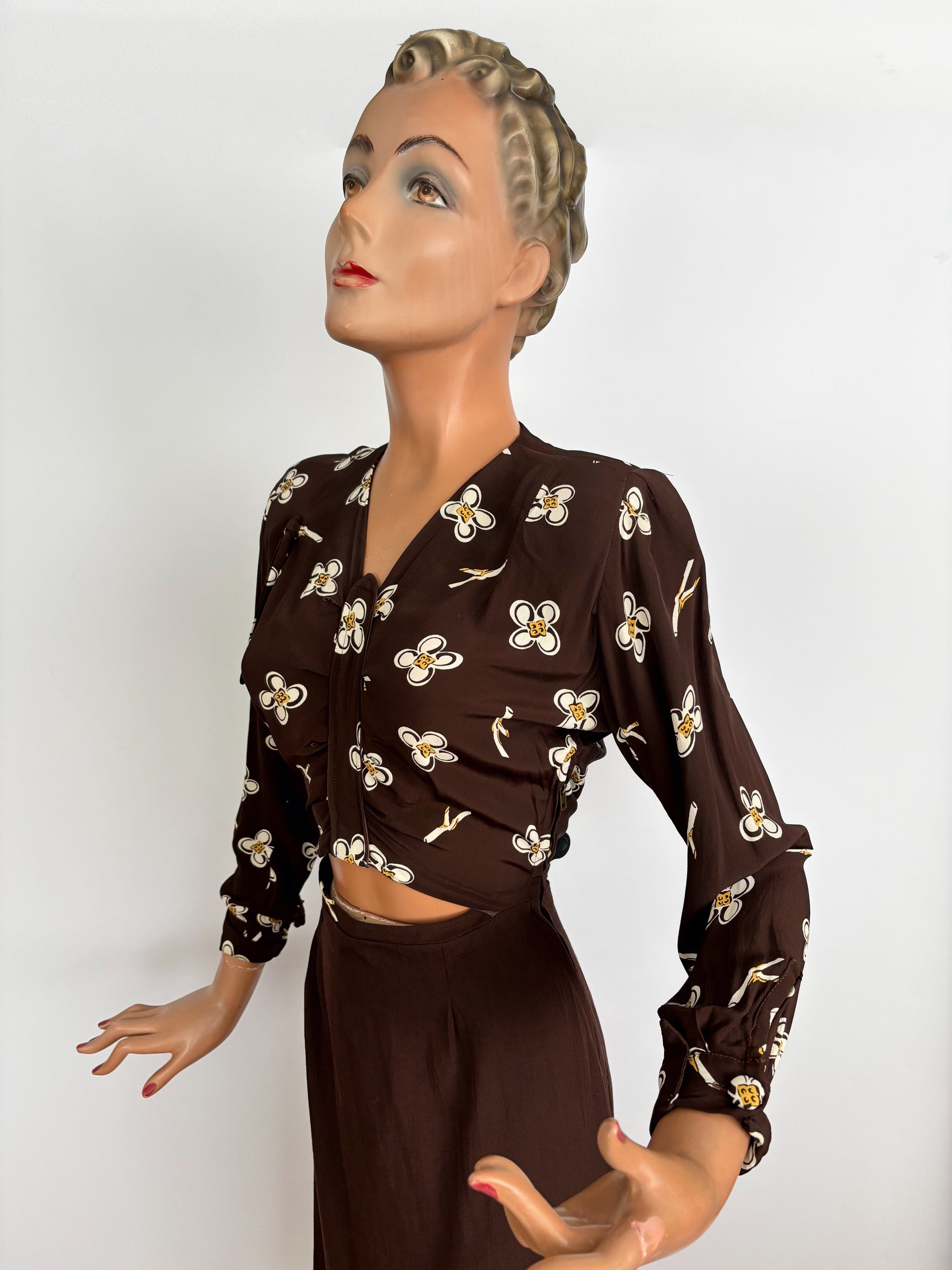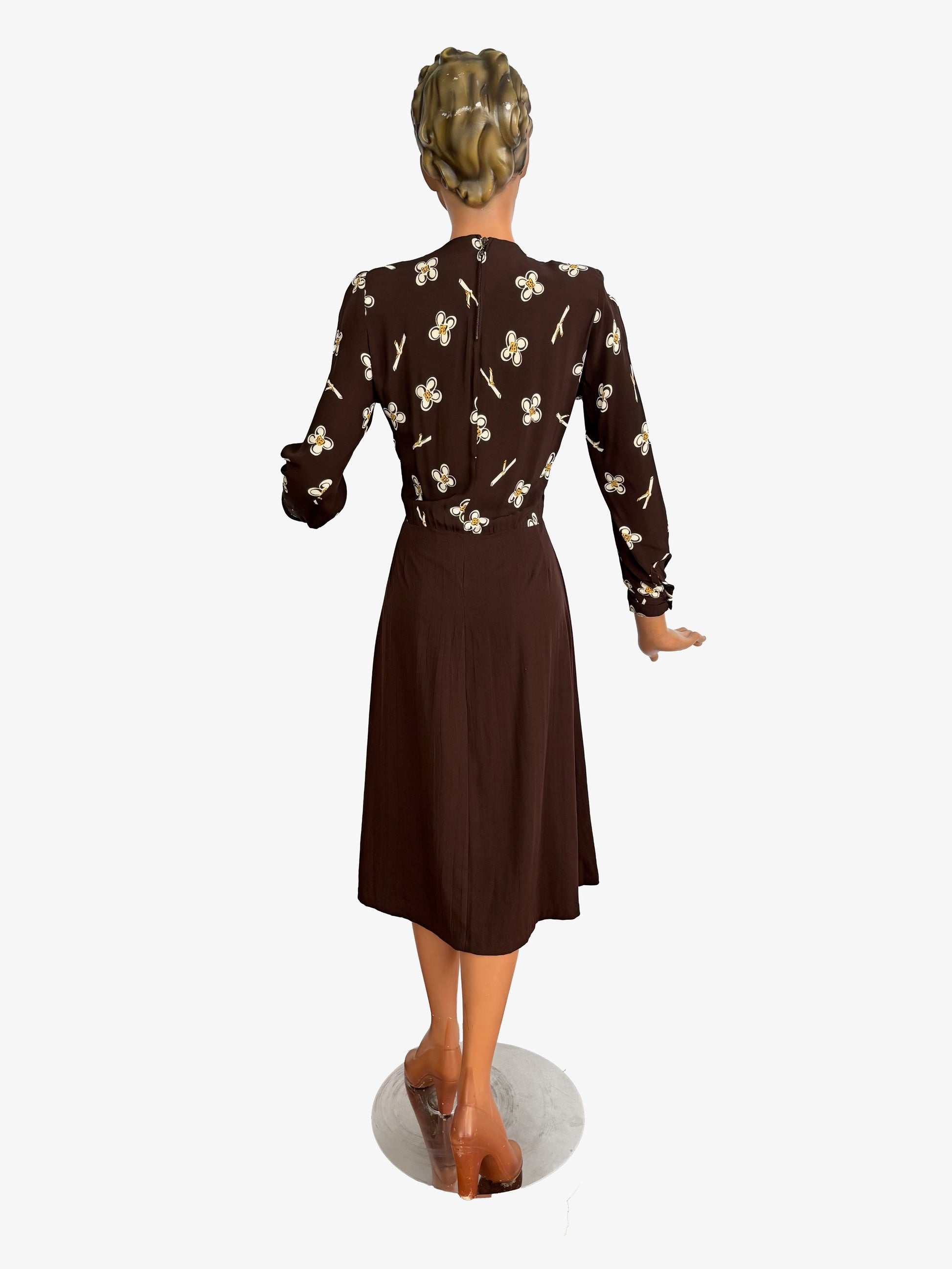 1950s style dress made from original vintage rayon fabric with a brown floral print. It has gathers at the shoulders, a fitted waist, and a softly flared skirt falling below the knee. The front originally had a button fastening, later adapted to the current design — a small trace of one buttonhole remains. Metal zipper at the side and back. Long sleeves with cuffs and a fabric-covered button.