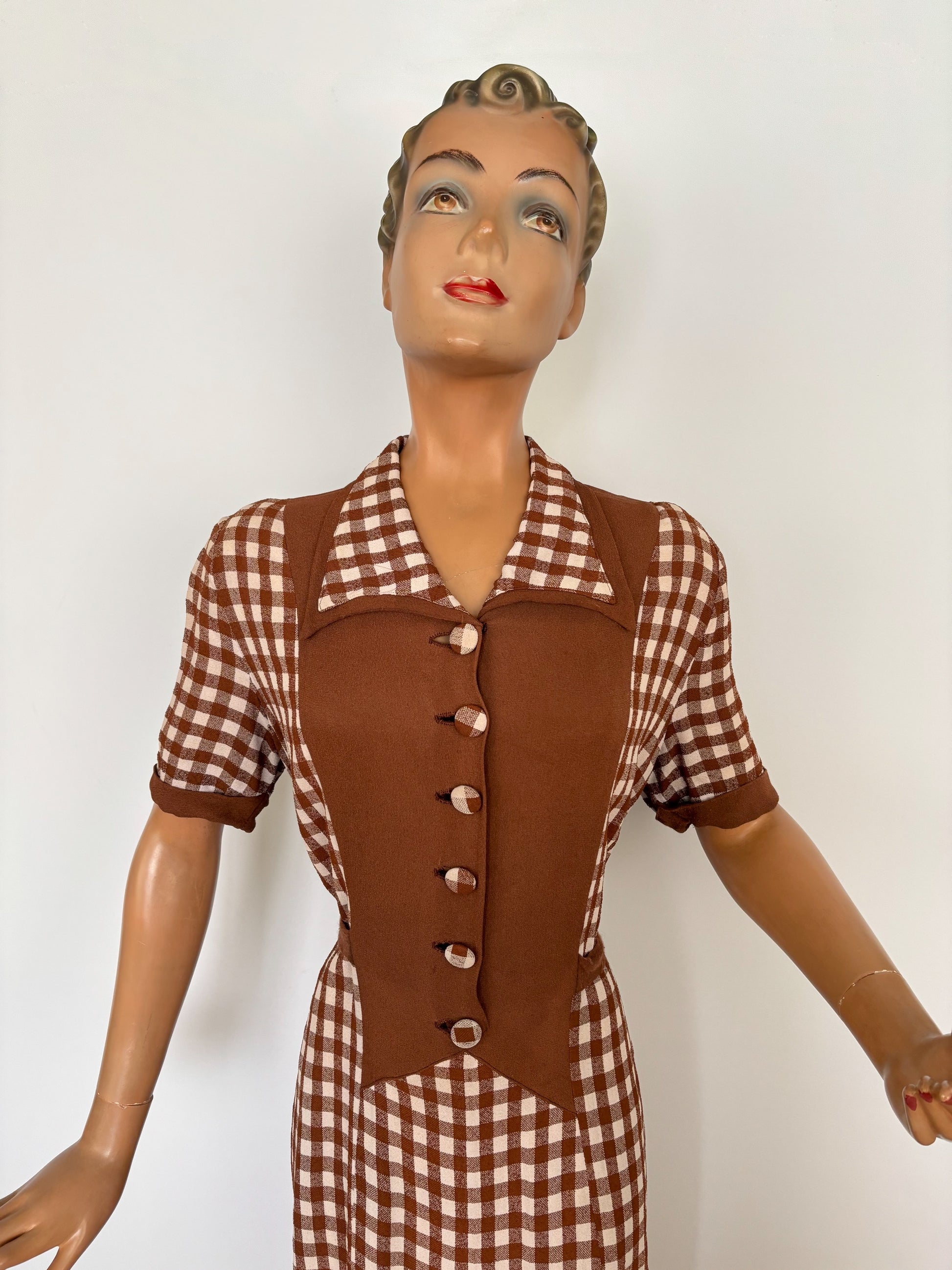 Late 1930s/early 1940s wool day dress in brown and white gingham with a contrasting brown inset front panel. The dress has a flat collar, short sleeves with turned cuffs, and six fabric-covered buttons at the front. The waist is defined with a fixed belt in matching fabric and buckle. Shoulder pads are present, and the skirt is constructed in six panels.