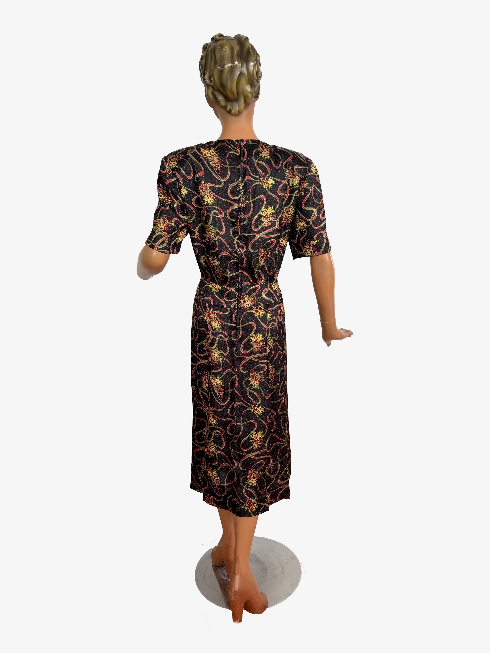 A later vintage dress with a 1940s-inspired look in a silky black fabric with a polyester feel. The fabric has red dots, floral sprays and scrolling lines, with a subtle textured dot pattern. It has a round neckline, short sleeves with stitched pleat detail at the sleeve head, and wide shoulders with large shoulder pads. The front bodice has stitched pleat detailing. From the waist down there is a smooth hip section of about 6,5 cm, with extra pleats at the sides at both front and back. It closes with a long zipper at the back.