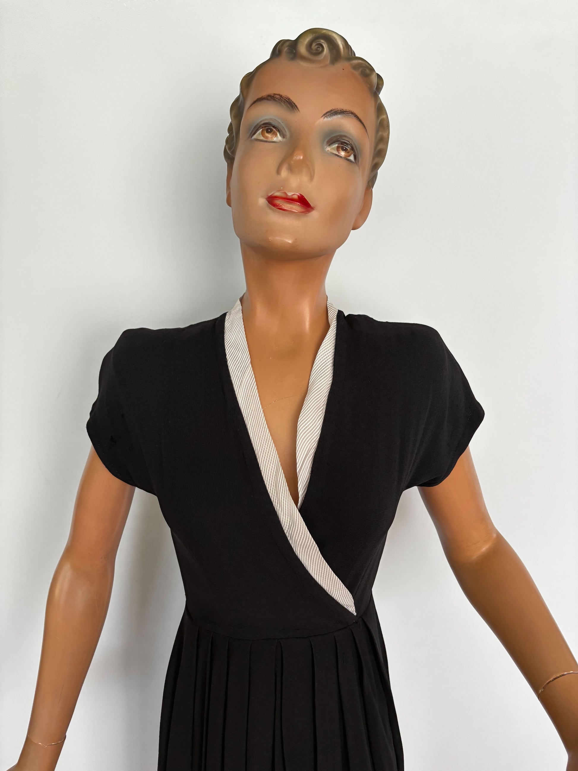 Black rayon-crepe 1940s dress with a V-neck and white organza trim along the neckline (not very well pressed, sorry). The dress has short sleeves and large shoulder pads. It closes with a metal side zipper and has belt loops, no belt.