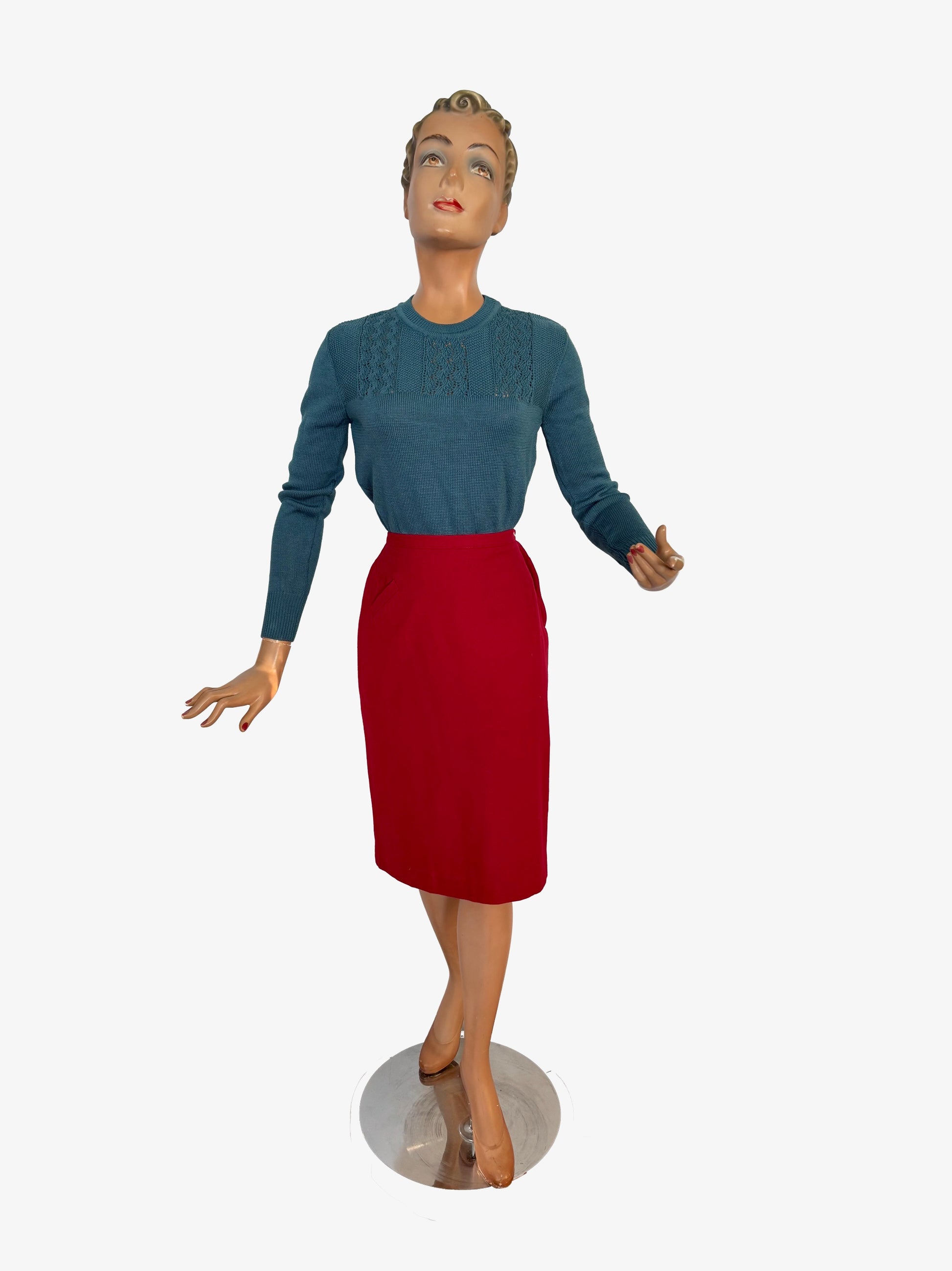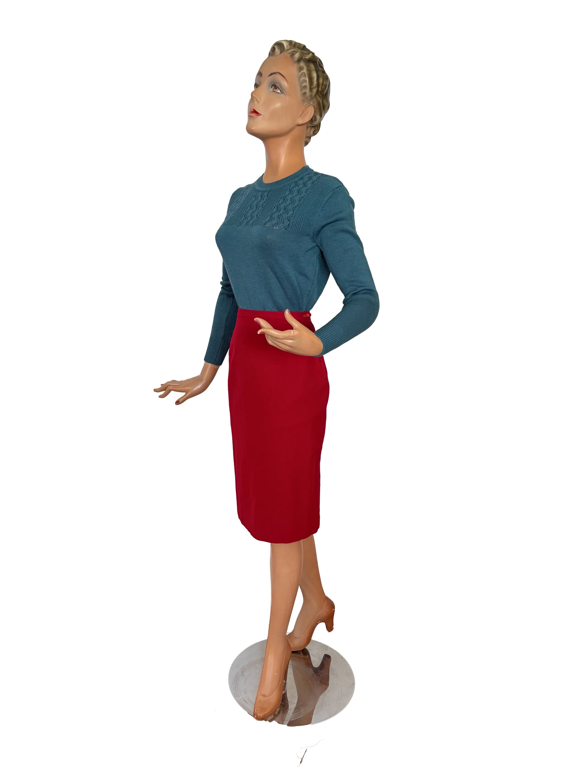 1950s straight wool pencil skirt in a deep red shade. The skirt has a narrow waistband and is shaped with darts at the front and back. One small pocket on the right front. It closes with a metal side zipper. The back slit is finished with small arrow tacks. Fully lined.